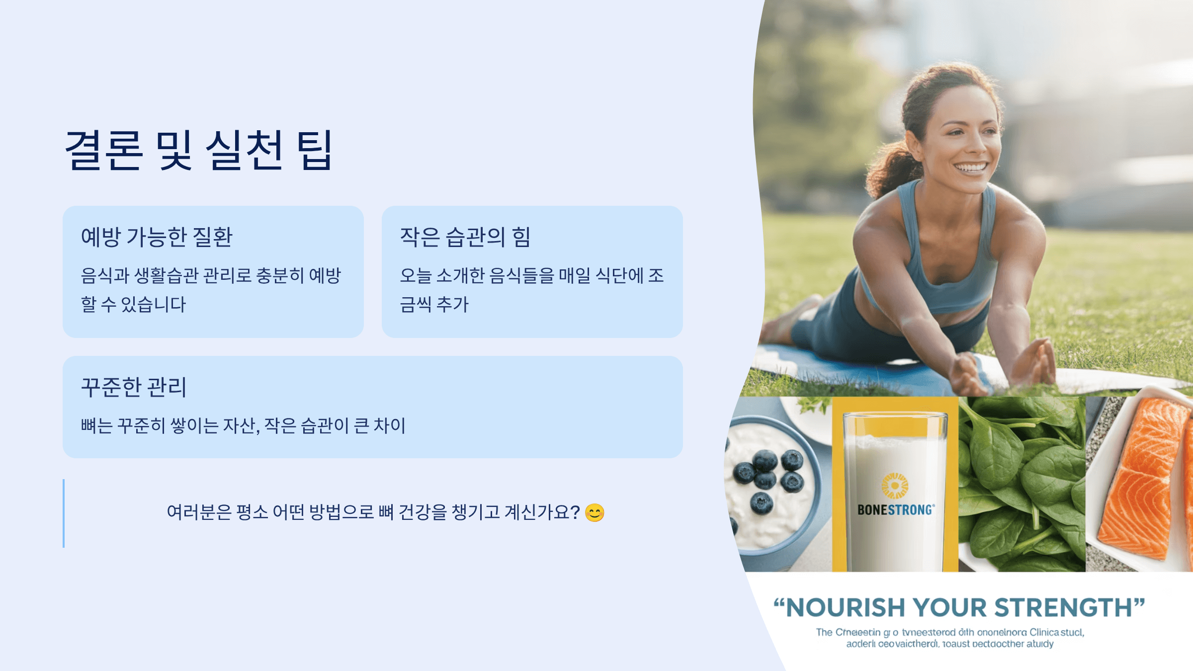 작은 식습관 변화가 골다공증 예방과 뼈 건강 강화에 큰 차이를 만들어 줍니다! 🦴✨