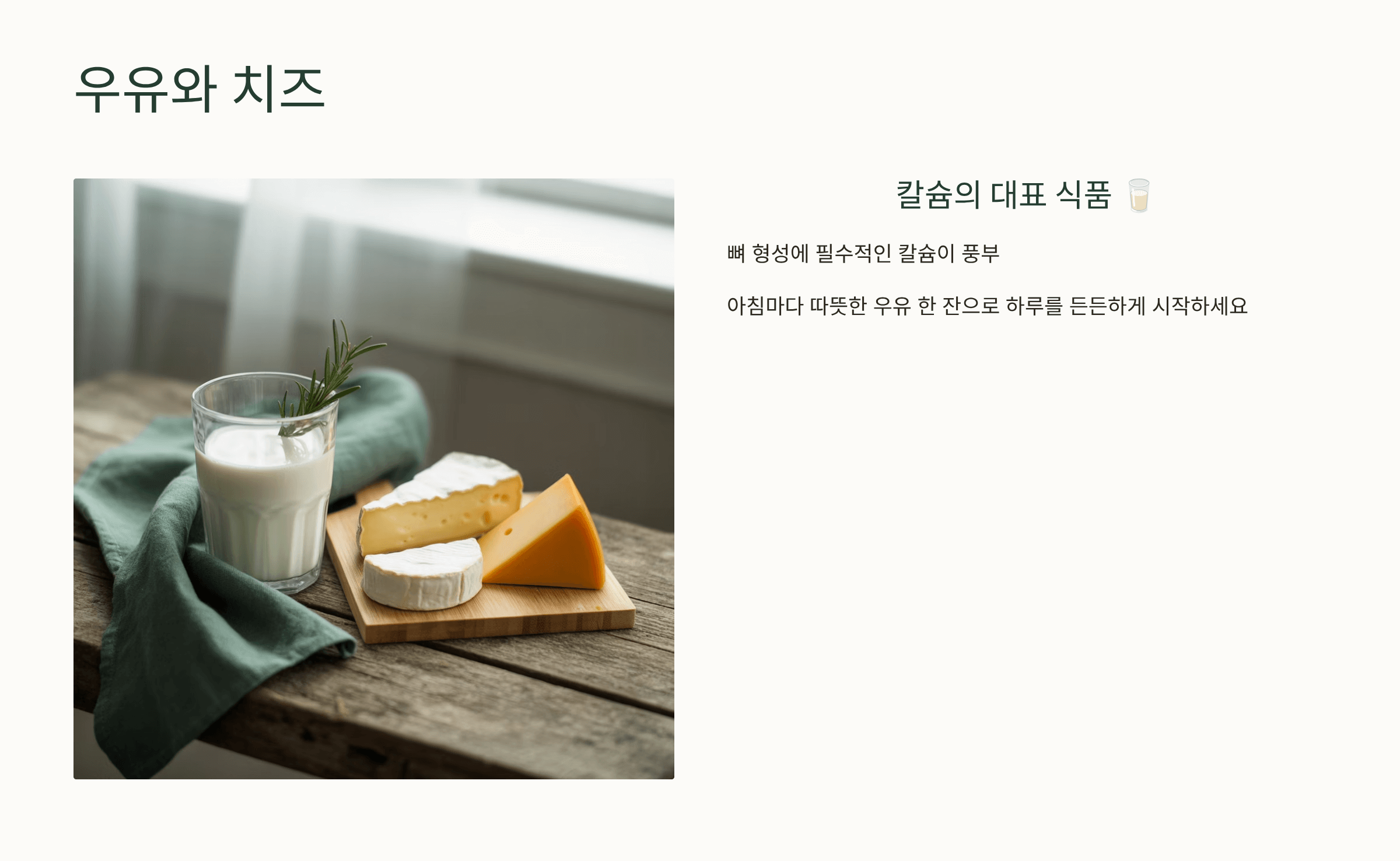 칼슘의 대표 식품으로 뼈 형성에 필수적입니다. 🥛