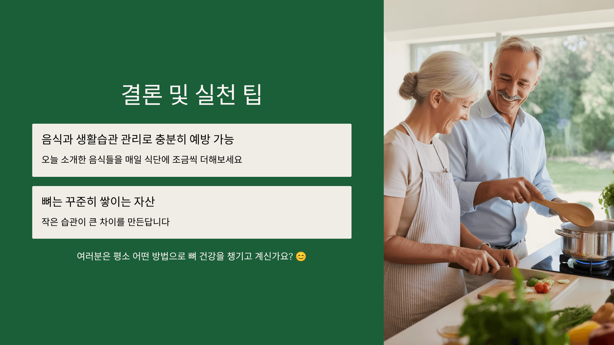 여러분은 평소 어떤 방법으로 뼈 건강을 챙기고 계신가요? 혹시 효과 본 음식이나 운동법이 있다면 댓글로 함께 공유해 주세요!