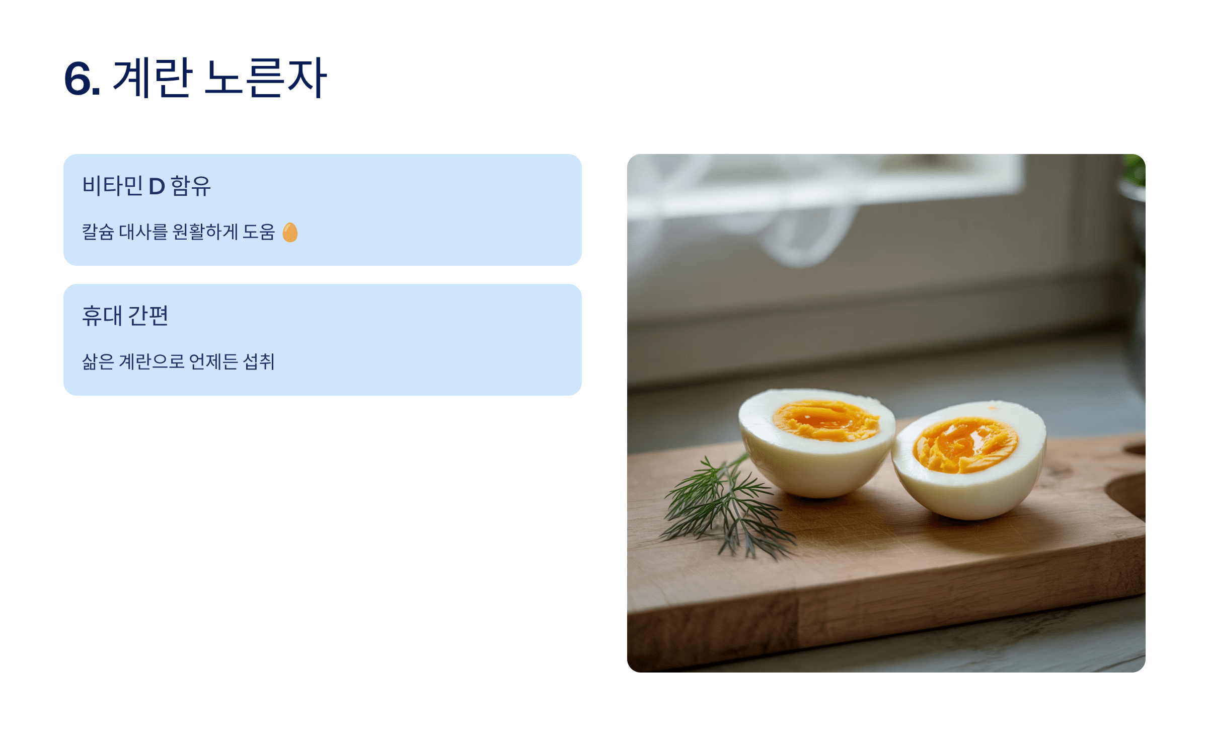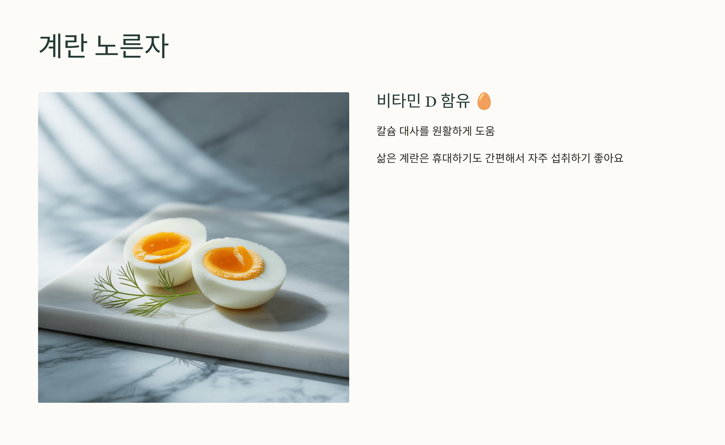 비타민 D가 들어 있어 칼슘 대사를 원활하게 합니다. 🥚