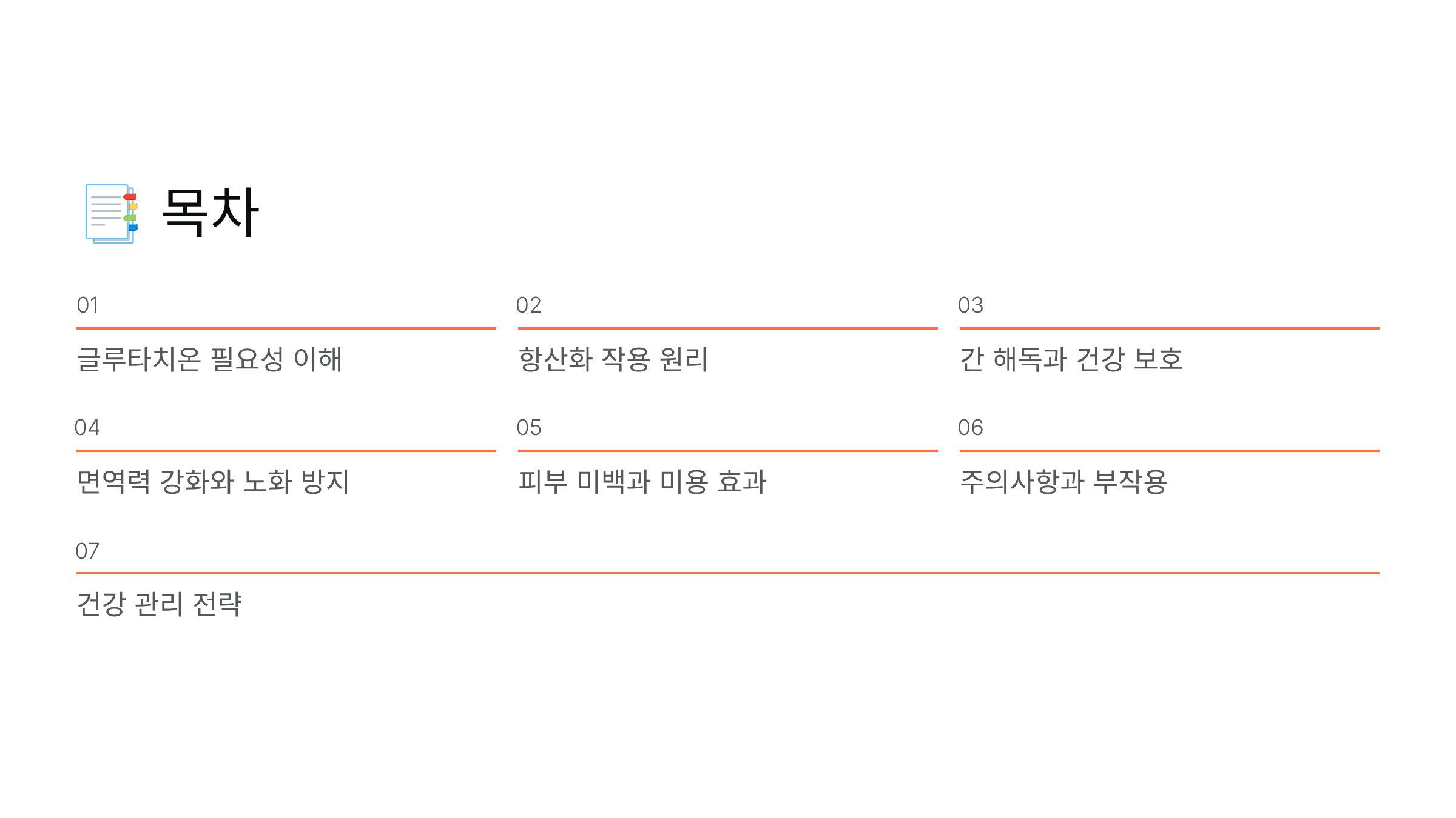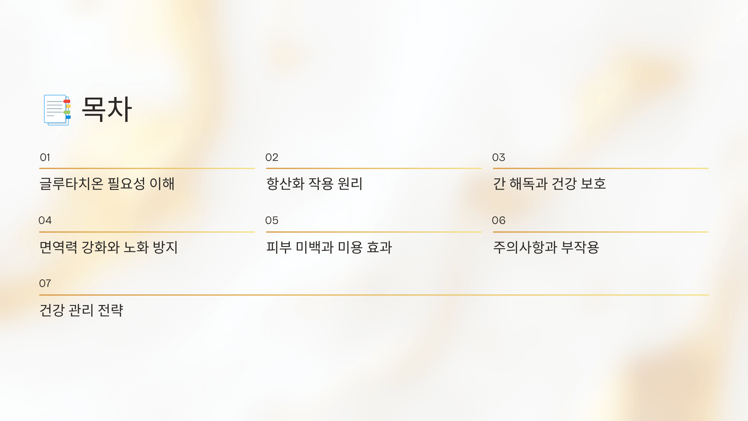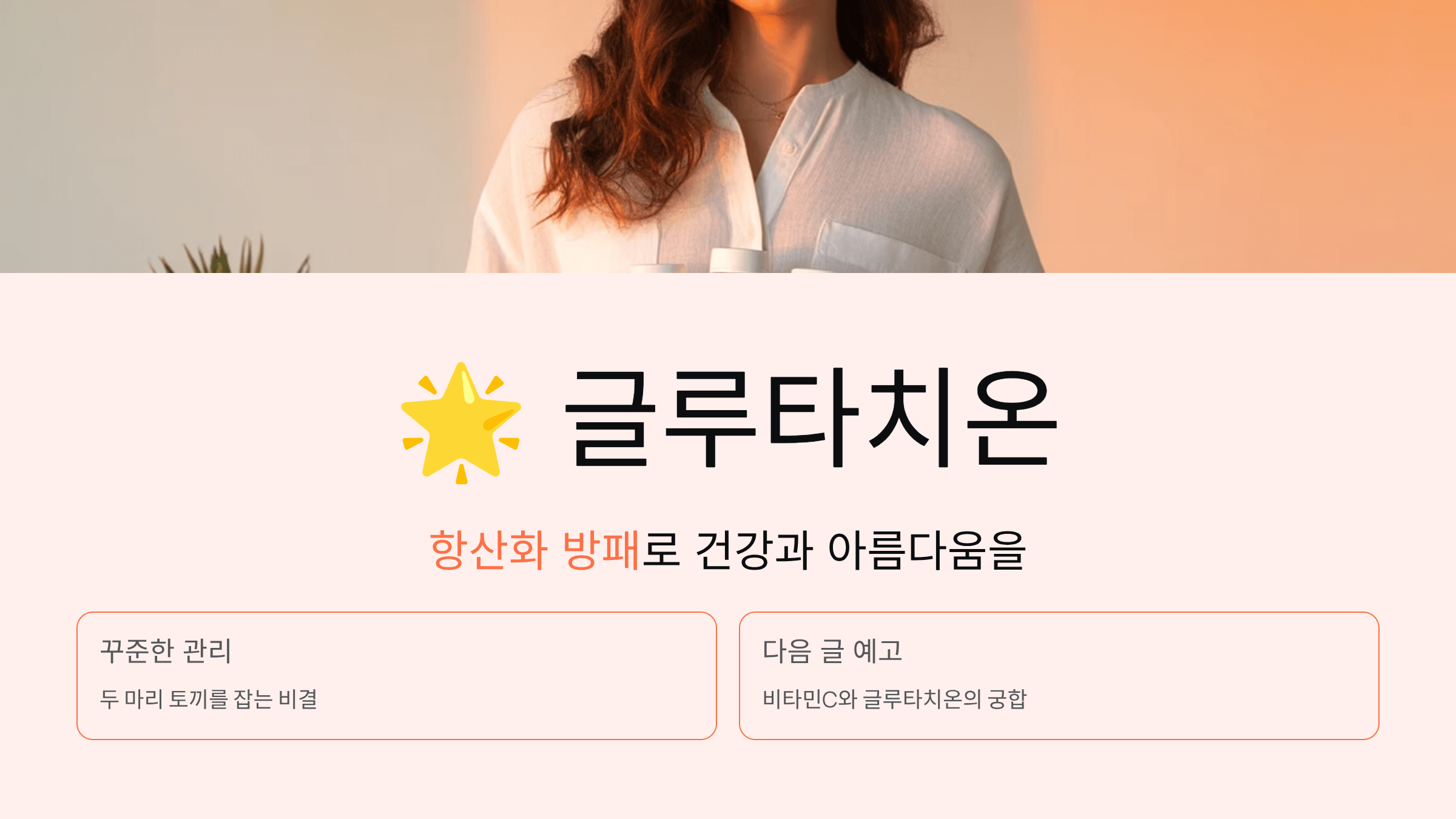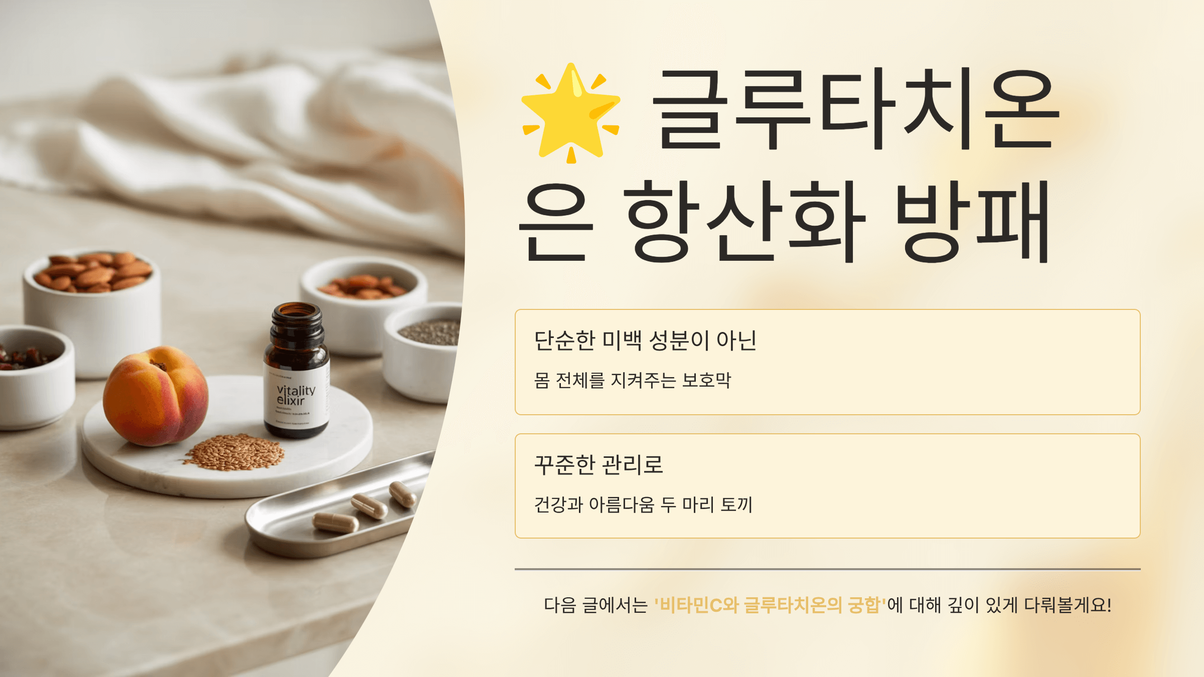 🌟 글루타치온은 단순히 피부 미백 성분이 아니라, 우리 몸 전체를 지켜주는 ‘항산화 방패’입니다. 꾸준히 관리하면 건강과 아름다움, 두 마리 토끼를 잡을 수 있답니다. 다음 글에서는 ‘비타민C와 글루타치온의 궁합’에 대해 깊이 있게 다뤄볼게요!