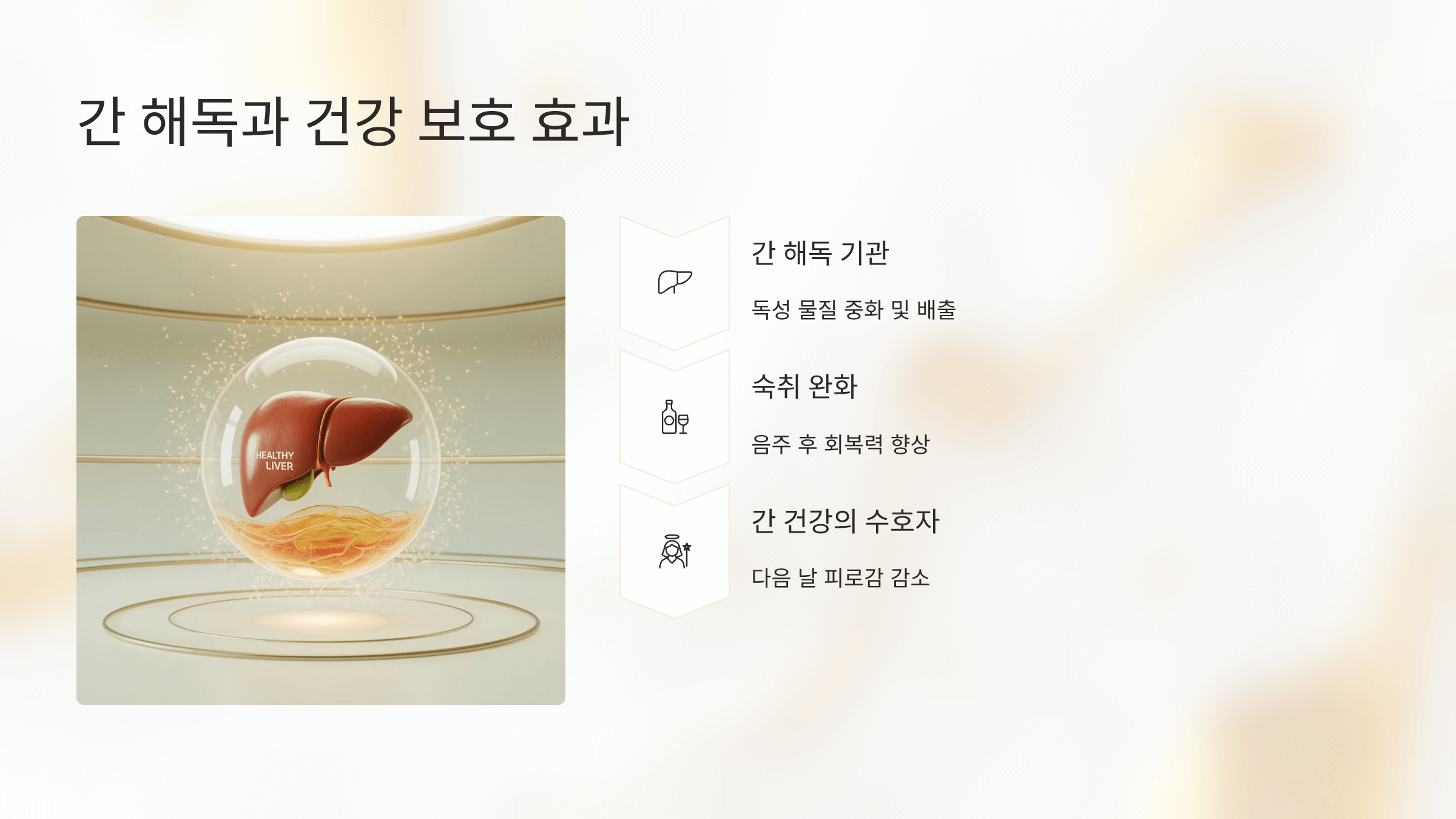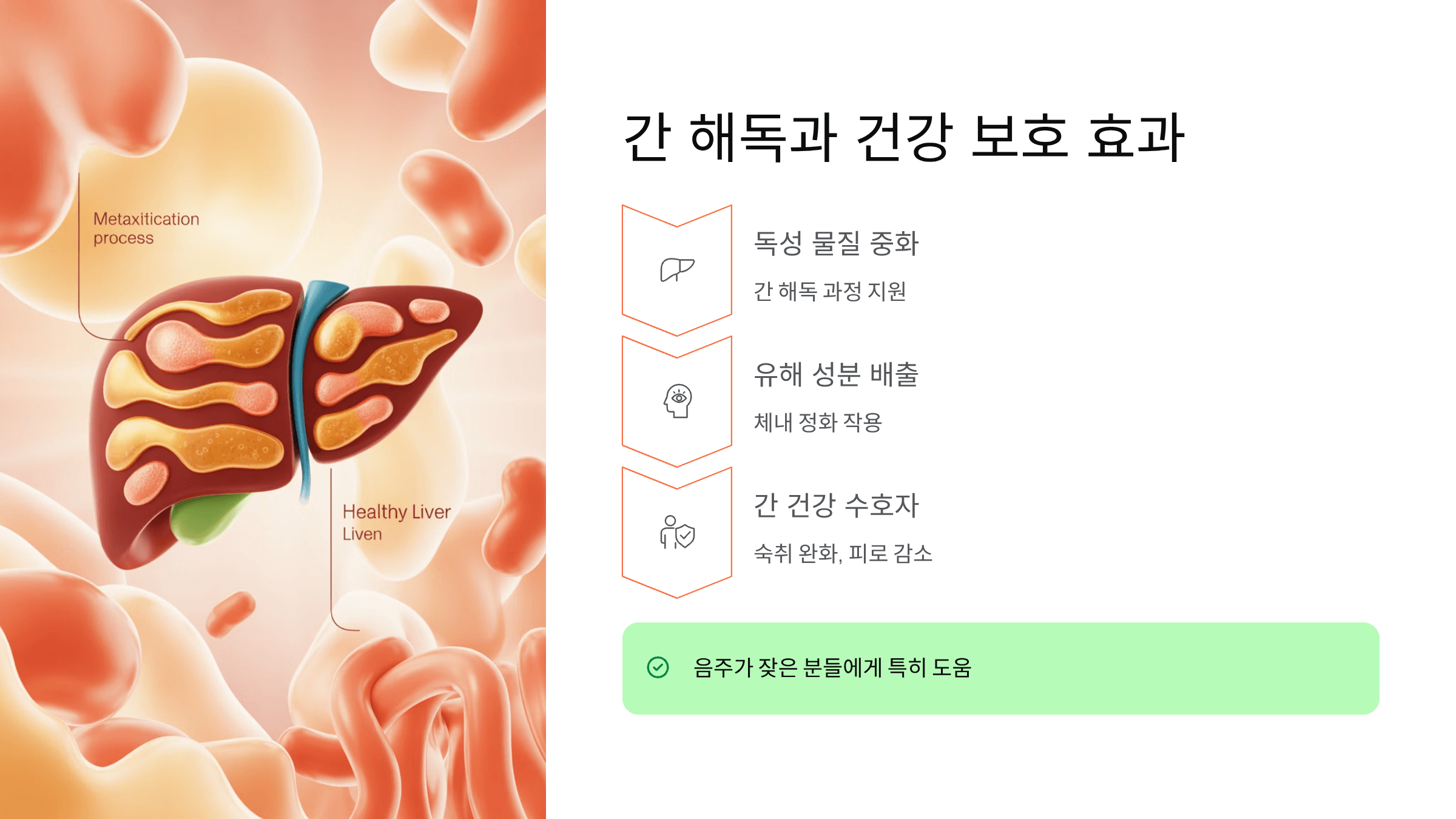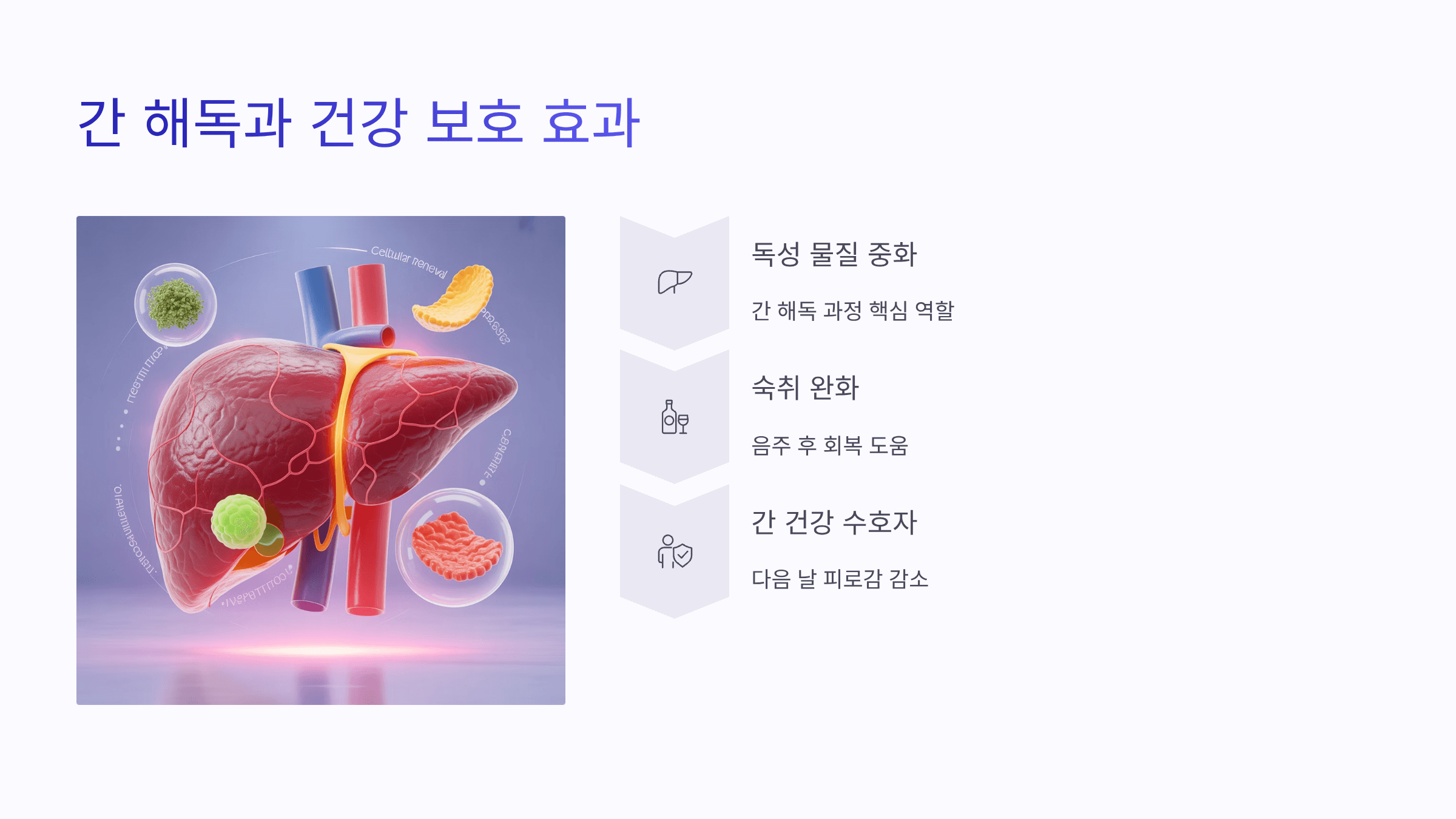 간 해독 과정에서 중요한 역할을 하기 때문에, 간 건강 관리에는 매우 중요한 성분입니다.