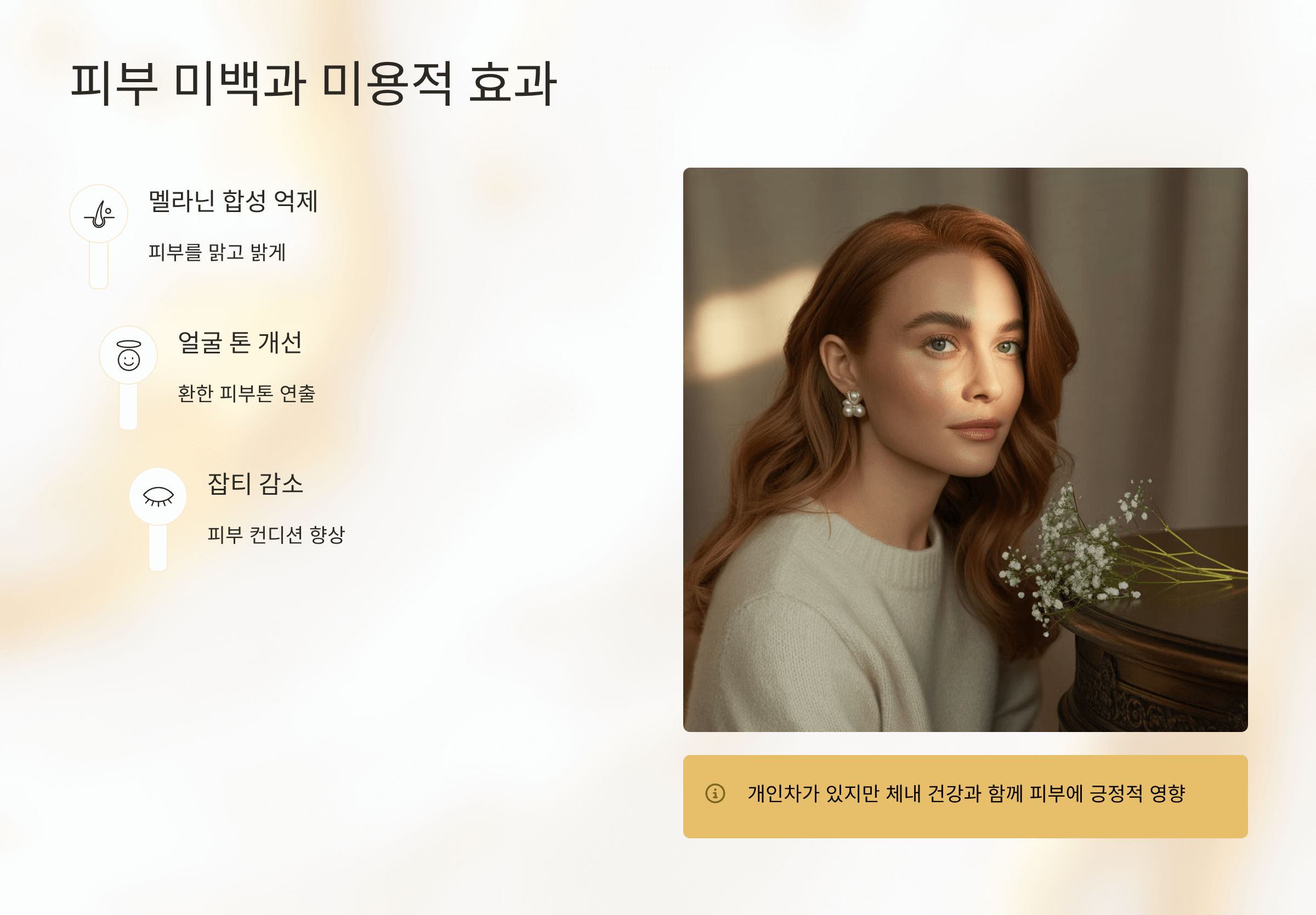 개인차가 있지만, 멜라닌 억제 효과로 인해 피부 톤 개선에 도움을 줄 수 있습니다.