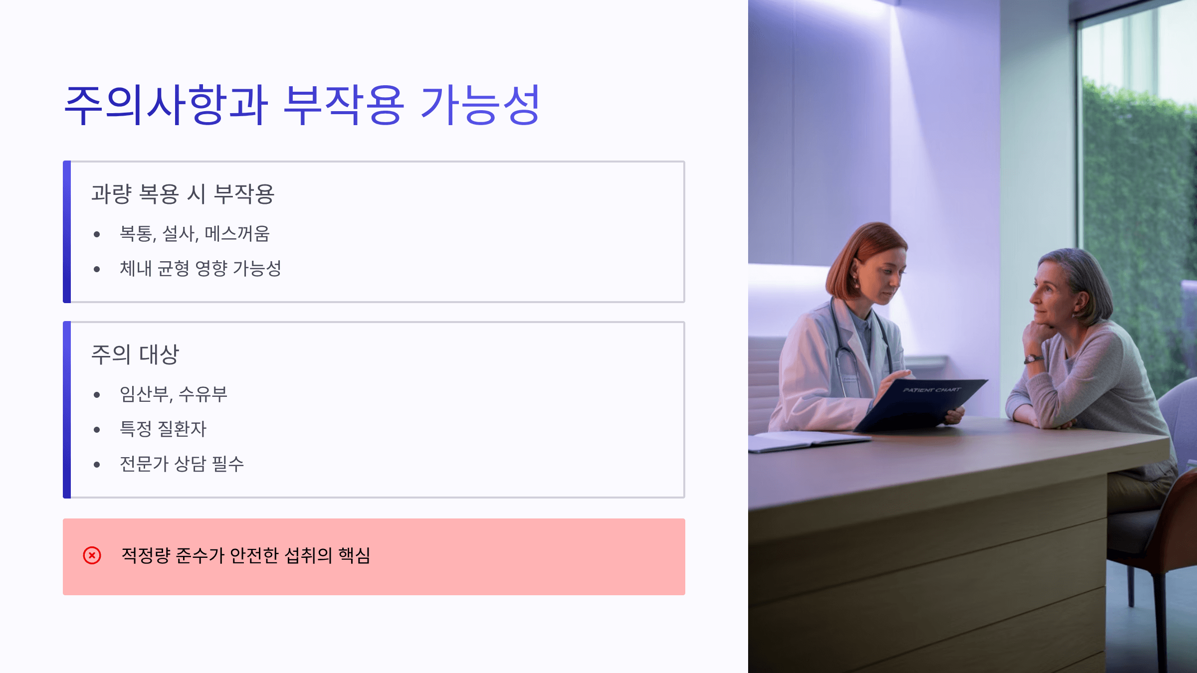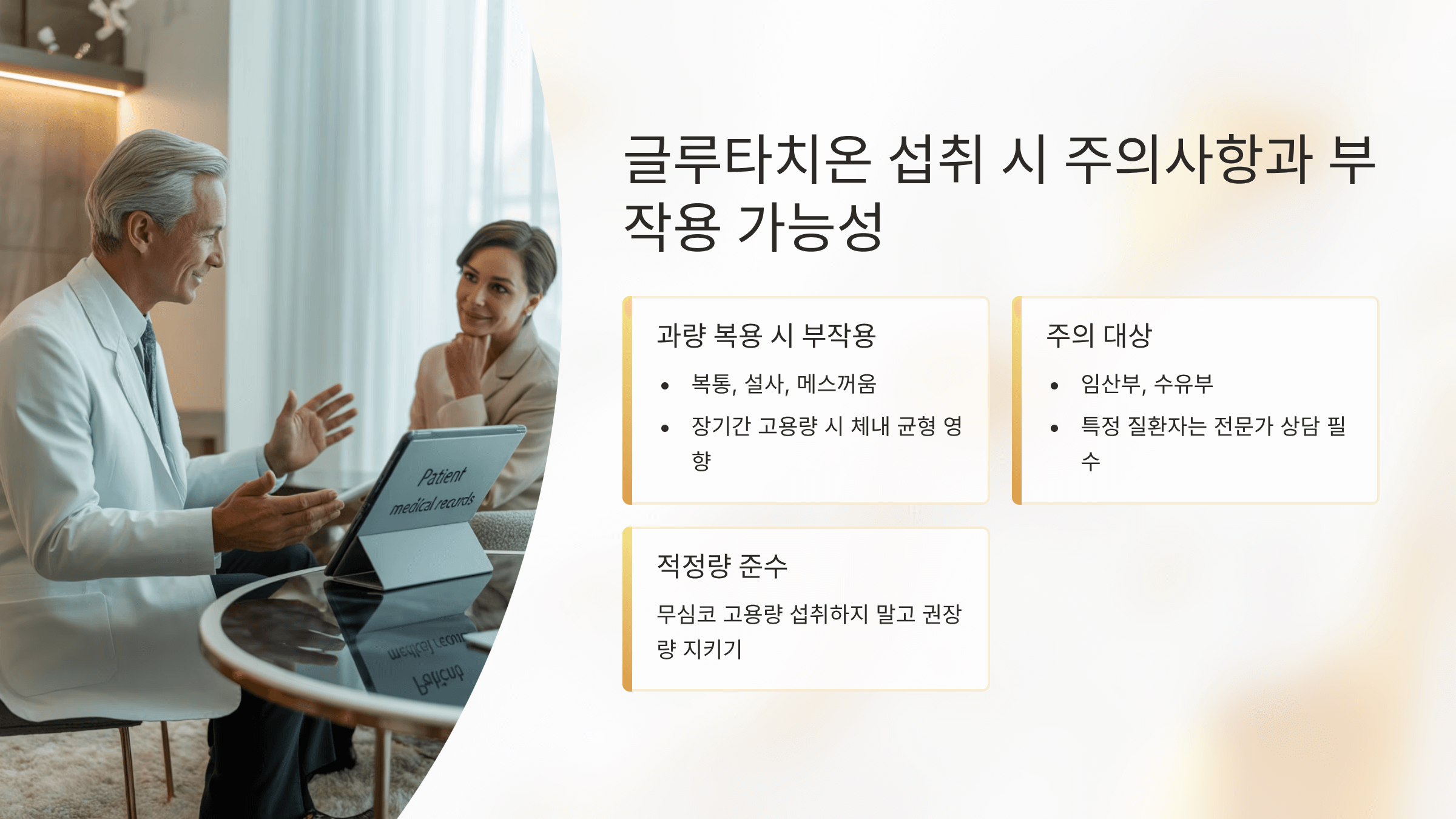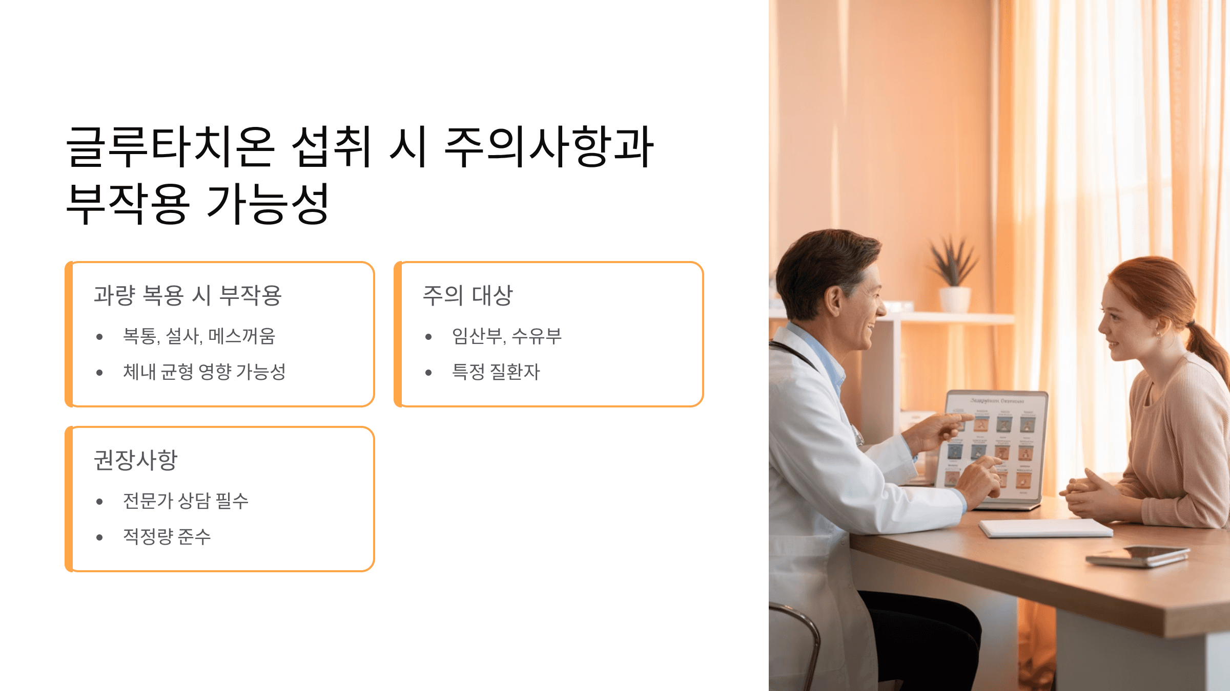 글루타치온은 비교적 안전한 성분으로 알려져 있지만, 과량 복용 시 복통, 설사, 메스꺼움 등이 나타날 수 있습니다. 또 일부 연구에서는 장기간 고용량 섭취 시 체내 균형에 영향을 줄 수 있다고 하니 주의가 필요합니다. 임산부, 수유부, 특정 질환을 가진 분들은 반드시 전문가 상담 후 섭취하는 것이 좋습니다. 저도 처음에는 무심코 고용량을 섭취했다가 속이 불편했던 경험이 있어, 지금은 적정량을 지키고 있습니다.
