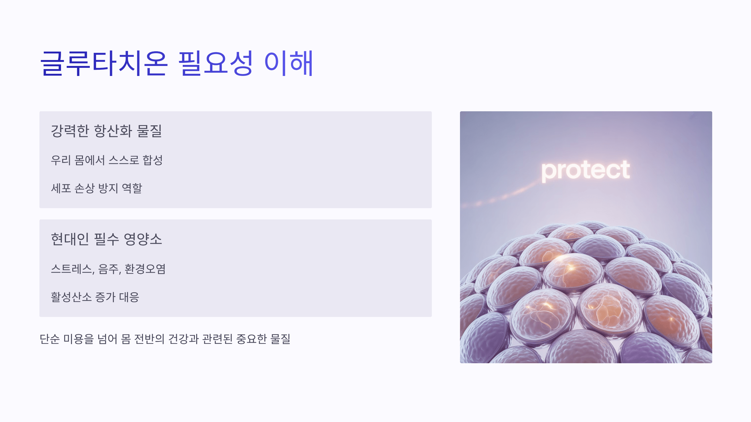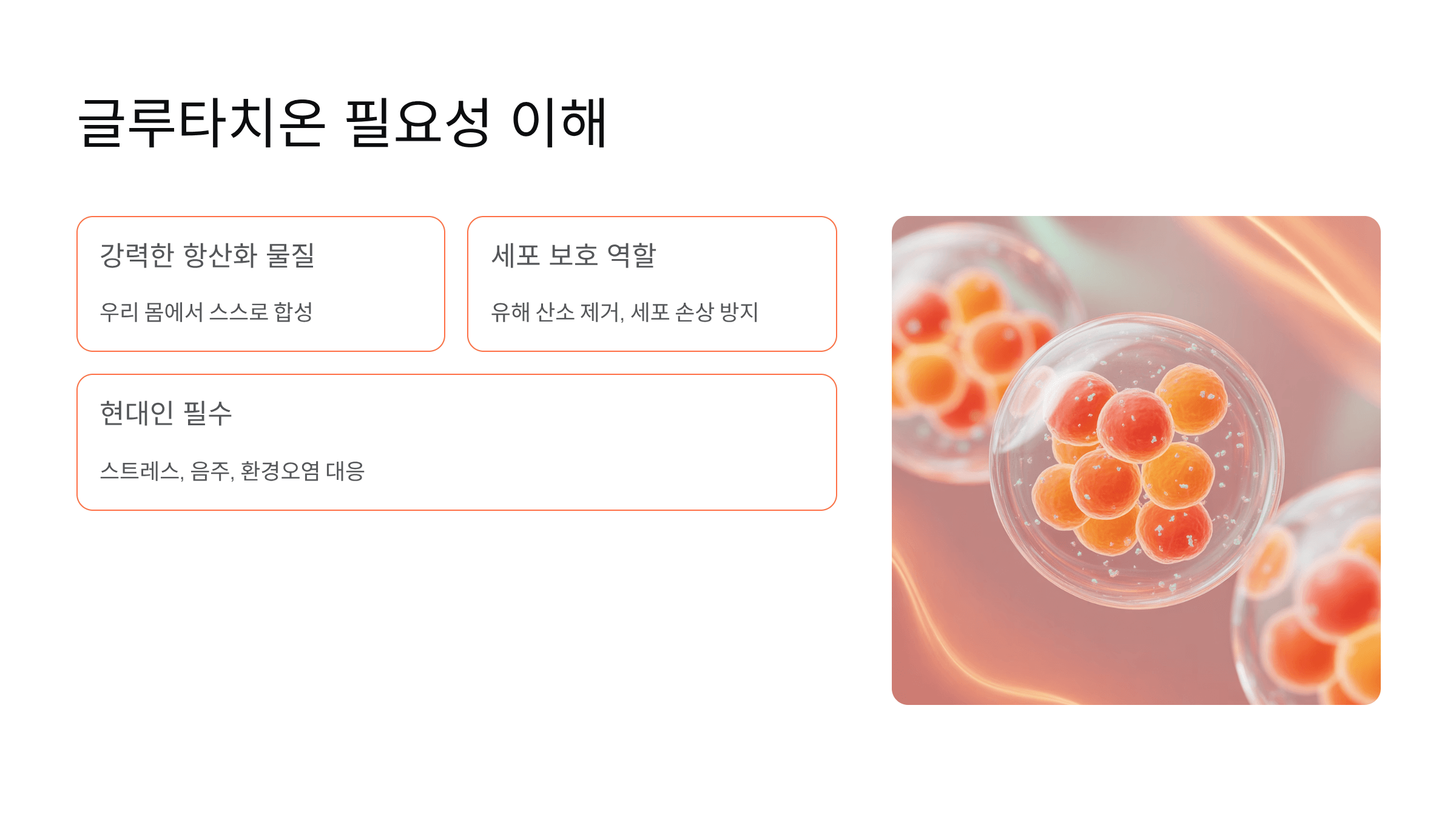글루타치온은 우리 몸에서 스스로 합성되는 강력한 항산화 물질입니다. 세포 속에 존재하면서 유해 산소를 제거하고 세포 손상을 막아주는 역할을 합니다. 제가 처음 글루타치온을 접한 건 '피부 미백 효과' 때문이었는데, 알아보니 단순히 미용을 넘어 몸 전반의 건강과 관련된 중요한 물질이더라구요. 특히 스트레스, 음주, 환경오염으로 활성산소가 많아진 현대인들에게 글루타치온은 꼭 필요한 존재입니다.
