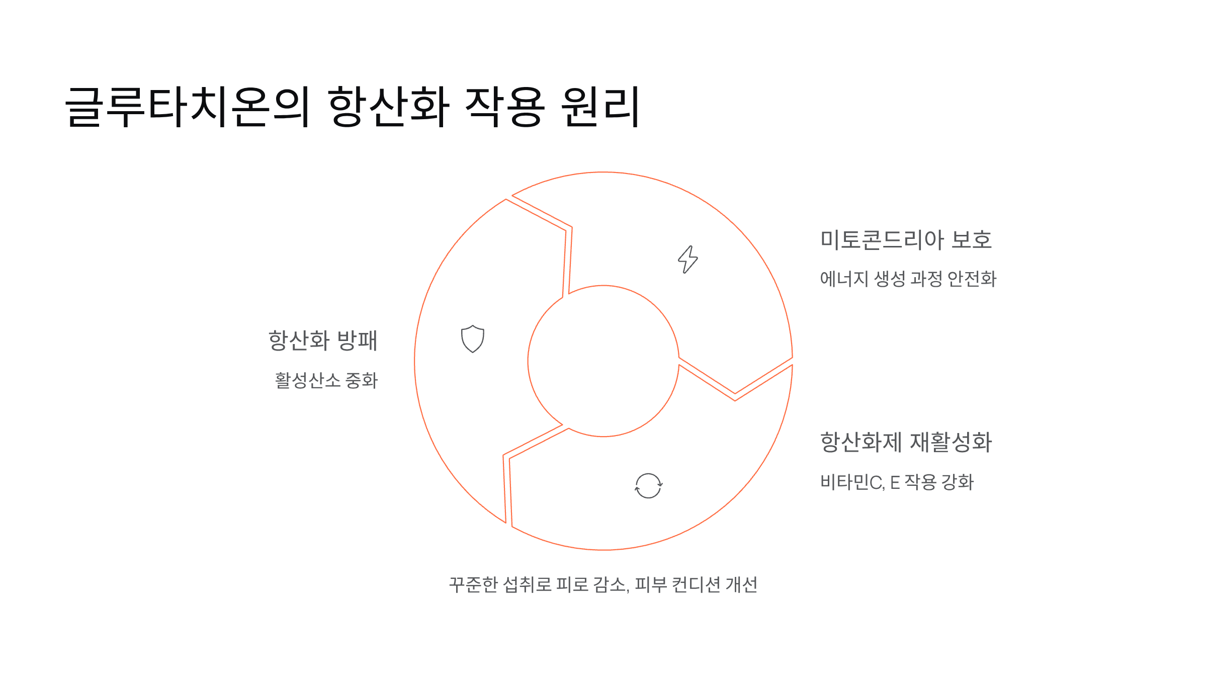 글루타치온은 체내에서 ‘항산화 방패’ 역할을 합니다. 쉽게 말해 녹이 슬지 않게 막아주는 윤활유 같은 역할이죠. 세포 속 미토콘드리아에서 에너지가 생성되는 과정에서 생기는 활성산소를 중화시키고, 다른 항산화제(비타민C, 비타민E 등)를 재활성화시켜 작용을 강화합니다. 제가 느낀 점은 꾸준히 글루타치온을 섭취하면 피로가 덜 쌓이고, 피부 컨디션도 확실히 좋아졌다는 것입니다.