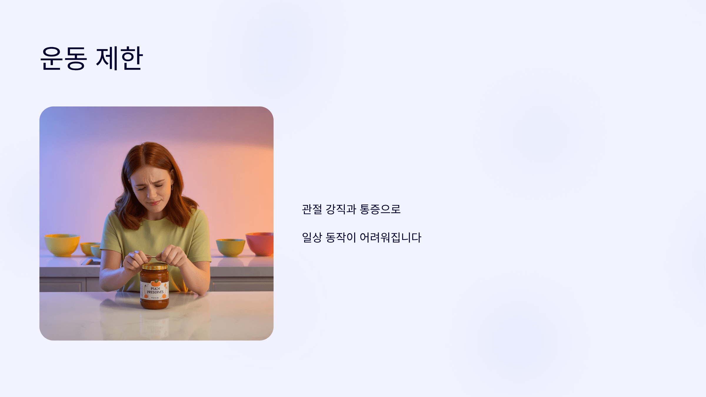 가장 힘든 점은 생활 불편이에요. 단추 잠그기, 양치질, 펜 잡기, 요리하기까지 사소한 일들이 다 불편해집니다. 저는 양말을 신는 것조차 시간이 오래 걸리더라고요. 이런 일상 속 작은 불편이 쌓이면 삶의 질이 크게 떨어지게 됩니다. 류마티스 관절염은 단순히 ‘아픈 병’이 아니라 ‘삶을 바꾸는 병’이라는 걸 느꼈습니다.