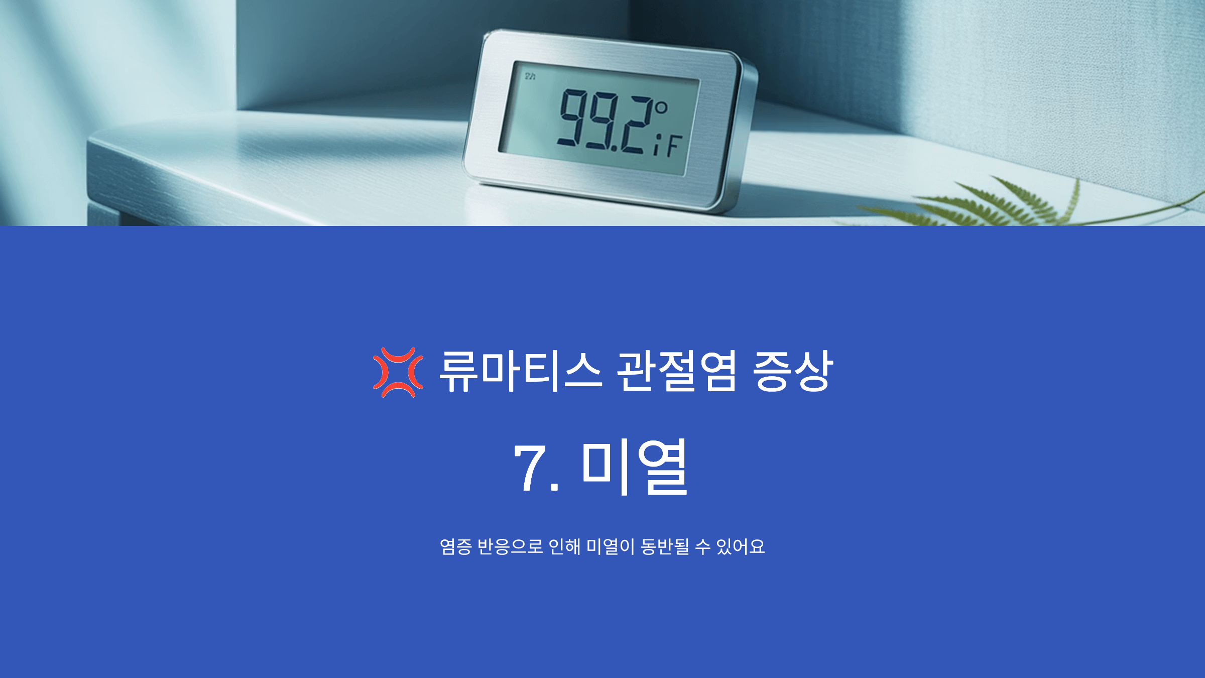 많은 분들이 간과하는 부분인데요, 류마티스 관절염은 관절만 아픈 게 아니라 전신에 영향을 줍니다. 항상 피곤하고, 조금만 움직여도 기운이 빠지는 느낌이 들 수 있어요. 저는 일을 하다가 집중력이 떨어지고 자꾸 졸음이 와서 “혹시 빈혈인가?” 싶었는데, 병원에서 류마티스 관절염 관련 검사를 권유받았습니다. 단순히 관절만 보는 것이 아니라 몸 전체를 살펴야 하는 이유가 여기에 있습니다.
