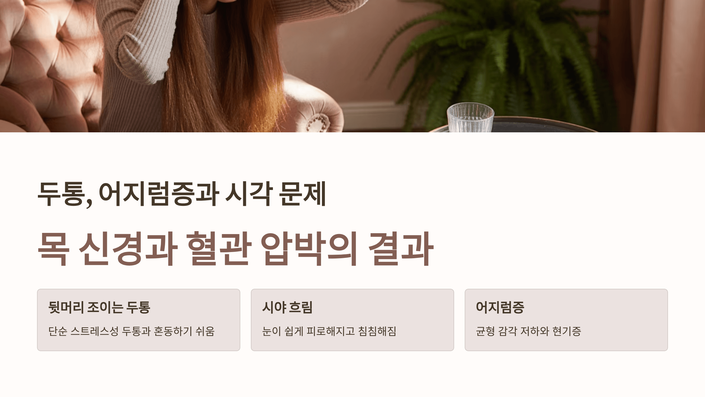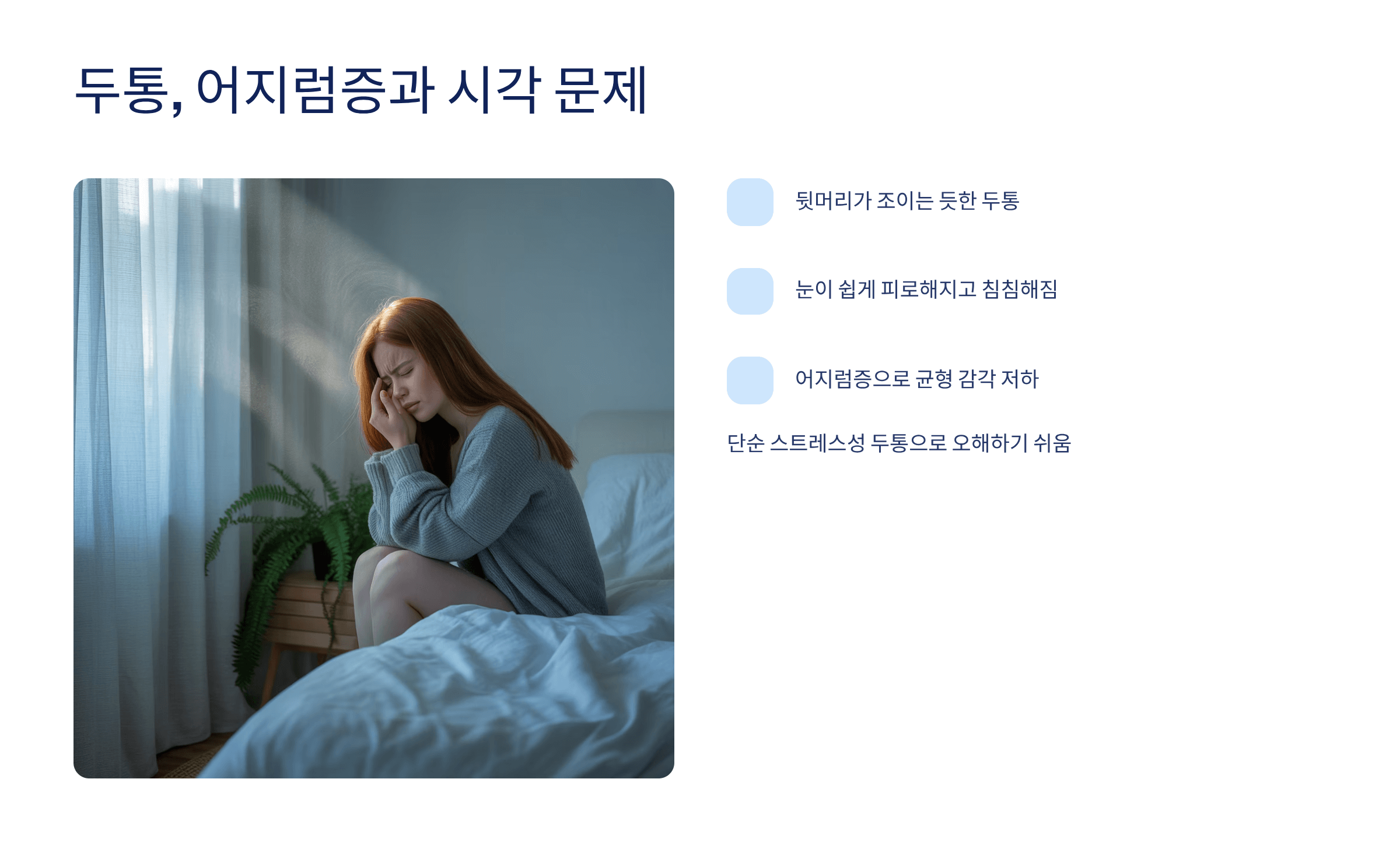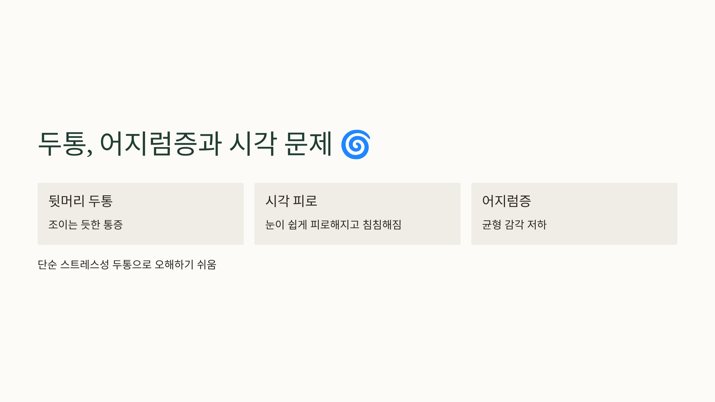 목과 연결된 신경과 혈관이 압박되면 두통, 어지럼증, 시야 흐림 같은 증상이 나타납니다. 🌀