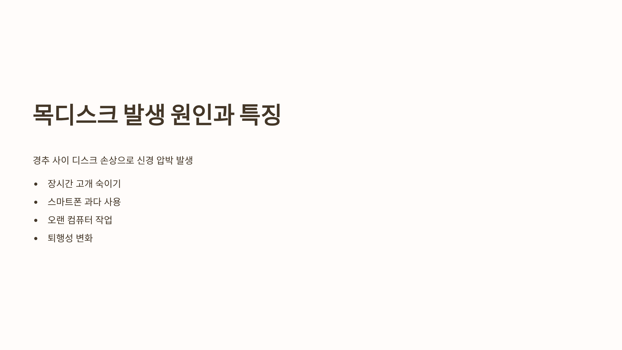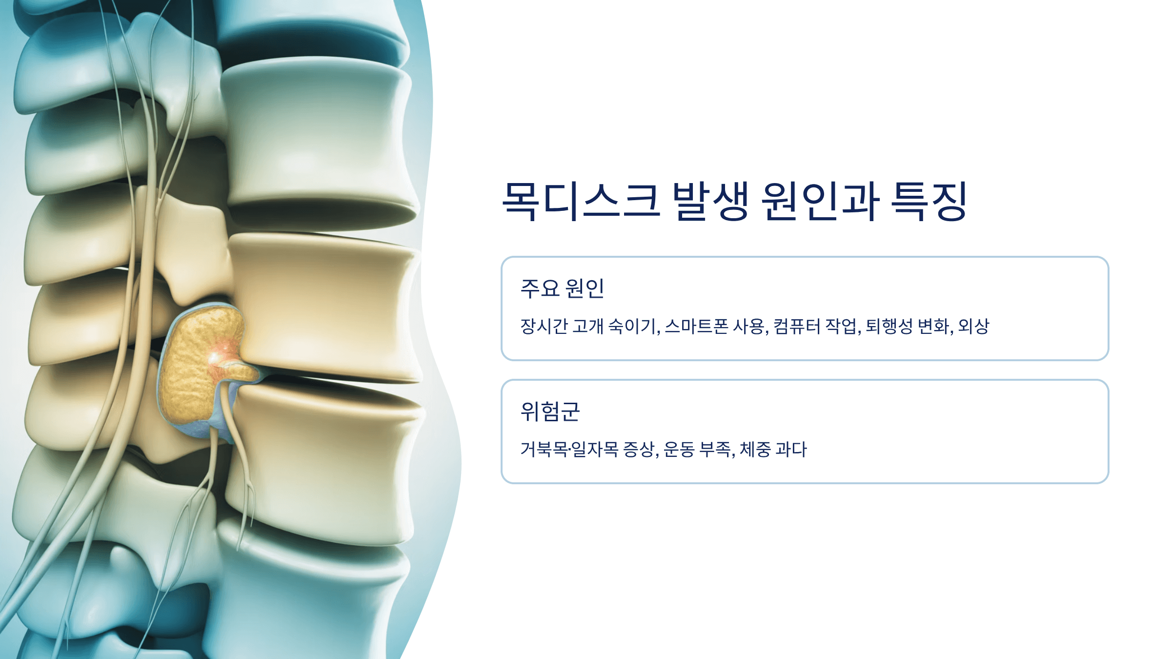 - 주요 원인: 장시간 고개 숙이기, 스마트폰 사용, 오랜 시간 앉아서 컴퓨터 작업, 퇴행성 변화, 외상