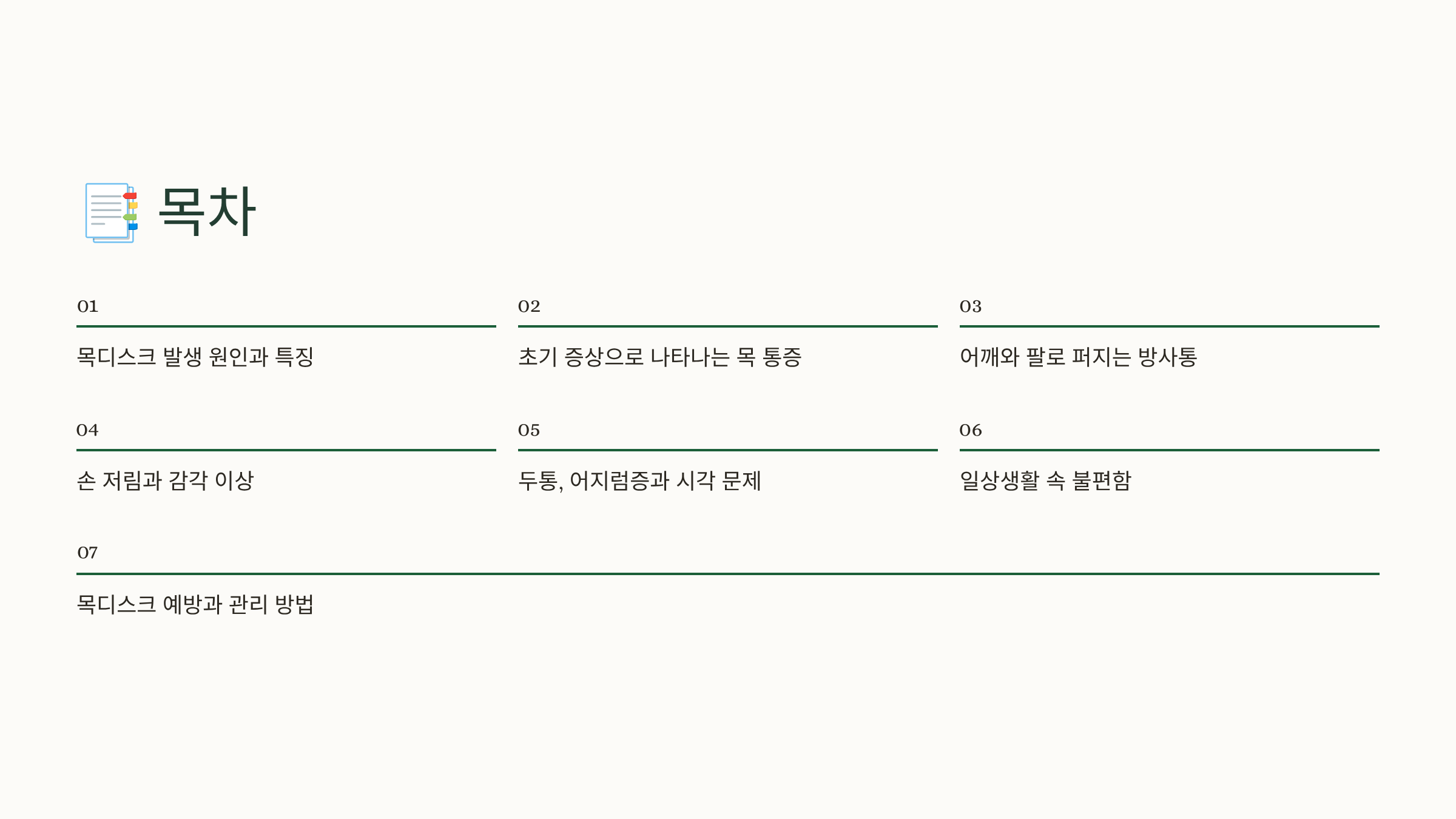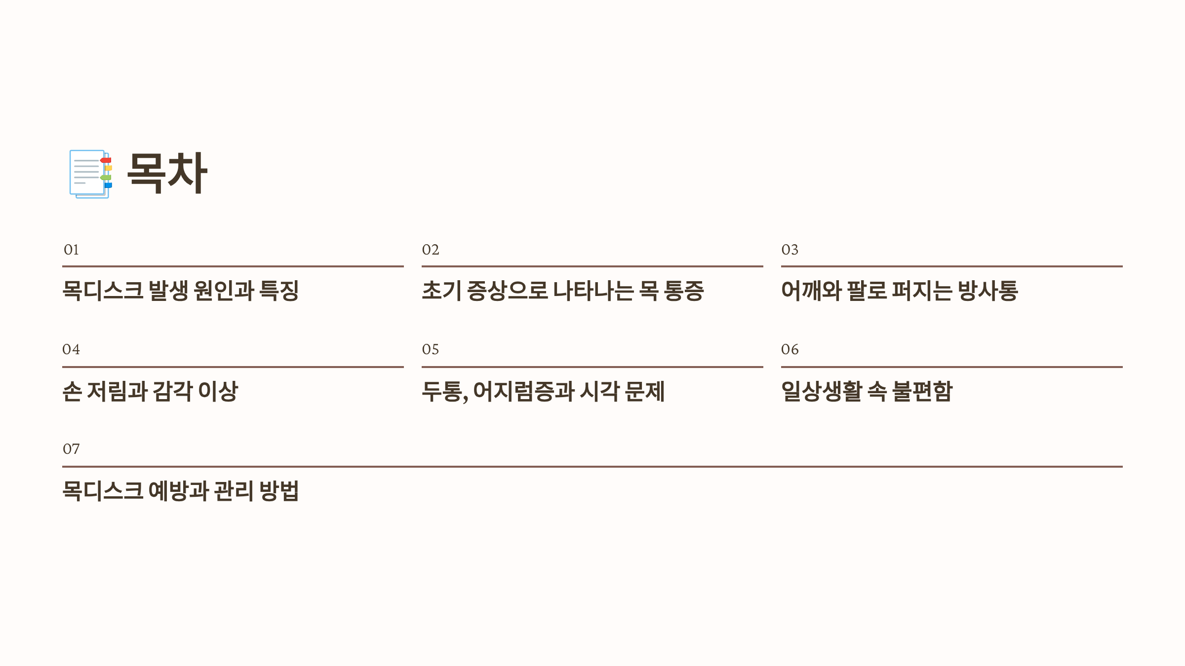 목디스크(경추 디스크)는 현대인에게 점점 흔해지는 질환입니다. 예전에는 중장년층에서 주로 발생했지만, 요즘은 스마트폰, 컴퓨터 사용 시간이 늘면서 젊은 층에서도 빠르게 늘고 있어요. 저도 한때 목이 뻐근하고 손끝이 저린 증상을 대수롭지 않게 넘겼다가 정형외과 검진을 통해 목디스크 초기 진단을 받은 적이 있습니다. 이 경험을 통해 조기 발견과 생활 습관 관리가 얼마나 중요한지 절실히 깨달았어요. 오늘은 목디스크의 다양한 증상과 놓치기 쉬운 초기 징후를 자세히 설명해 드릴게요.