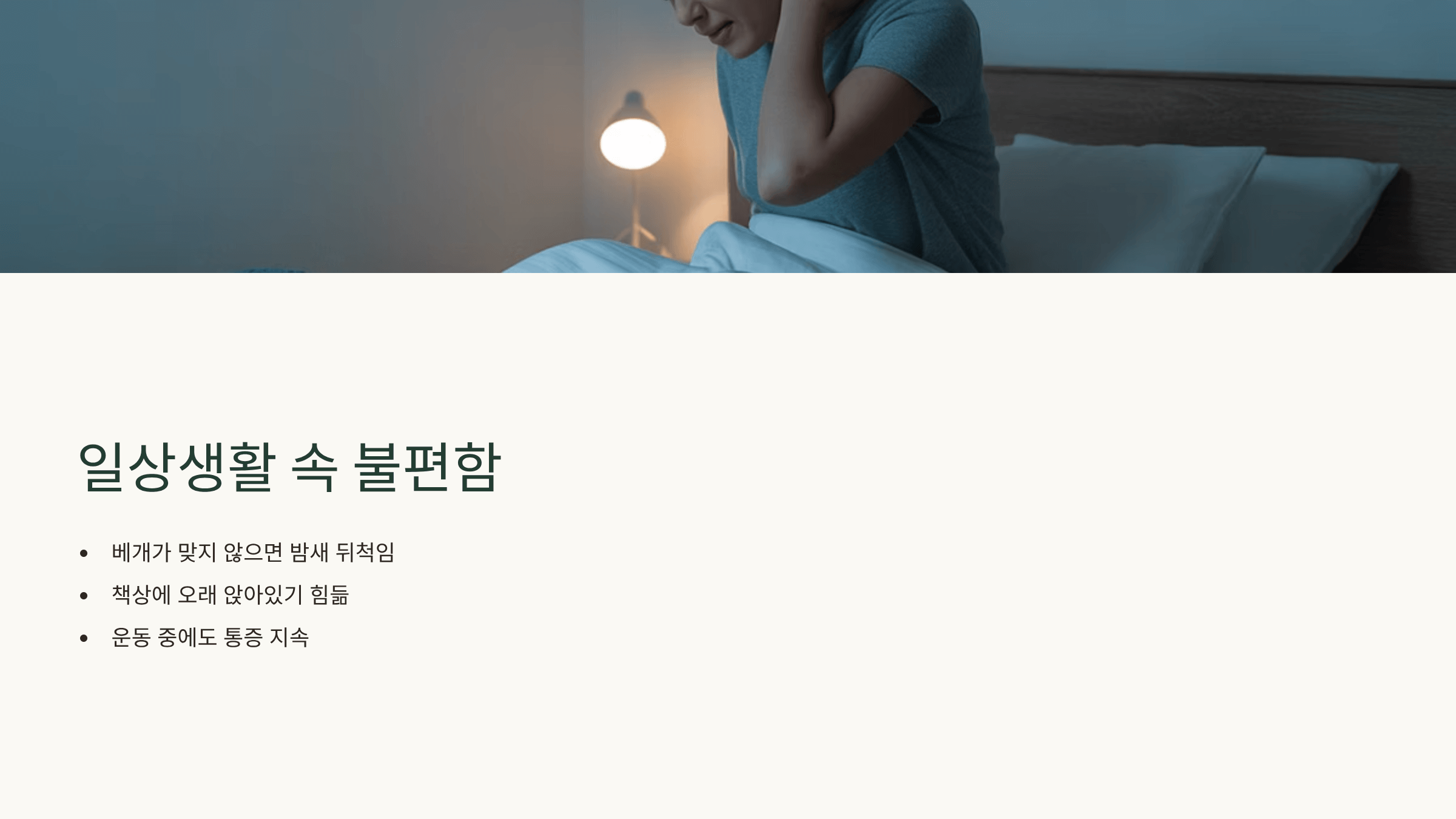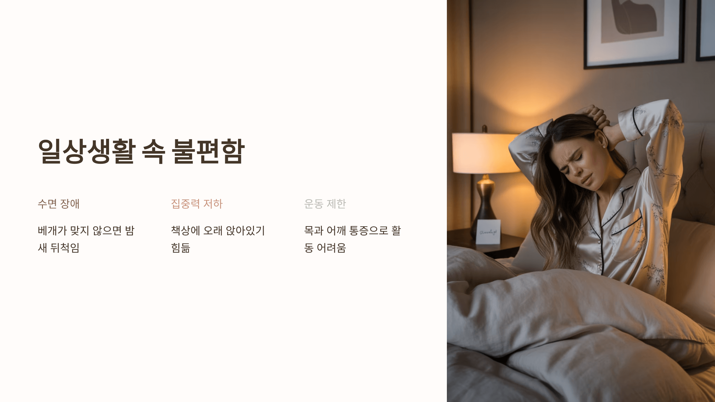 저는 특히 아침에 일어날 때 목이 잘 안 돌아가고 통증이 심했는데, 이런 증상을 가볍게 넘겼다가 더 큰 문제로 이어질 수 있다는 걸 알게 됐습니다.