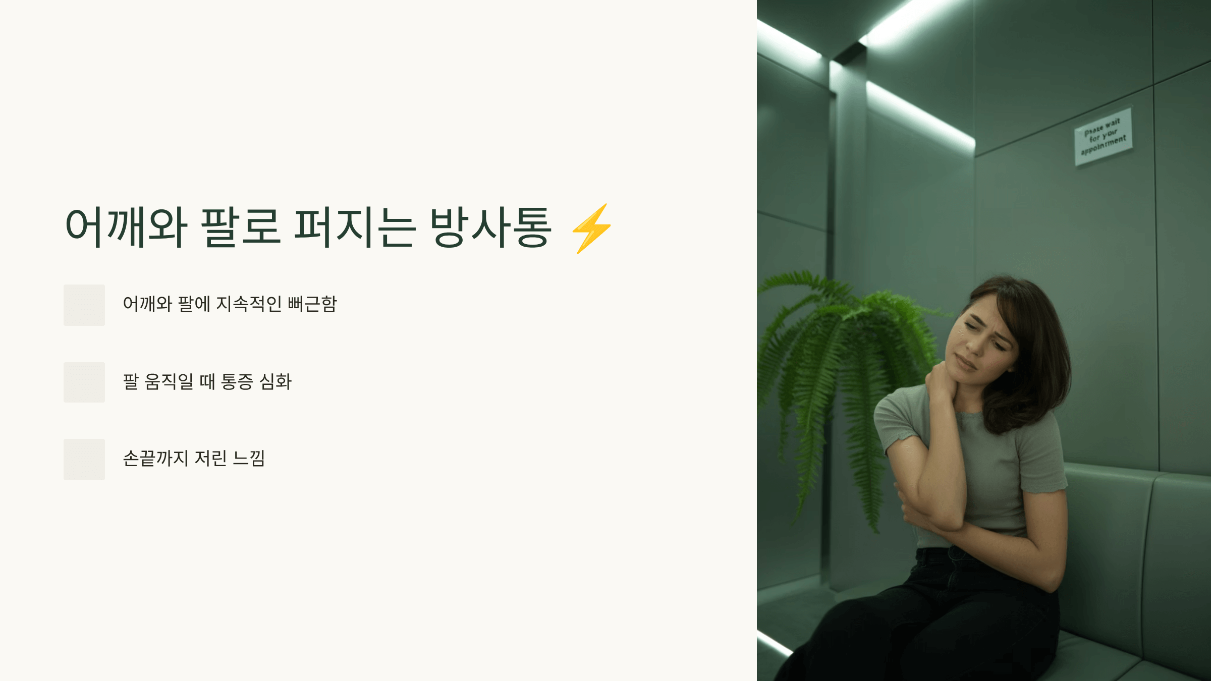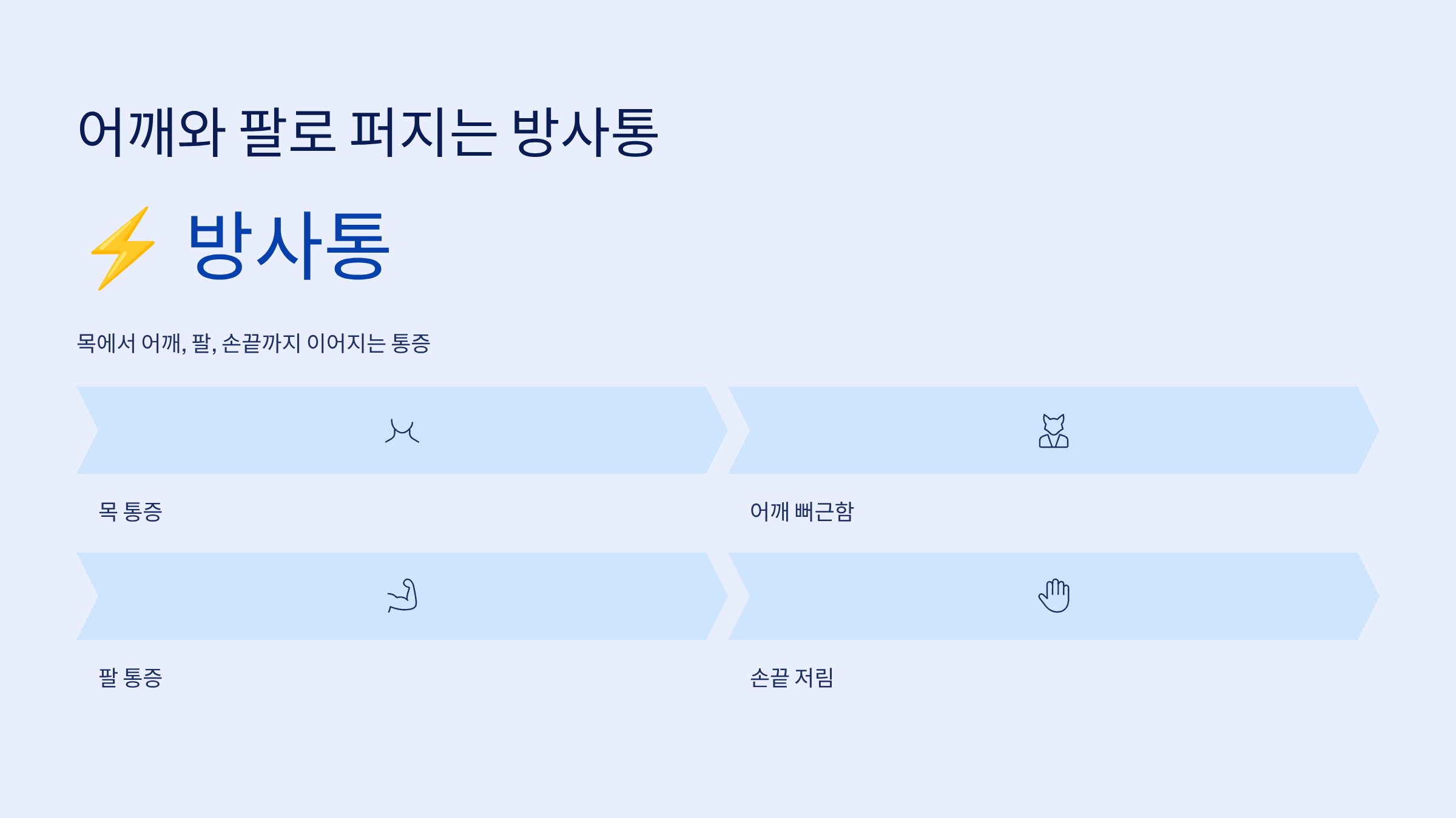 목디스크는 신경 압박으로 인해 통증이 목에서 어깨, 팔, 손끝까지 이어질 수 있습니다. 이를 방사통이라고 부르며, 마치 전기가 찌릿하게 흐르는 듯한 느낌을 동반하기도 합니다. ⚡