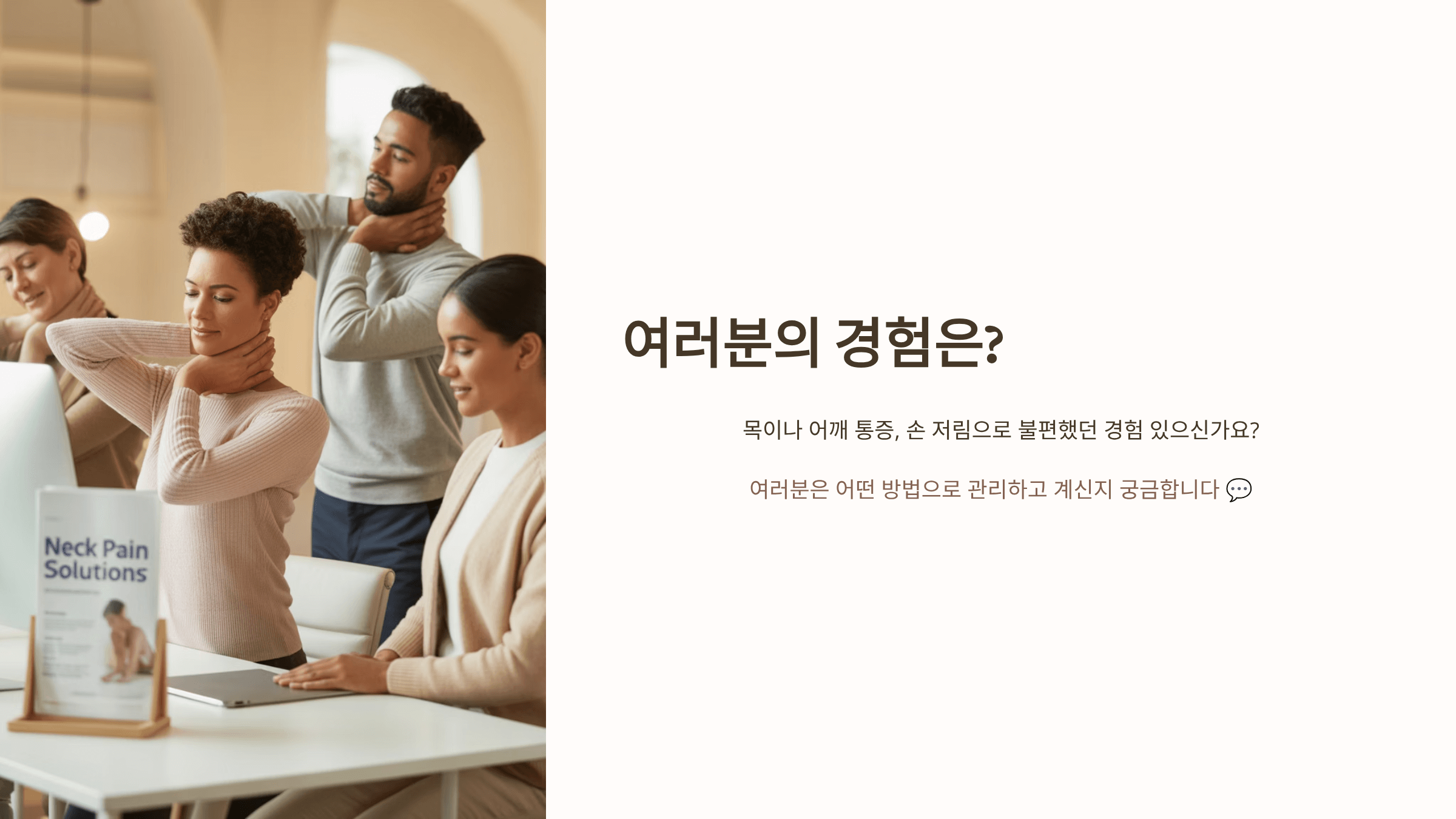 혹시 여러분도 목이나 어깨 통증, 손 저림 때문에 불편했던 경험 있으신가요? 저는 컴퓨터 작업 후 뒷목이 뻐근해 고개를 돌리기조차 힘들었는데, 여러분은 어떤 방법으로 관리하고 계신지 궁금합니다. 💬