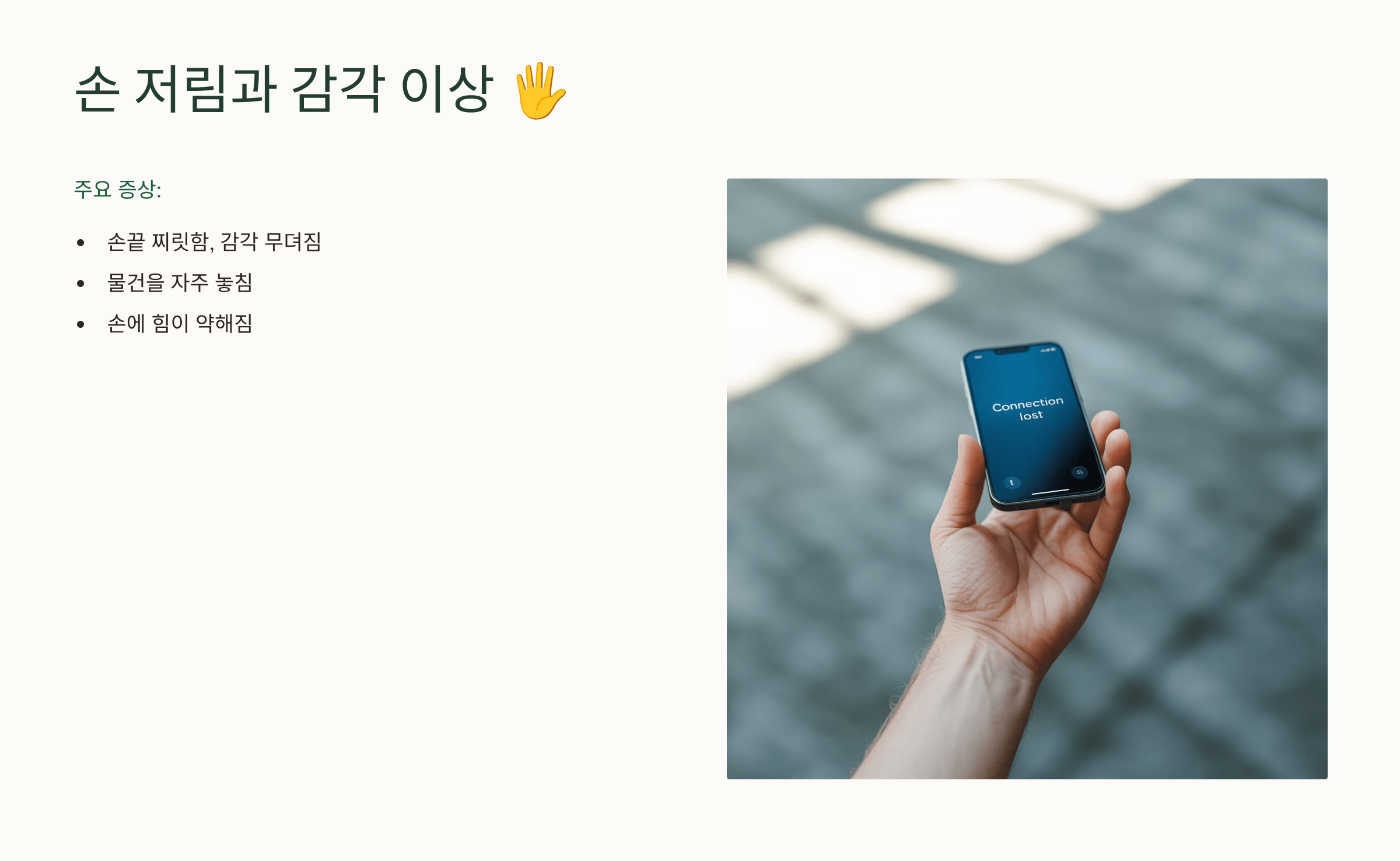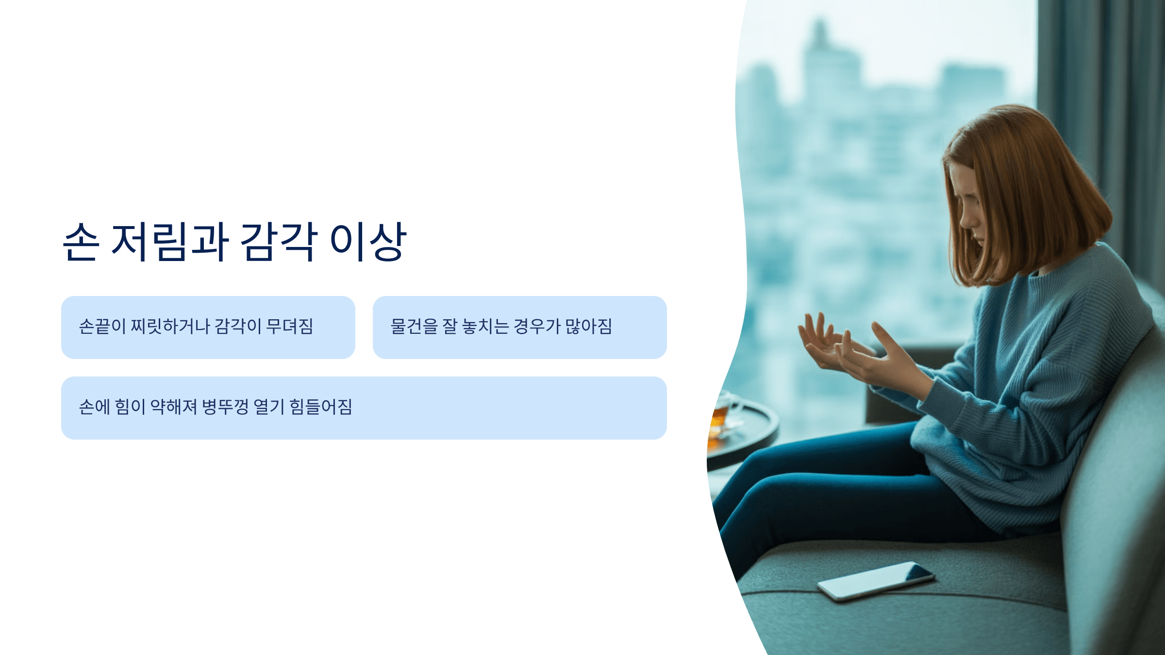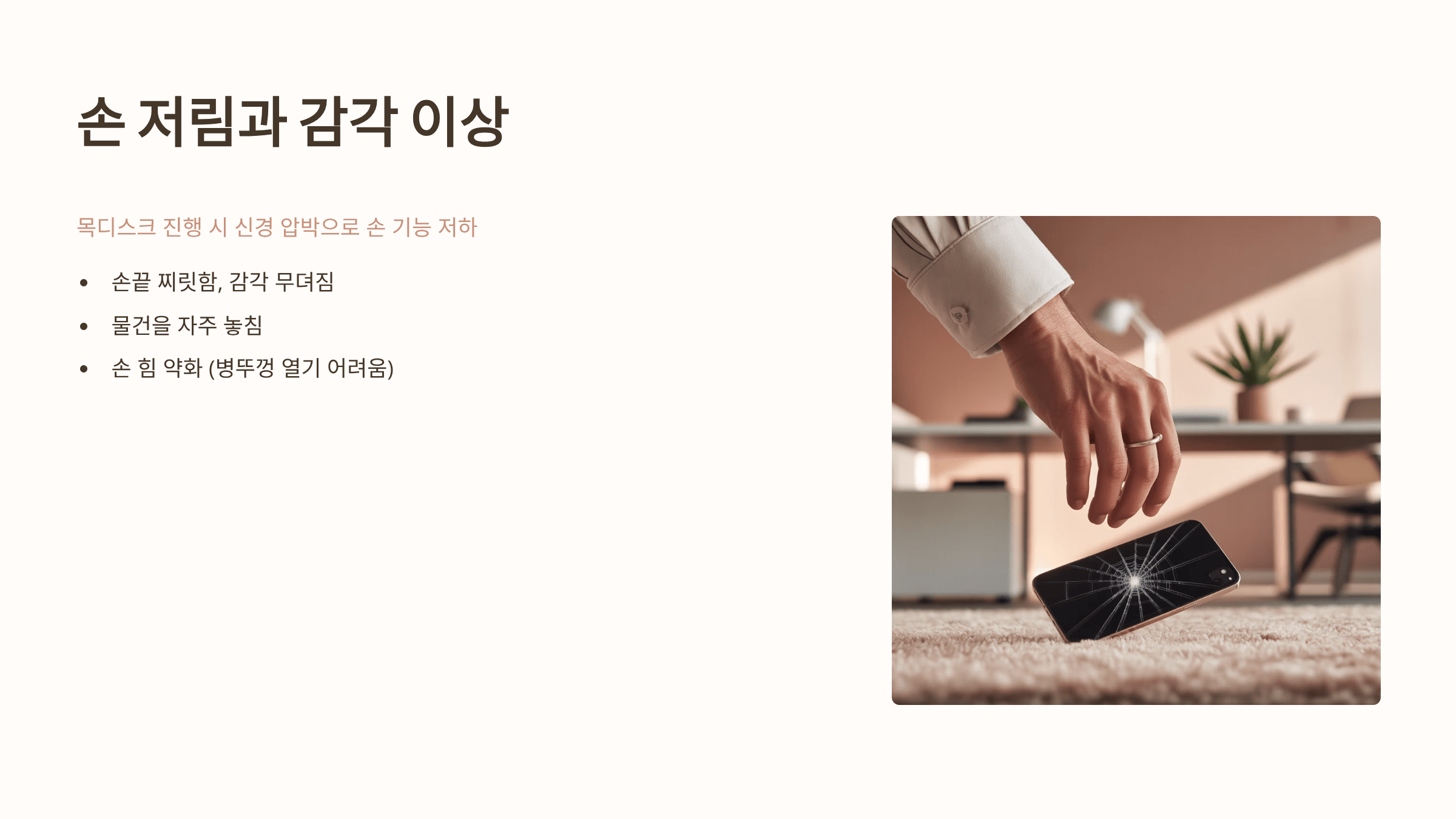목디스크가 진행되면 신경 압박이 손과 손가락의 감각을 떨어뜨립니다. 작은 물건을 집기 어렵거나 힘이 빠지는 경우가 생기죠. 🖐️