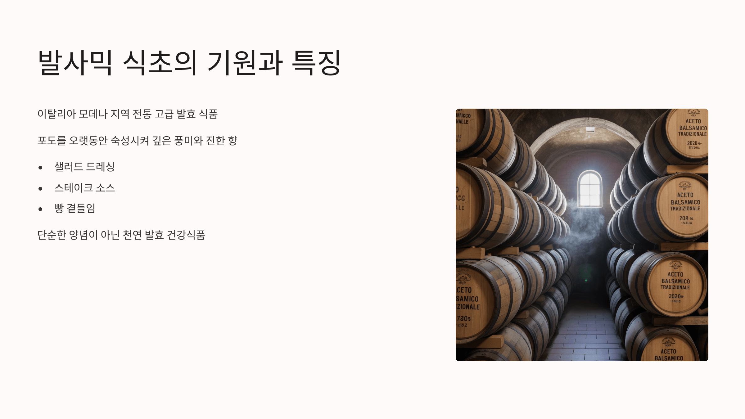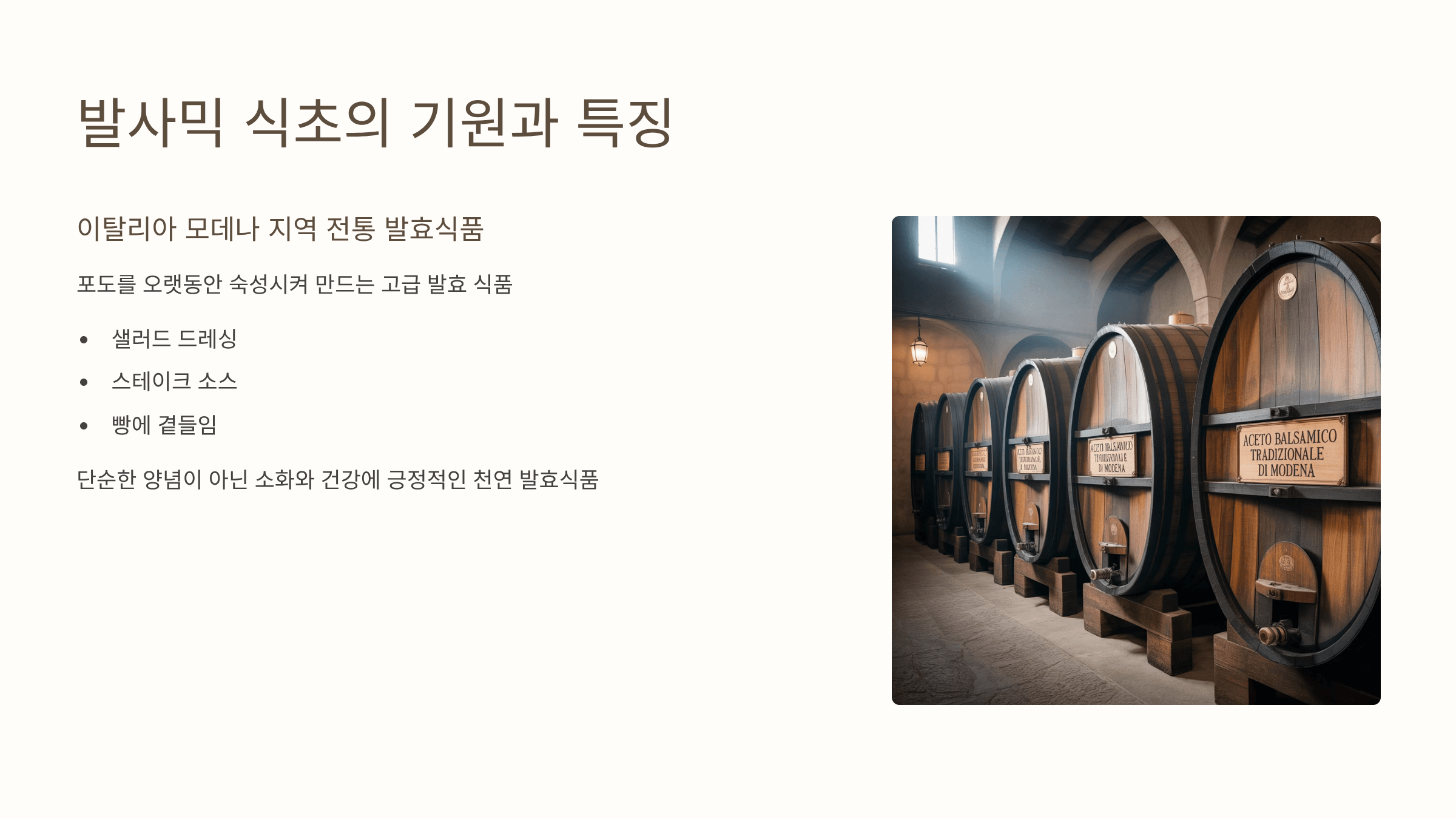 발사믹 식초는 이탈리아 모데나 지역에서 전통적으로 생산되던 고급 발효 식품입니다. 포도를 오랫동안 숙성시켜 만드는 만큼 풍미가 깊고 향이 진하죠. 보통 샐러드 드레싱, 스테이크 소스, 빵에 곁들여 먹는 등 다양한 요리에 활용됩니다. 저는 샐러드에 올리브유와 함께 곁들이면 상큼하면서도 고급스러운 맛이 나서 자주 즐기고 있어요. 발사믹 식초는 단순한 양념이 아니라, 소화와 건강에 긍정적인 작용을 하는 천연 발효식품입니다.