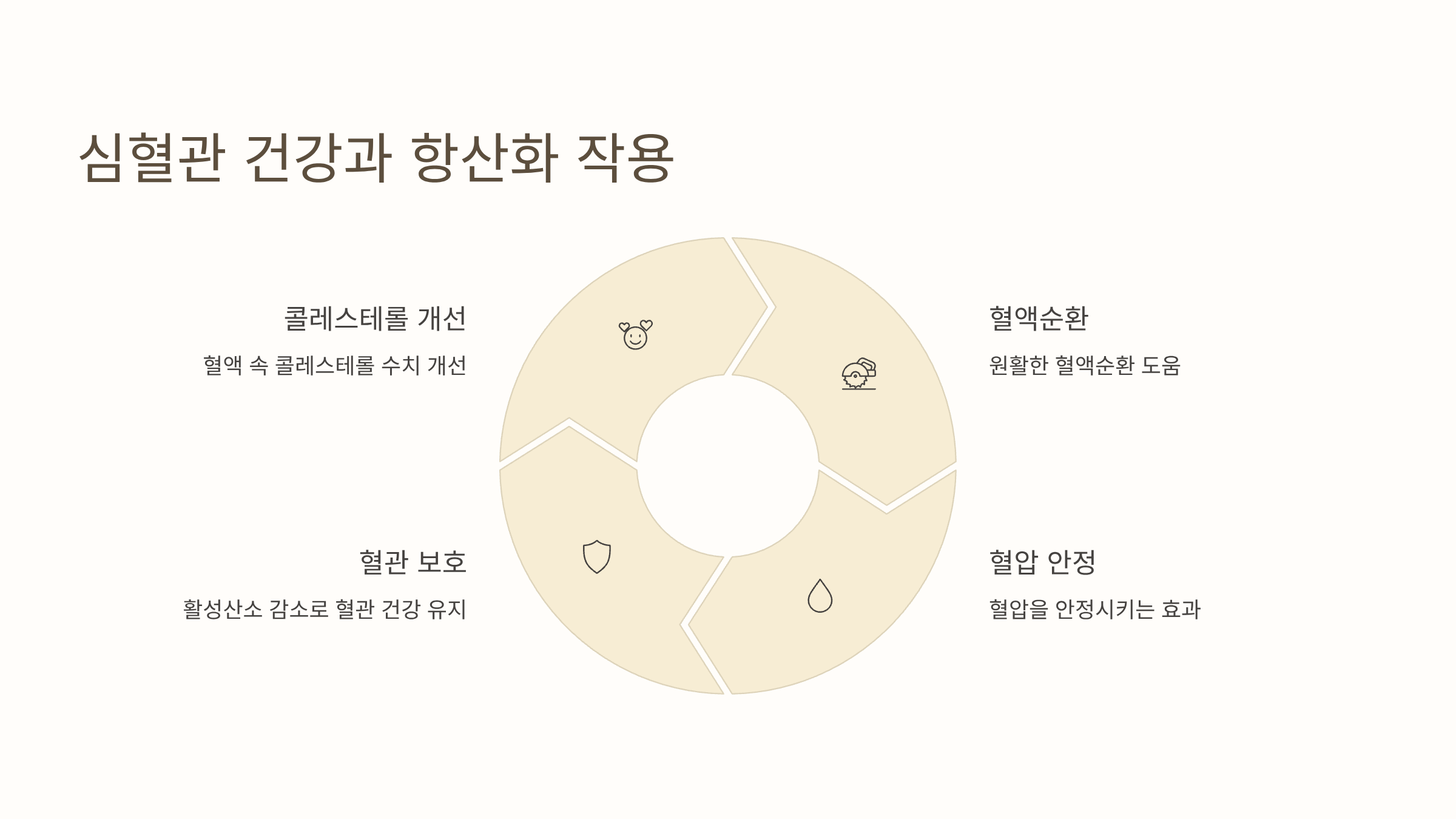 또한 항산화 작용으로 혈관 벽을 손상시키는 활성산소를 줄여 건강한 혈관을 유지하도록 돕습니다.
