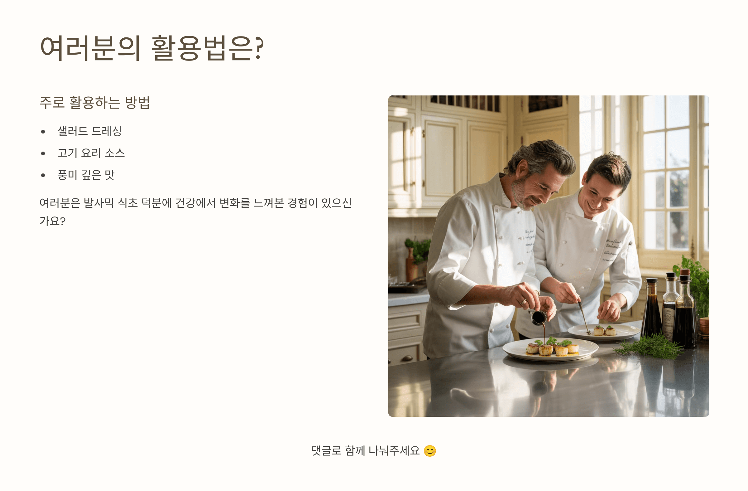 혹시 여러분은 발사믹 식초 덕분에 건강에서 변화를 느껴본 경험이 있으신가요? 댓글로 함께 나눠주세요 😊.