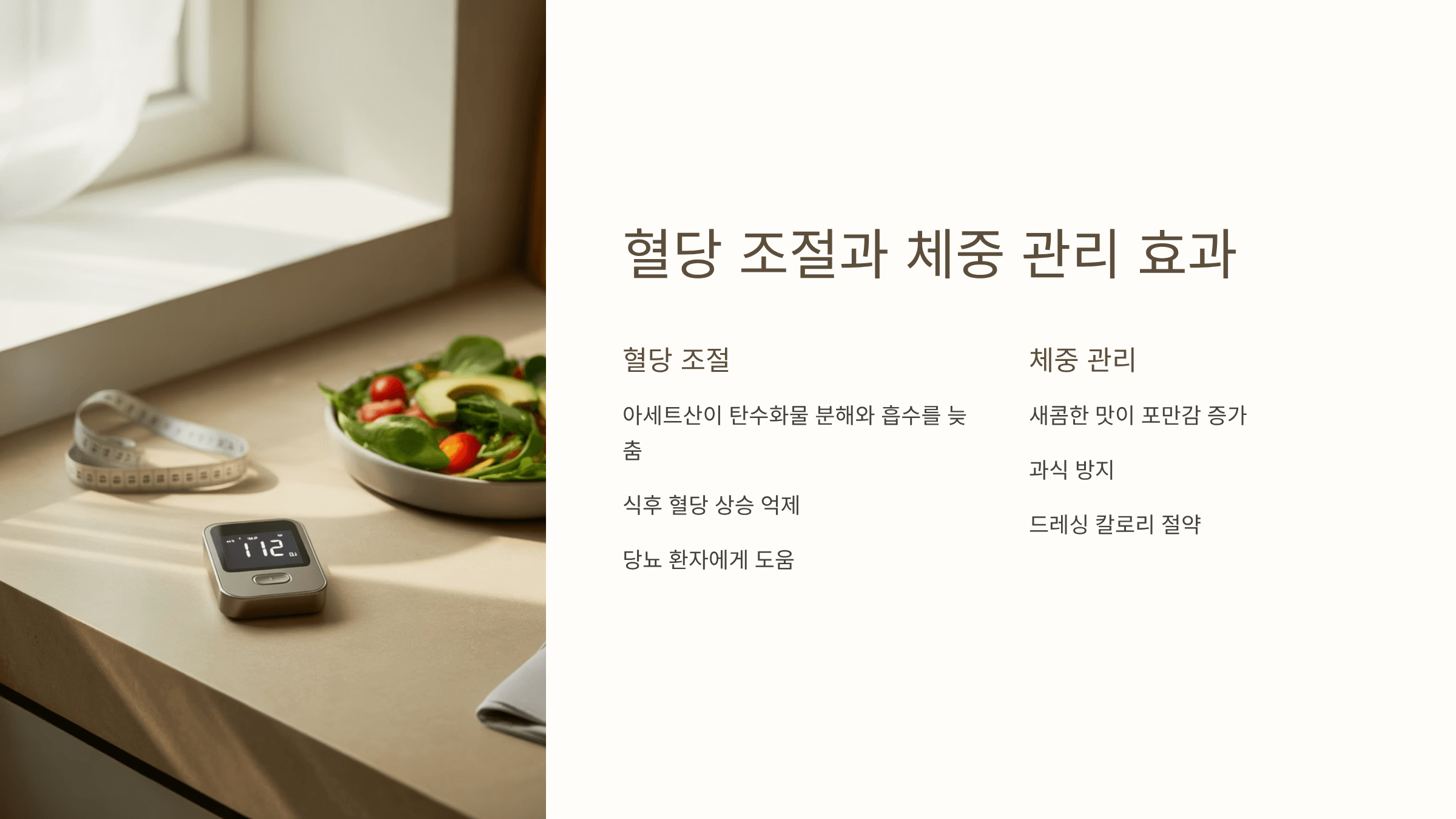 또한 식초의 새콤한 맛이 포만감을 높여 과식을 줄이고 체중 관리에도 긍정적인 영향을 줍니다. 실제로 저도 다이어트를 할 때 샐러드에 발사믹 식초를 넣으면 드레싱 칼로리를 줄이면서도 맛있게 먹을 수 있었어요 🥬.