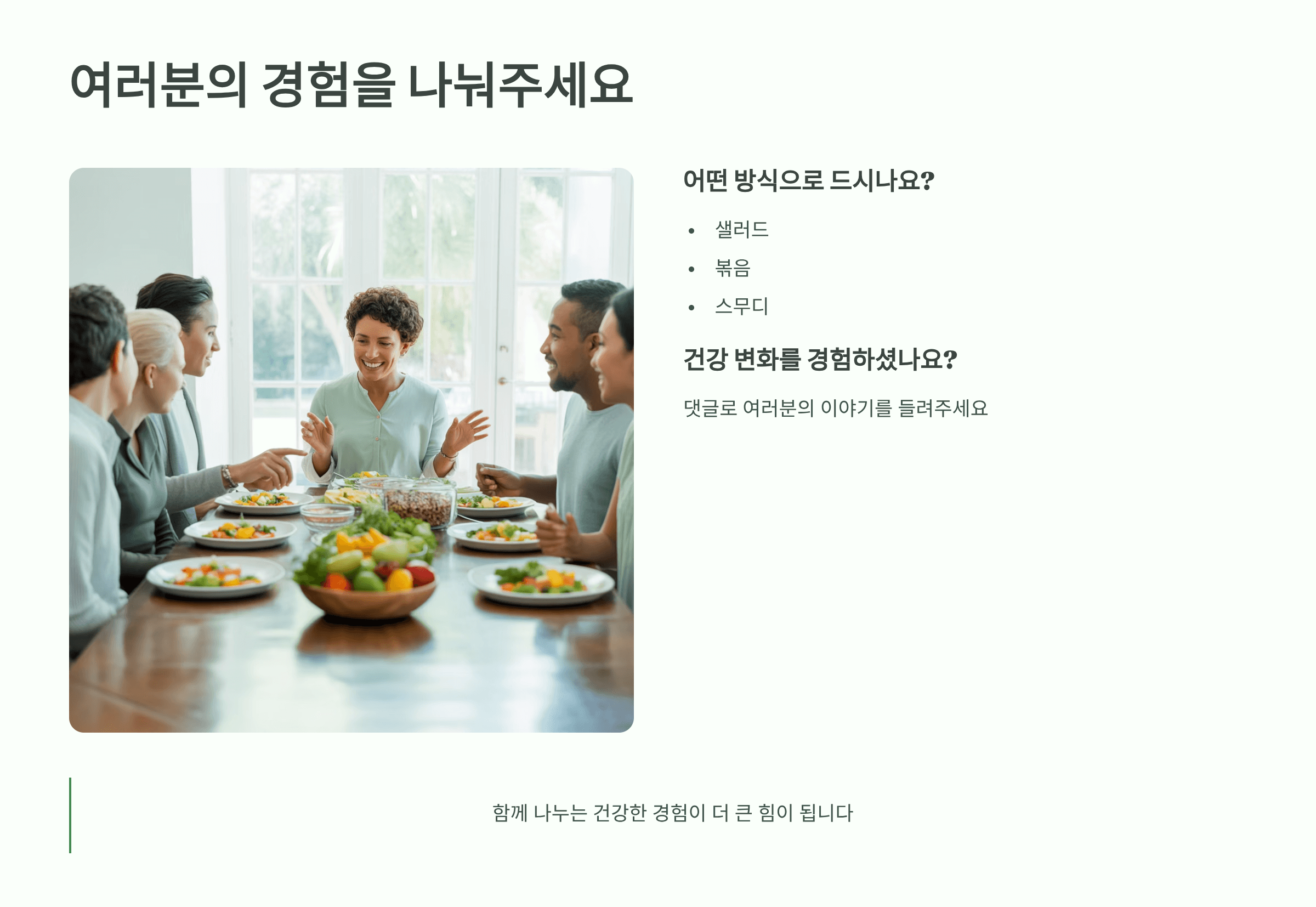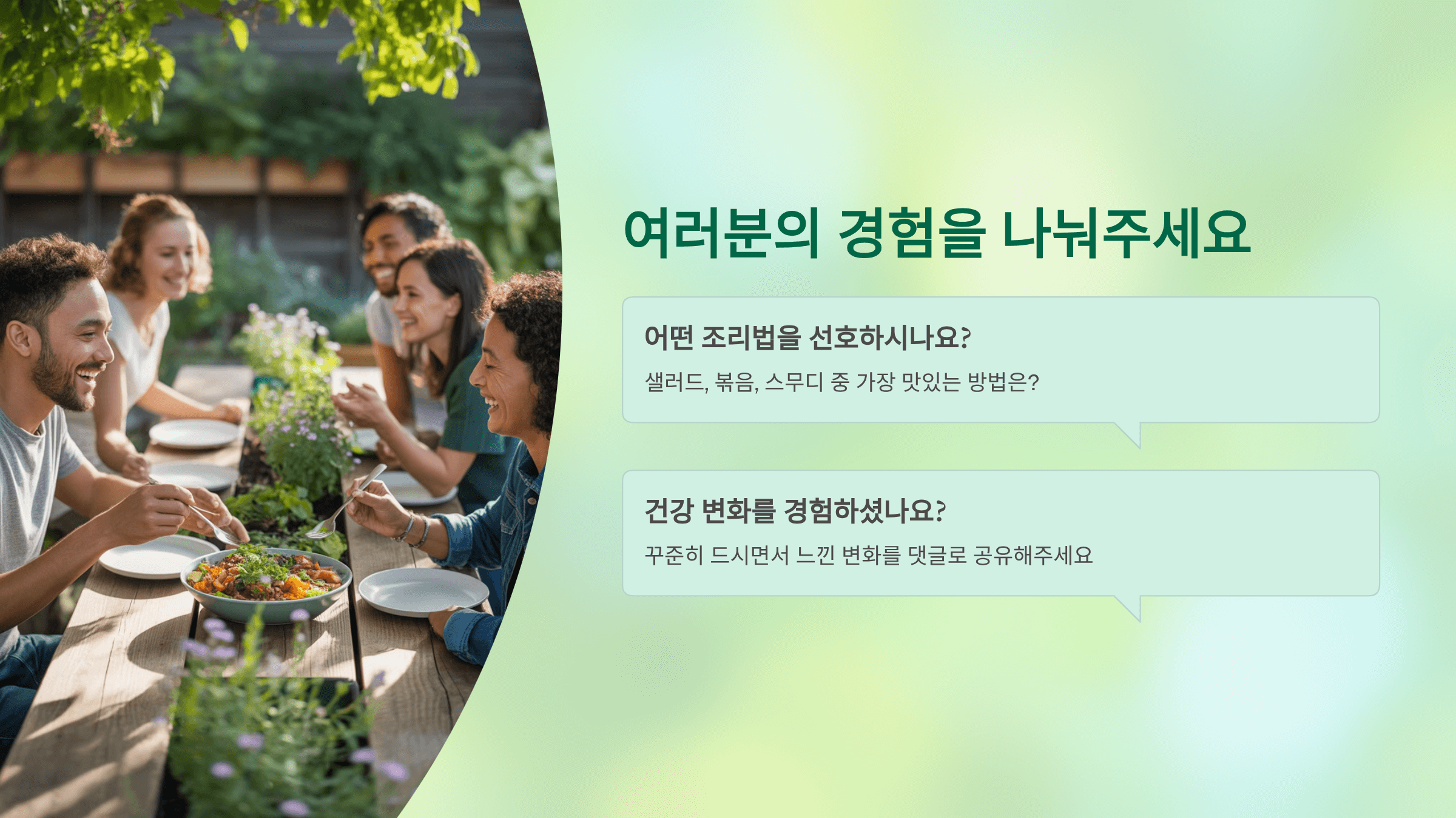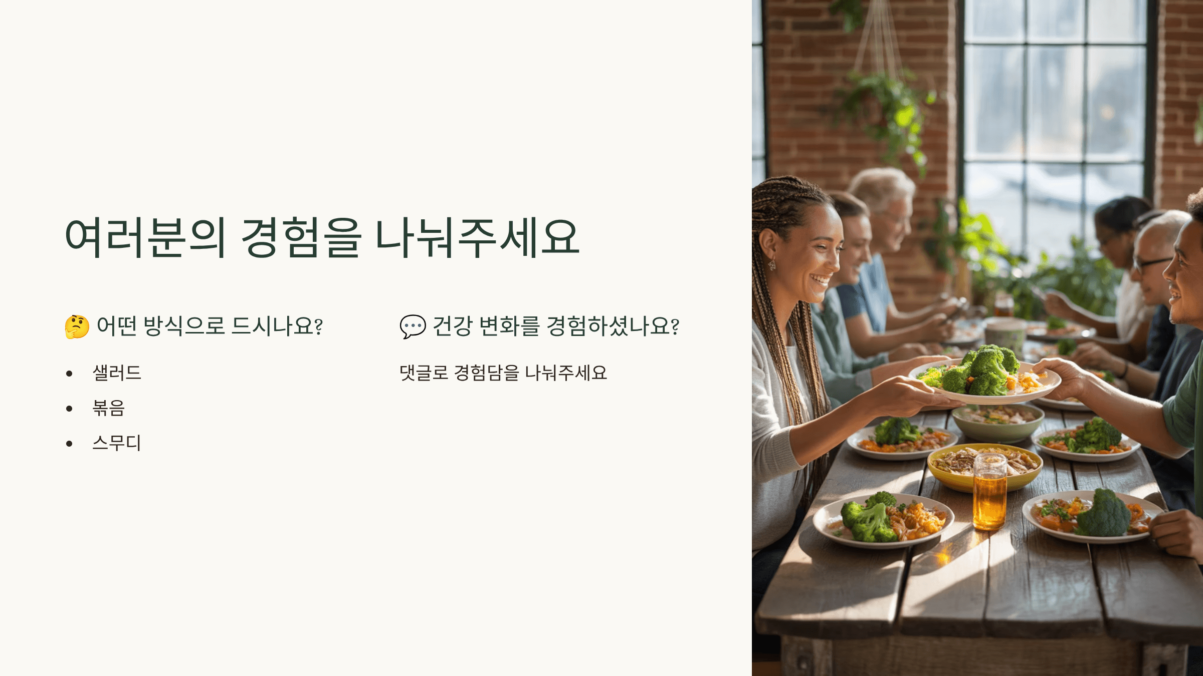 여러분은 브로콜리를 어떤 방식으로 드시고 계신가요? 샐러드, 볶음, 스무디 중 어떤 조리법이 가장 맛있다고 느끼셨나요? 혹시 꾸준히 먹으면서 건강 변화를 경험한 분들이 있다면 댓글로 나눠주세요.