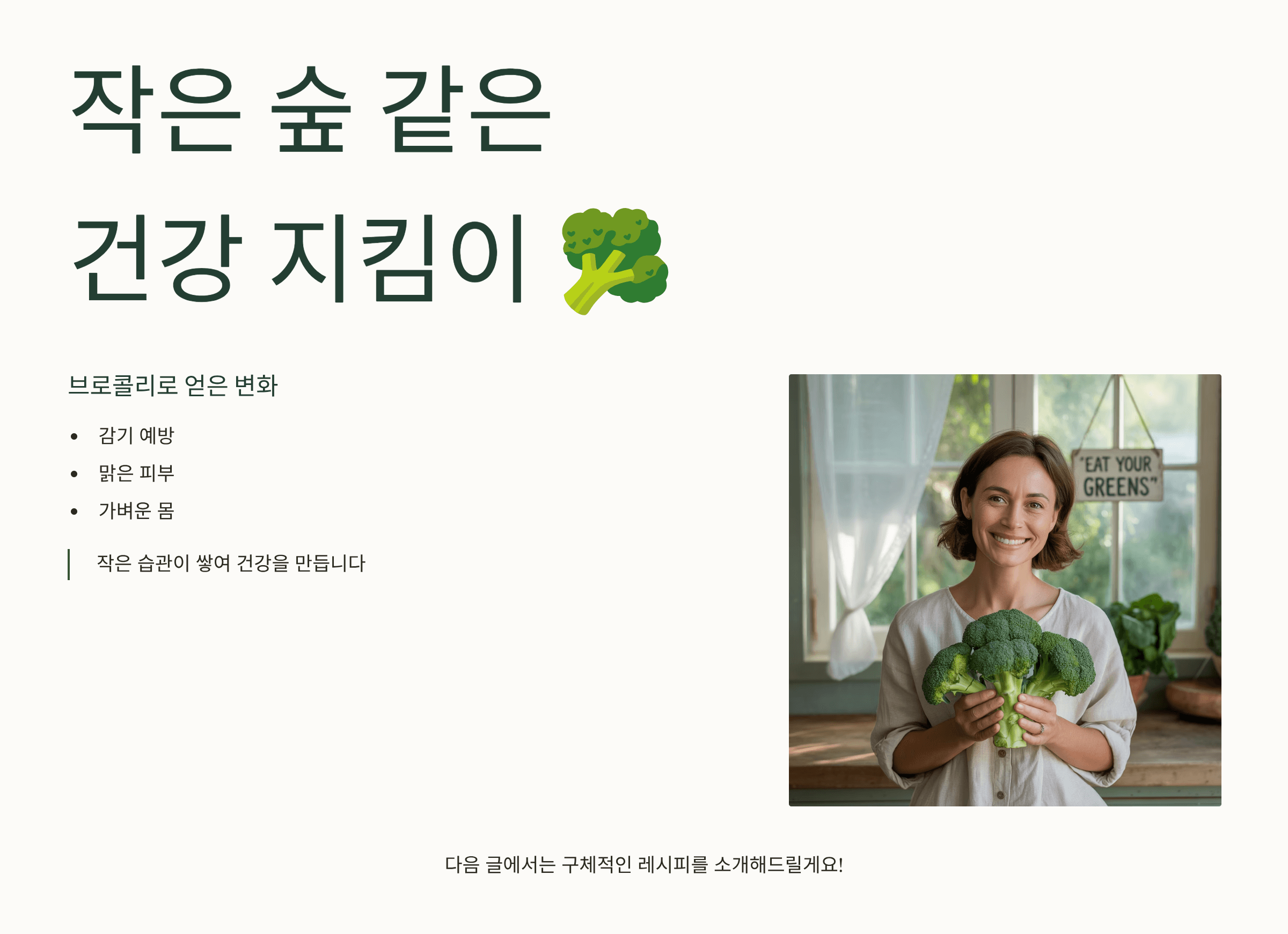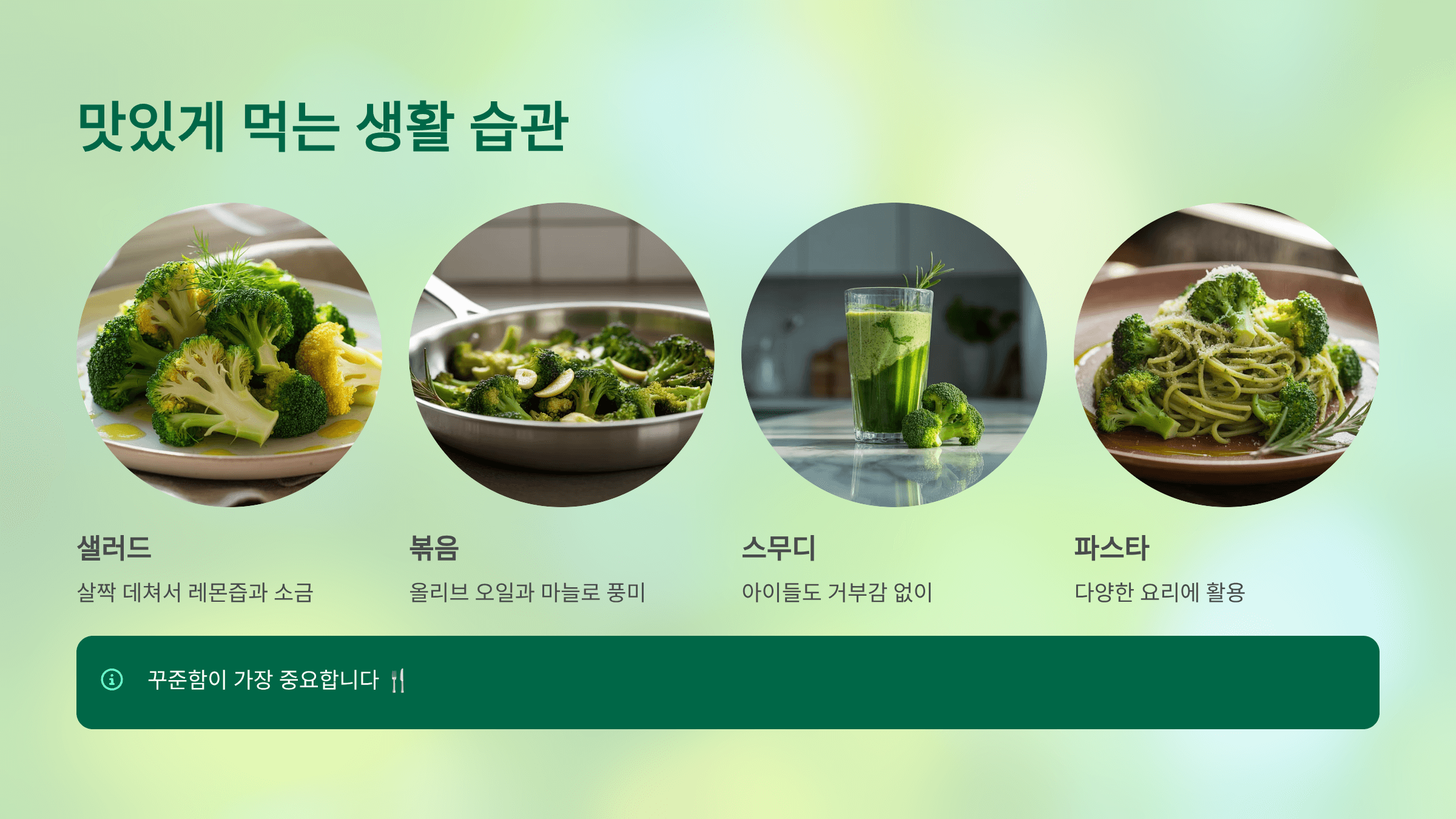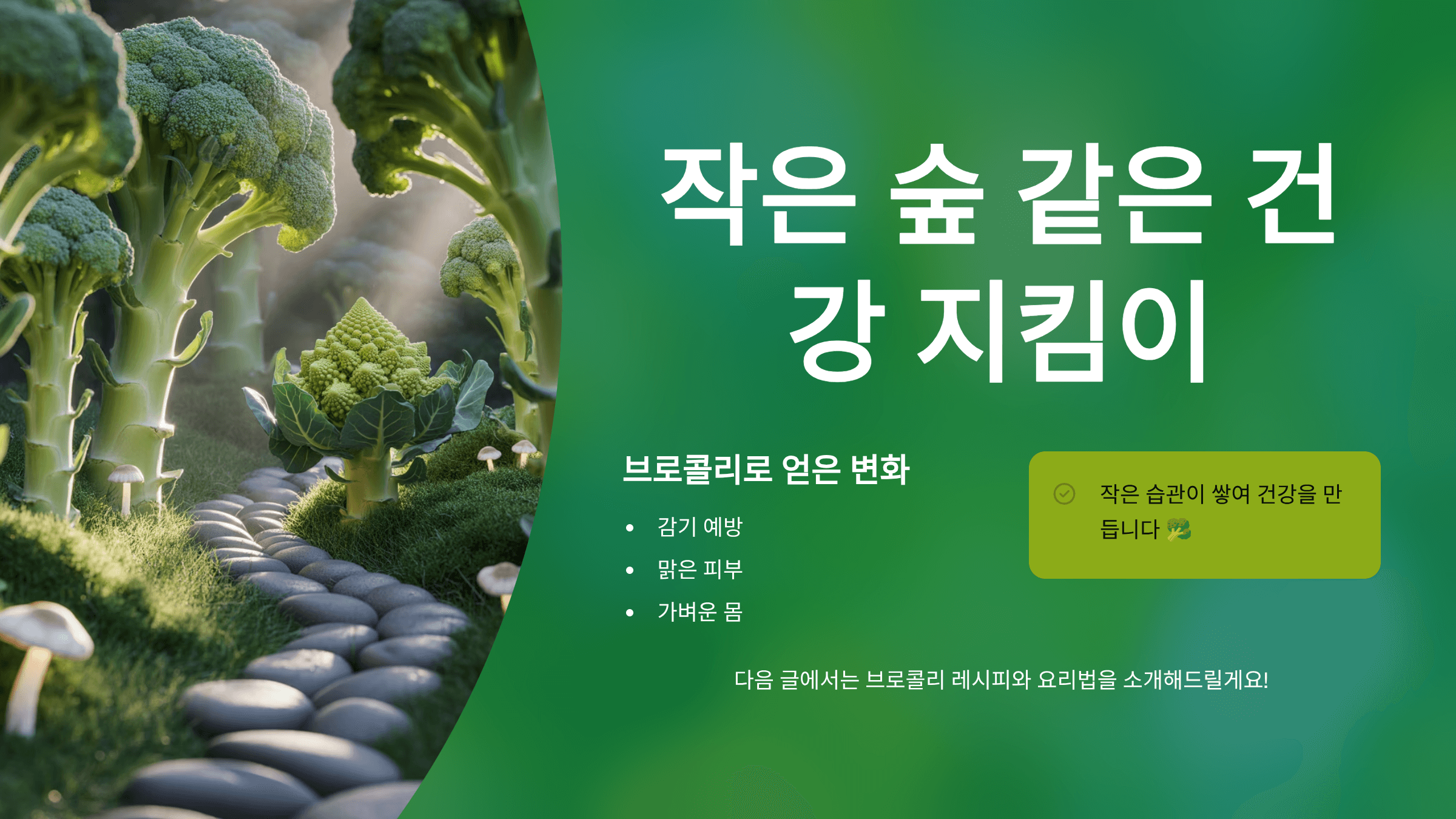 무엇보다 중요한 건 ‘꾸준함’입니다. 브로콜리를 매일 조금씩이라도 식탁에 올리면, 건강은 자연스럽게 따라옵니다.