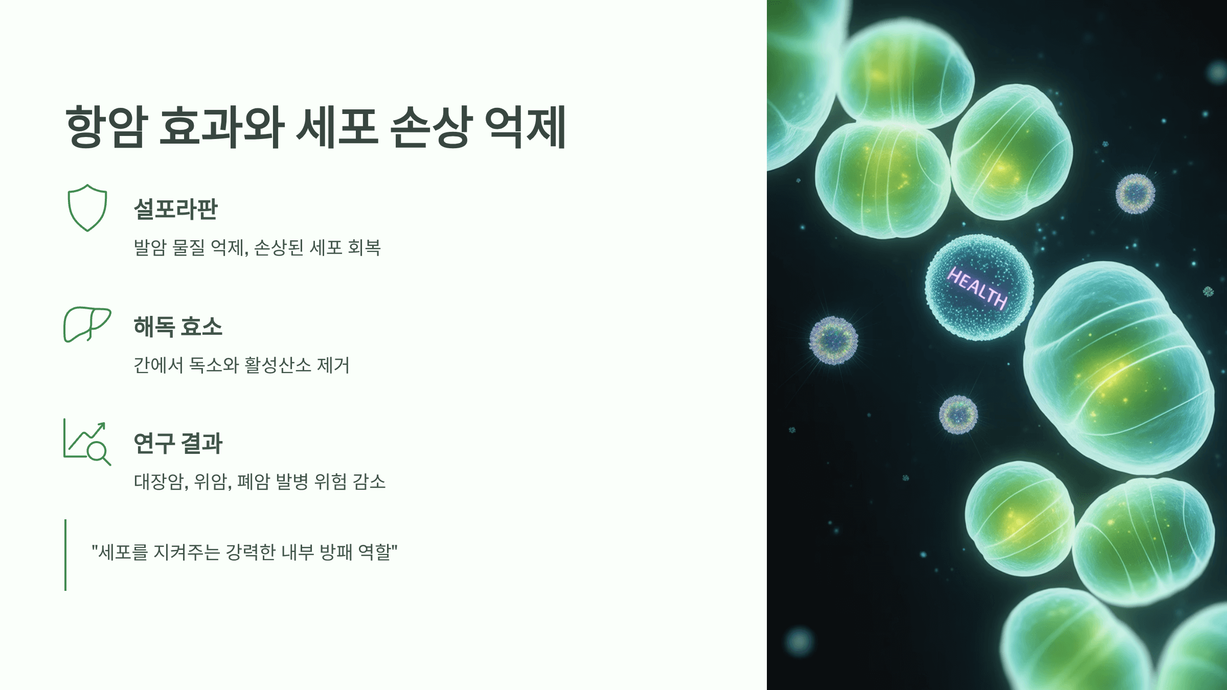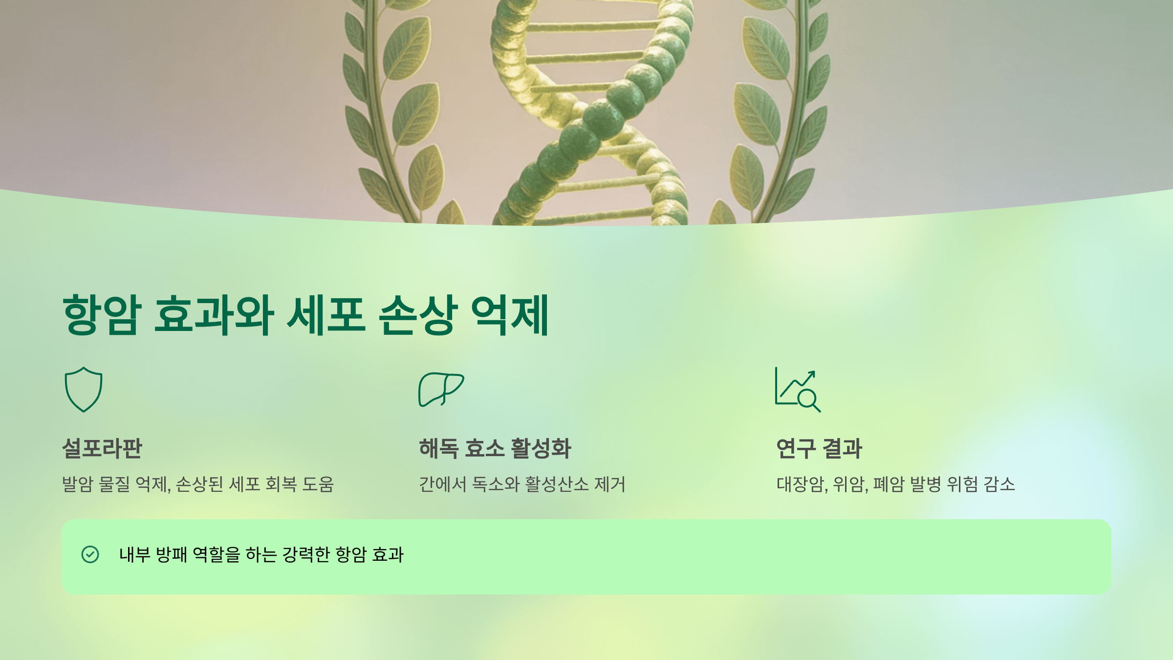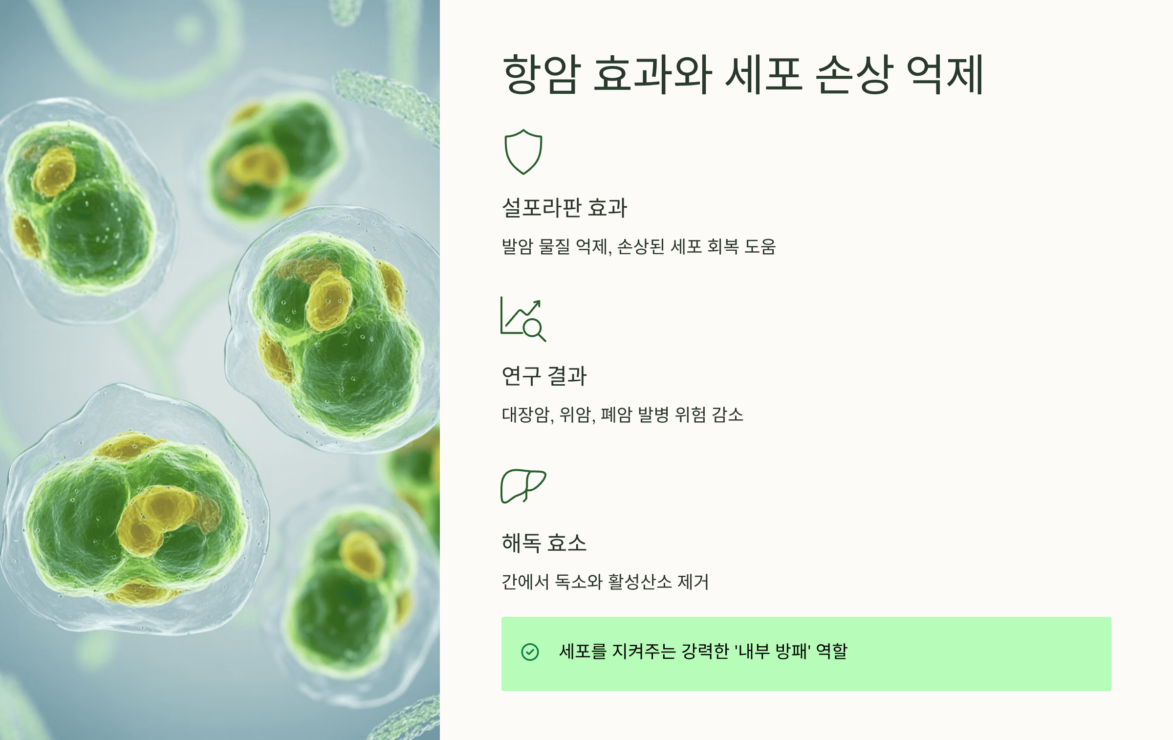 특히 설포라판은 간에서 해독 효소를 활성화해 몸속 독소와 활성산소를 제거하는 데도 탁월합니다. 즉, 단순한 예방이 아니라 세포를 지켜주는 강력한 ‘내부 방패’ 역할을 한다고 할 수 있어요.