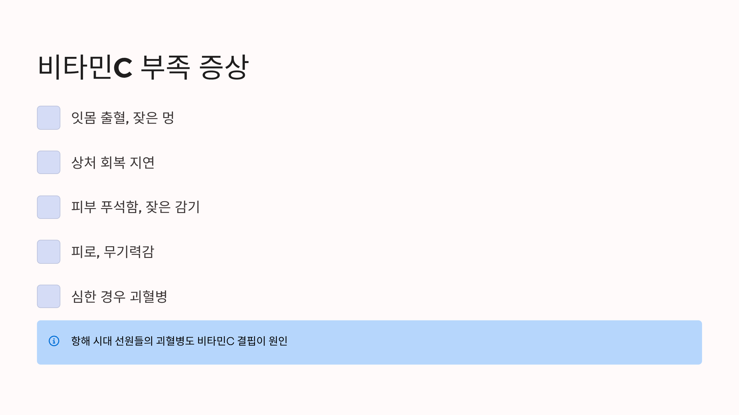 예전 항해 시대에 과일과 채소를 못 먹은 선원들이 괴혈병에 걸린 것도 비타민C 결핍 때문이었죠.