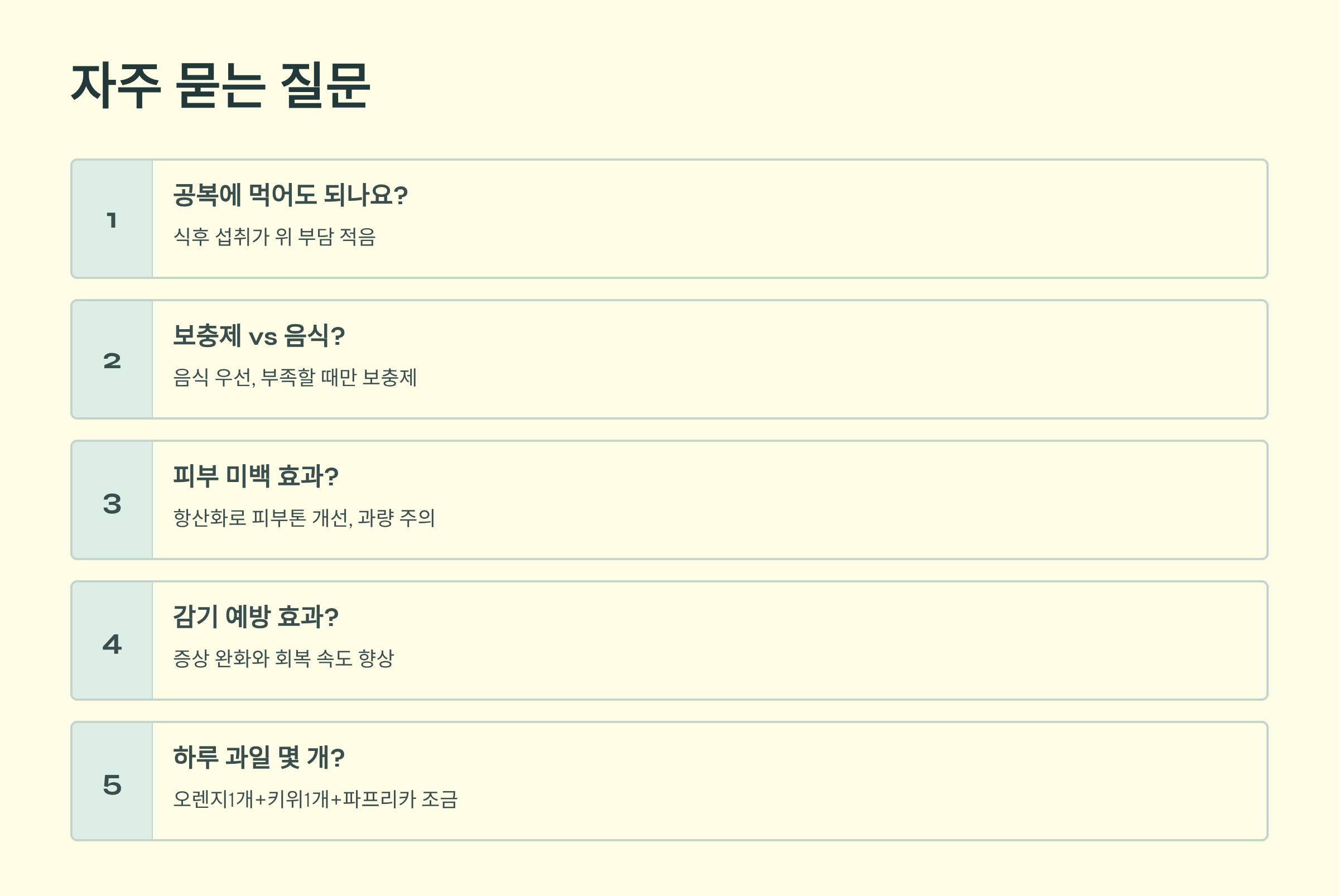 🌟 결론적으로, 비타민C 하루 권장량은 성인 기준 100mg이며, 과일·채소를 통해 손쉽게 충족할 수 있습니다. 저는 아침에 키위, 점심에 샐러드, 저녁에 파프리카를 곁들여 먹으면서 피부도 좋아지고 피로도 줄었어요. 여러분은 비타민C를 어떤 방법으로 챙기고 계신가요? 🍊