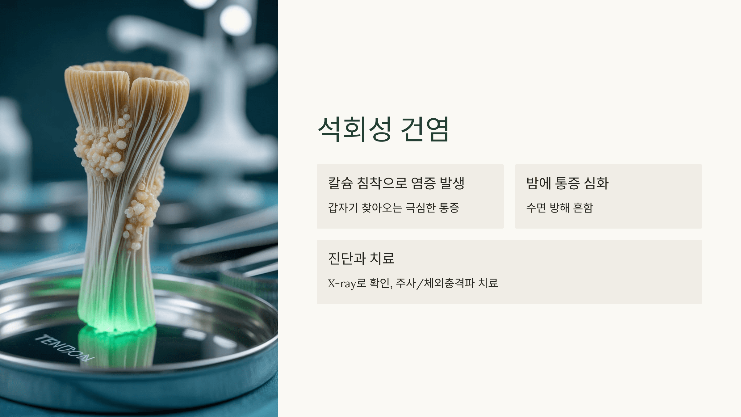 어깨 힘줄에 칼슘이 침착되면서 염증이 생기는 질환입니다. 갑자기 찾아오는 극심한 통증이 특징인데, 저는 한번 어깨를 거의 움직이지 못할 정도로 아팠던 적이 있습니다. 특히 밤에 통증이 심해 잠을 설치기 쉬워요. X-ray 검사로 쉽게 확인할 수 있으며, 주사 치료나 체외충격파 치료 등으로 호전이 가능합니다.