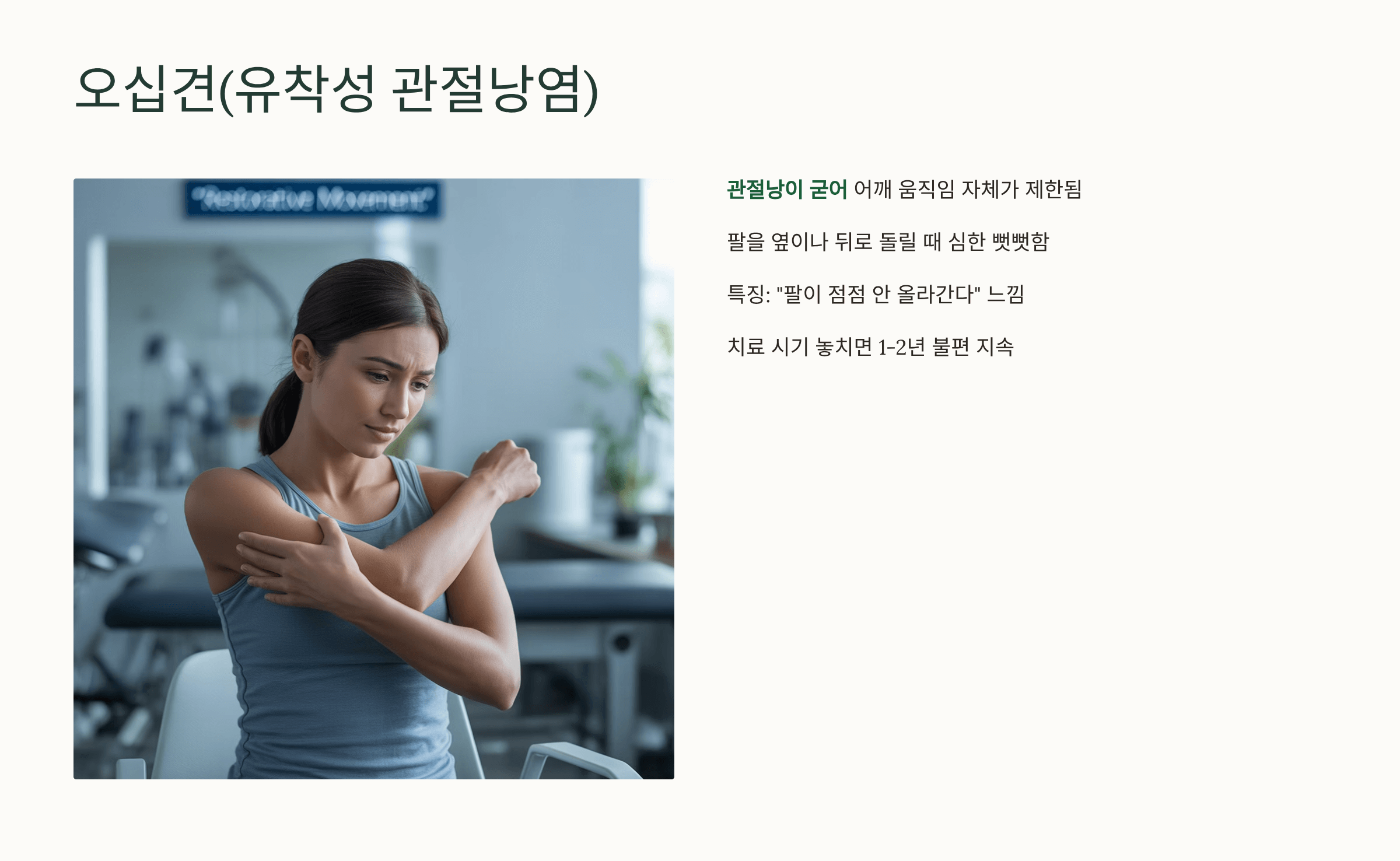 오십견은 단순히 통증만이 아니라 어깨의 가동 범위가 점점 줄어드는 것이 특징이라서 "팔이 점점 안 올라간다"는 느낌이 있으면 의심해야 합니다. 치료 시기를 놓치면 1~2년 이상 일상생활이 불편할 수 있습니다.