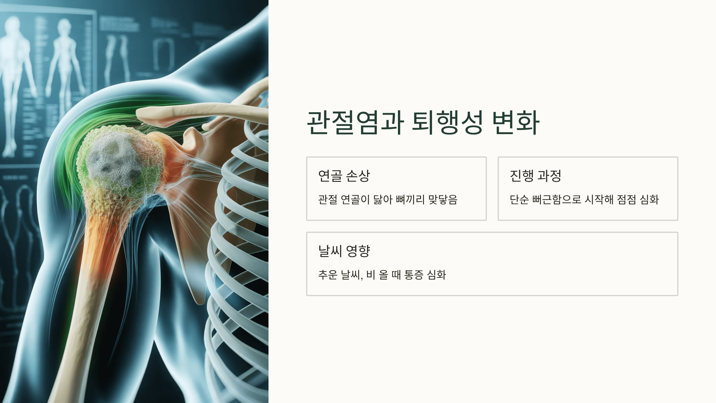 나이가 들면서 발생하는 퇴행성 관절염도 어깨 통증의 큰 원인입니다. 관절을 이루는 연골이 닳아 없어지면서 뼈끼리 맞닿아 통증이 발생하는데, 초기에는 단순한 뻐근함으로 시작해 점점 심해집니다.
