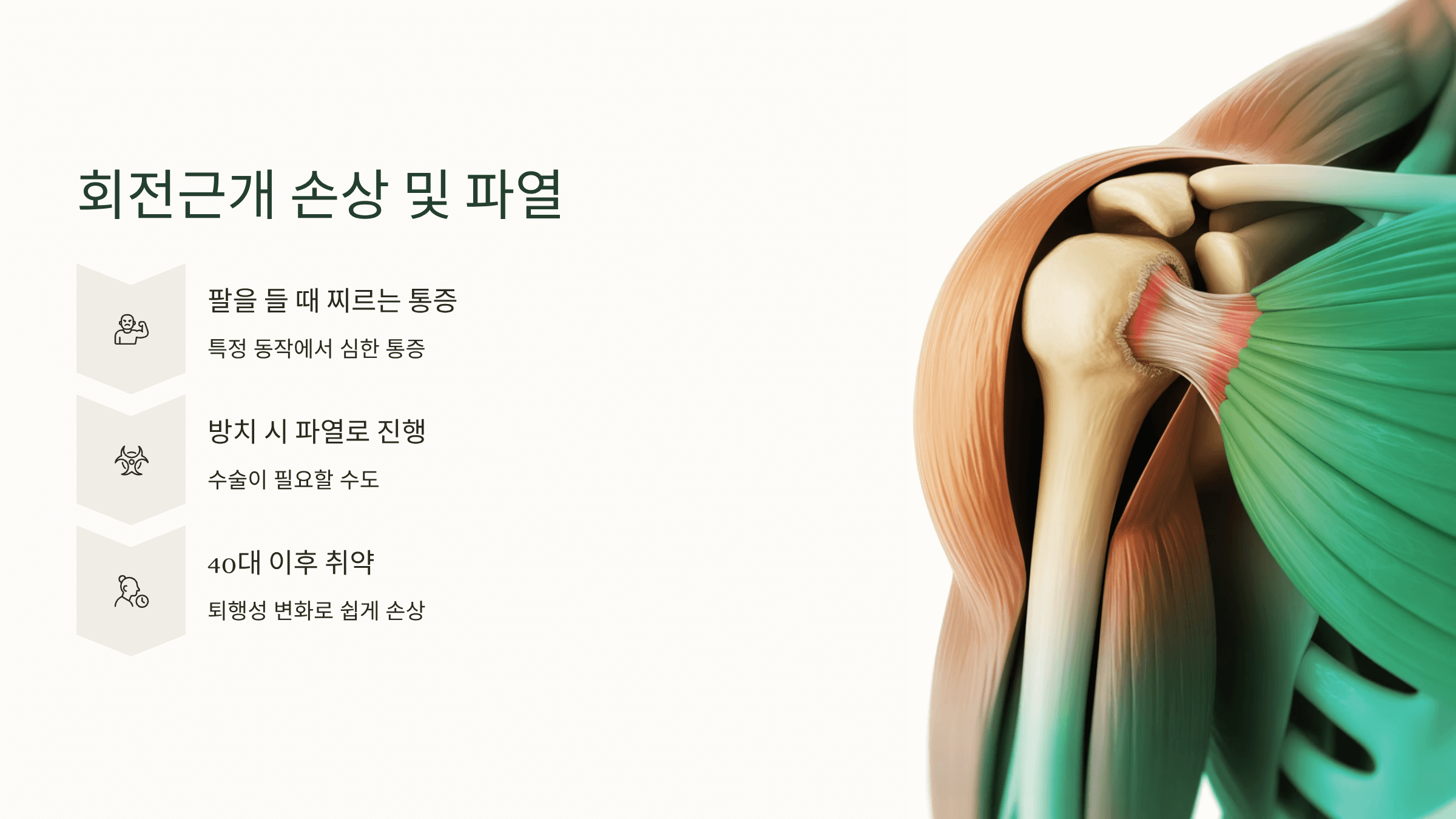 실제로 회전근개는 40대 이후 퇴행성 변화로 약해지기 시작해 작은 충격에도 쉽게 손상될 수 있습니다. 그래서 중년 이후에 어깨 통증이 잦다면 반드시 회전근개 검사를 받아보시는 걸 권장드립니다.