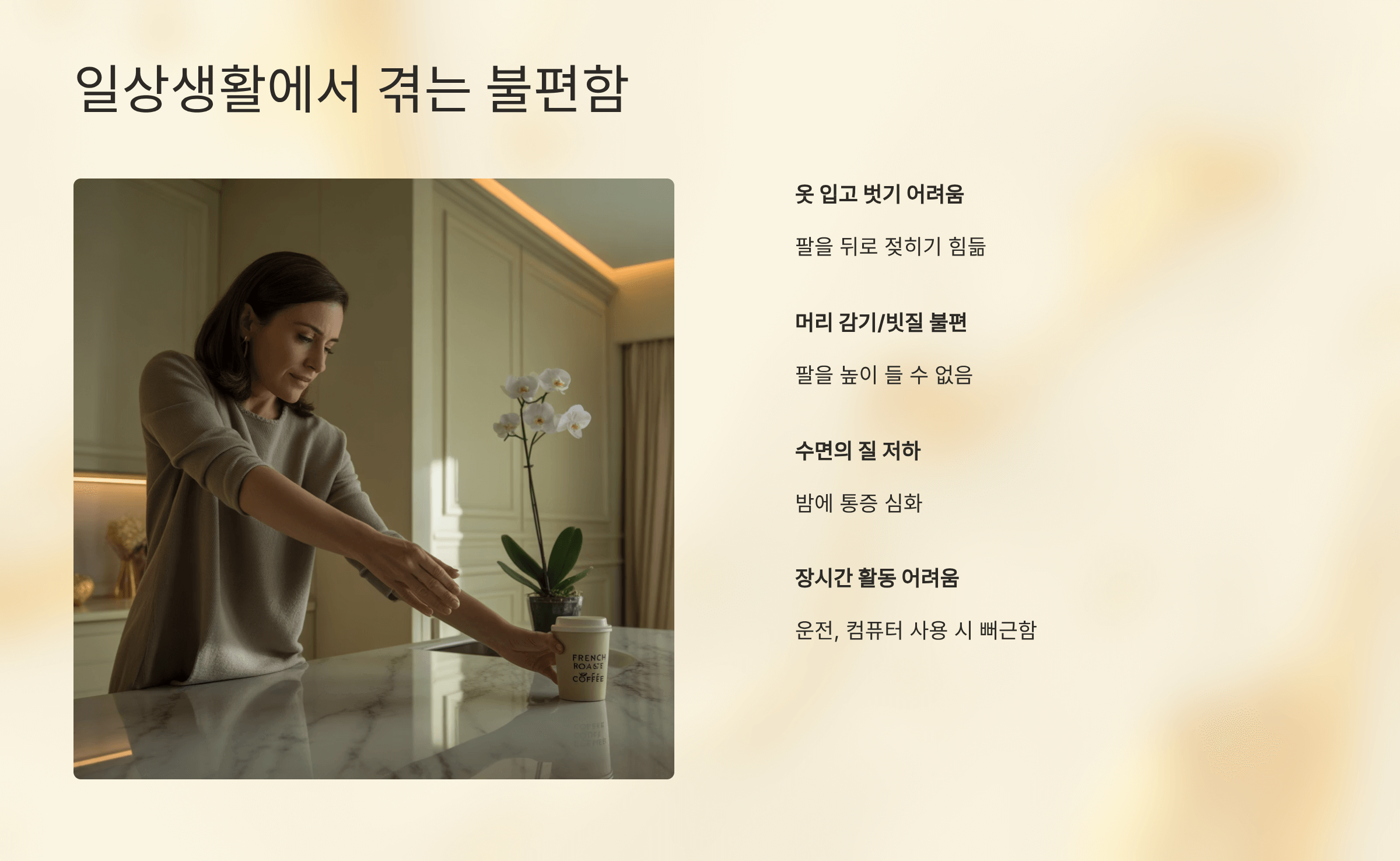 오십견은 단순히 어깨만 불편한 게 아니라 생활 전반에 영향을 줍니다.