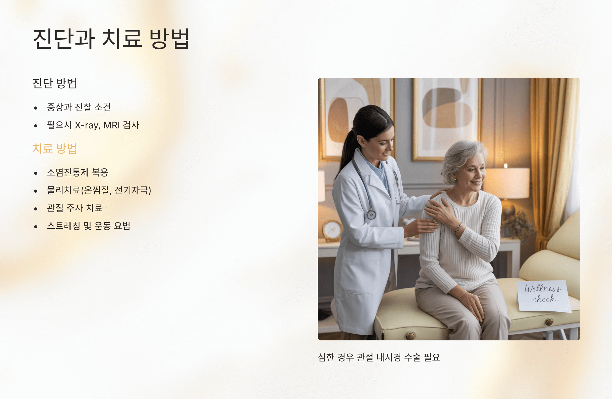 또한, 통증은 줄어드는 듯하지만 움직임 제한이 심해져 일상생활 불편이 극대화됩니다. 저는 머리카락을 묶을 수 없어서 한동안 짧은 머리를 유지해야 했던 경험이 있습니다.
