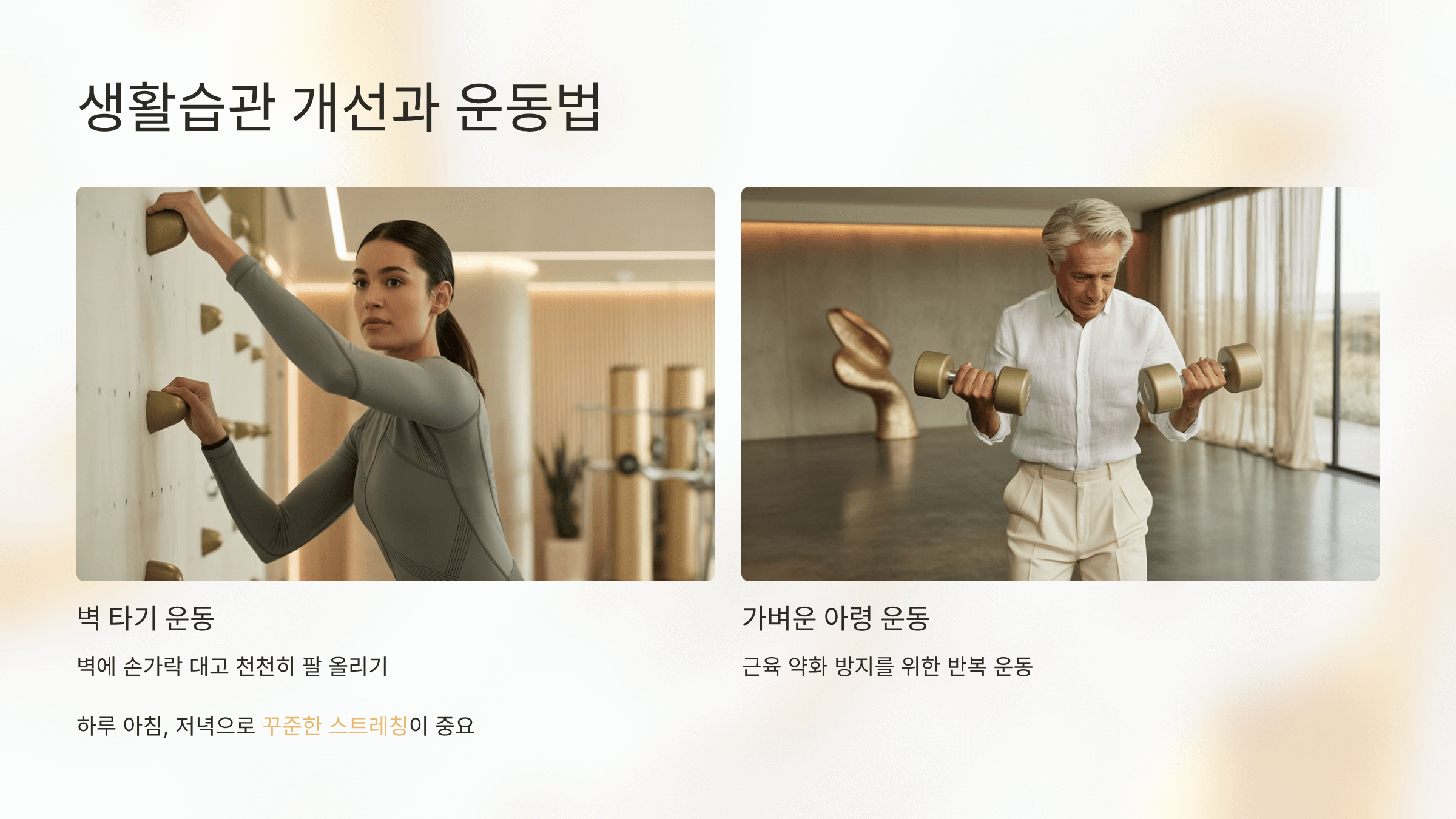 오십견은 누구에게나 찾아올 수 있지만, 생활 습관을 관리하면 예방할 수 있습니다.