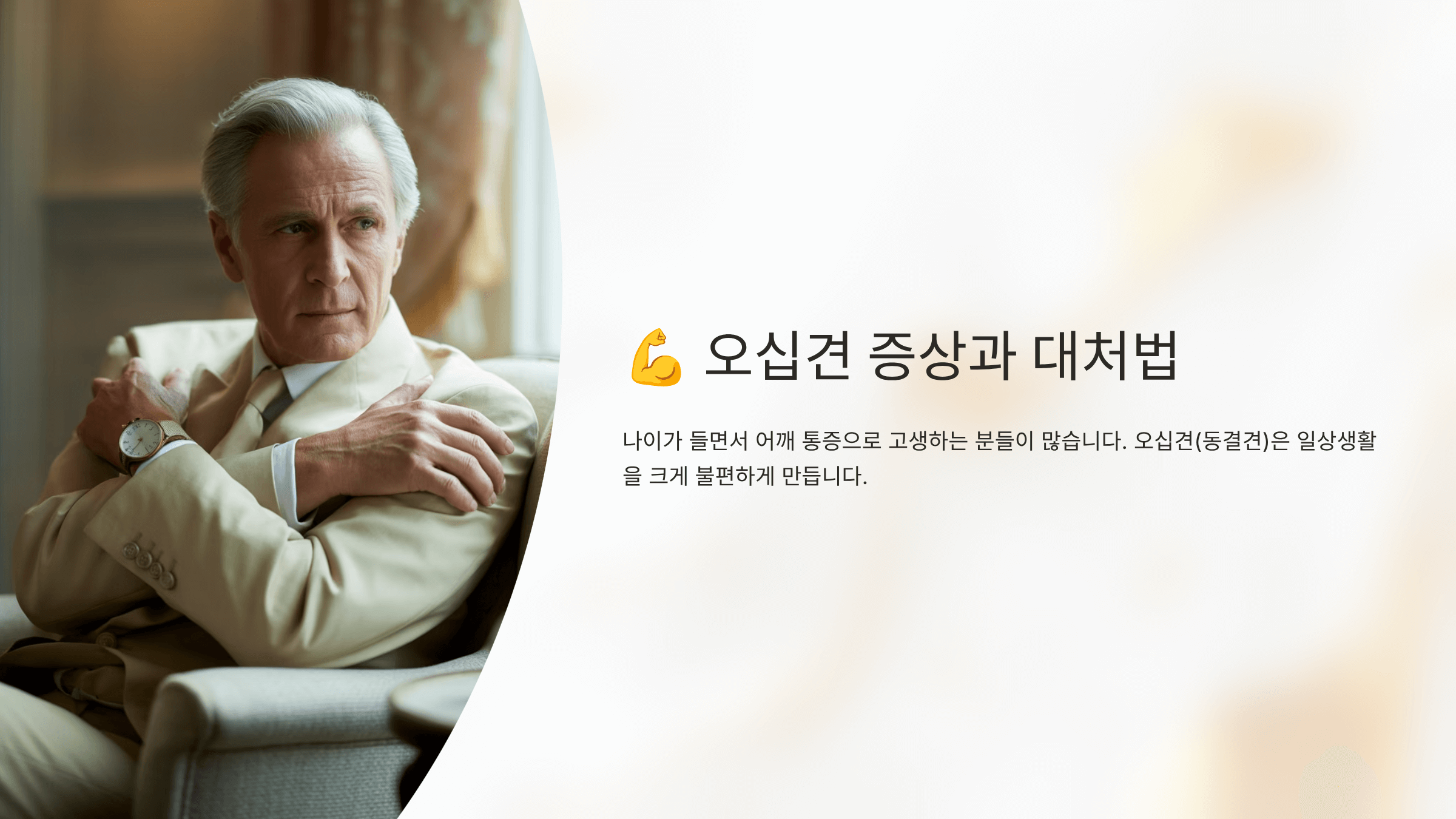 저는 오십견 때문에 일상이 크게 불편했지만, 꾸준한 스트레칭과 관리로 다시 편하게 팔을 움직일 수 있게 되었습니다. “시간이 지나면 괜찮아진다”는 말만 믿기보다, 적절한 치료와 운동을 병행하는 것이 빠른 회복의 비결임을 직접 체감했습니다.