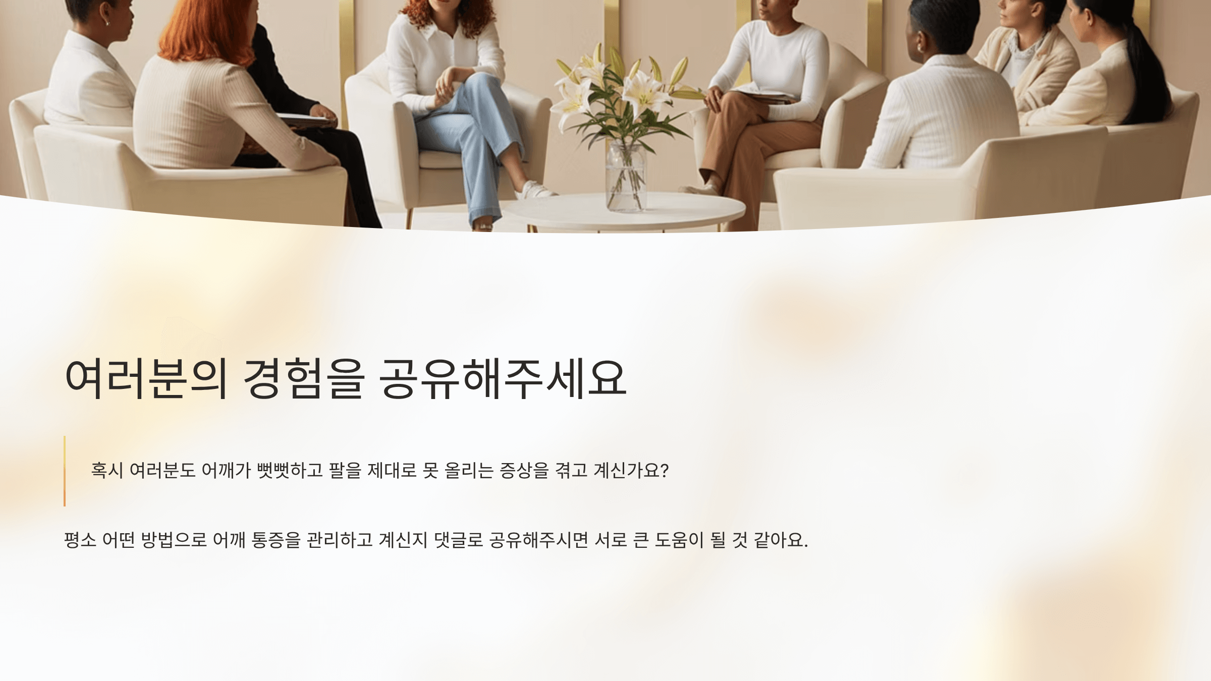 혹시 여러분도 어깨가 뻣뻣하고 팔을 제대로 못 올리는 증상을 겪고 계신가요? 평소 어떤 방법으로 어깨 통증을 관리하고 계신지 댓글로 공유해주시면 서로 큰 도움이 될 것 같아요.