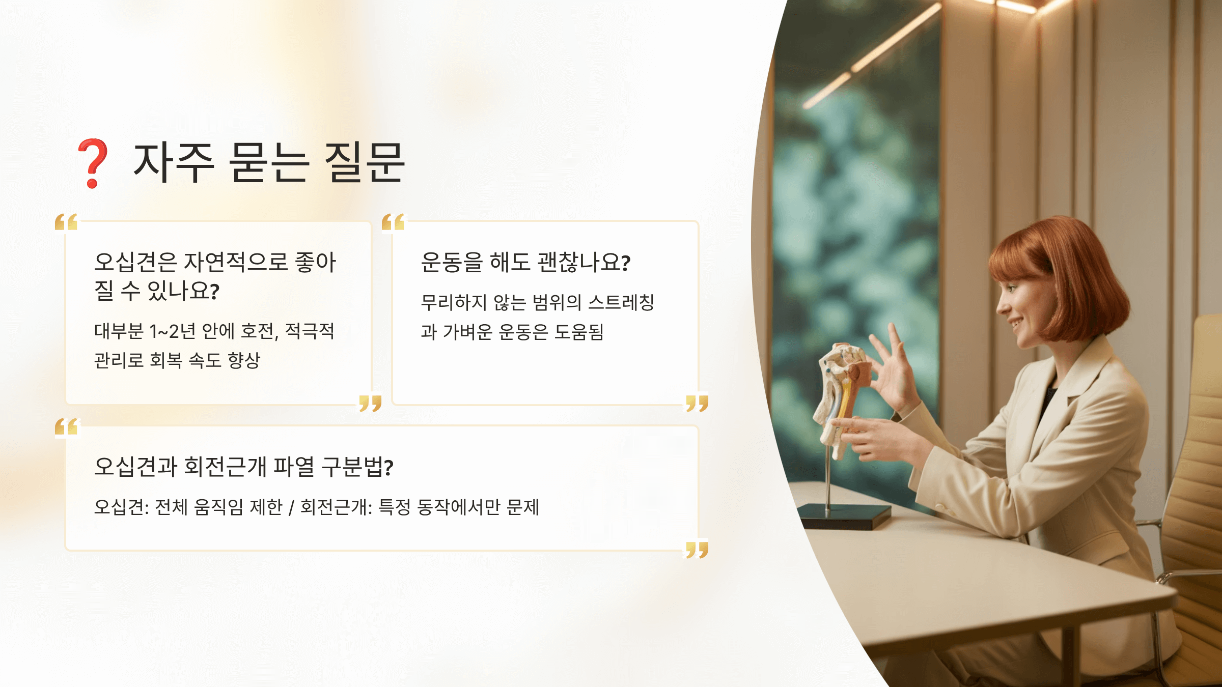 오십견은 움직임 전체가 제한되지만, 회전근개 파열은 특정 동작에서만 힘이 빠지거나 통증이 심합니다.