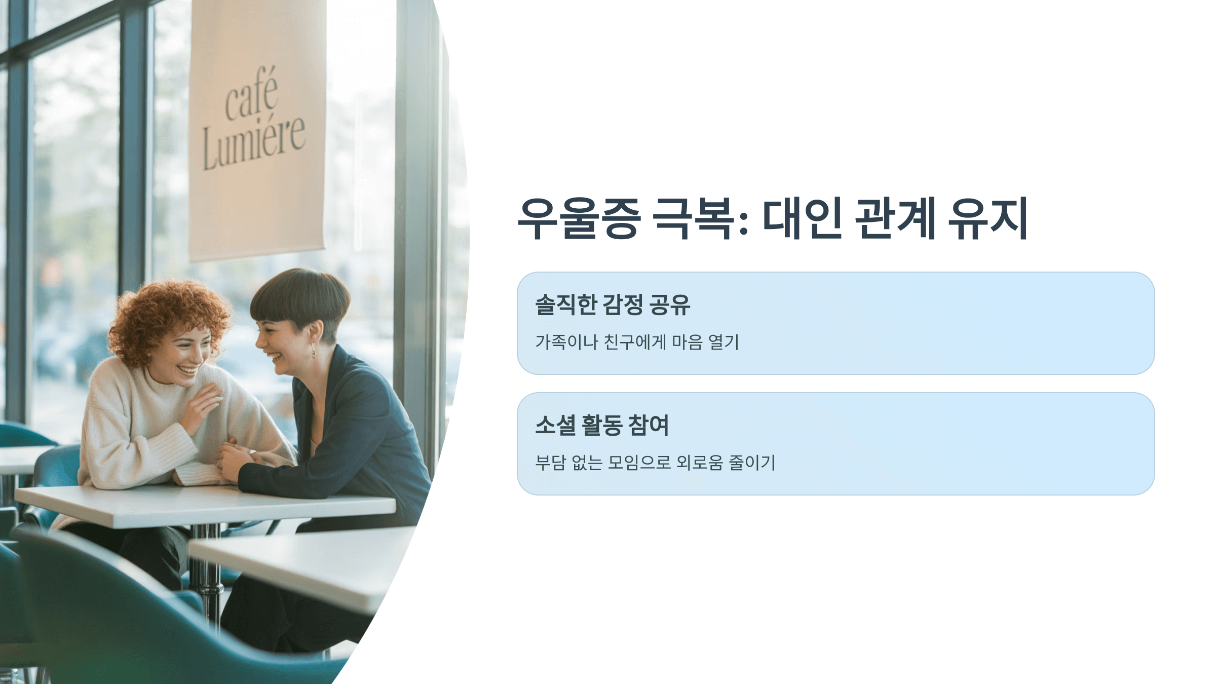 - 부담스럽지 않은 모임이나 소셜 활동으로 외로움 줄이기.
