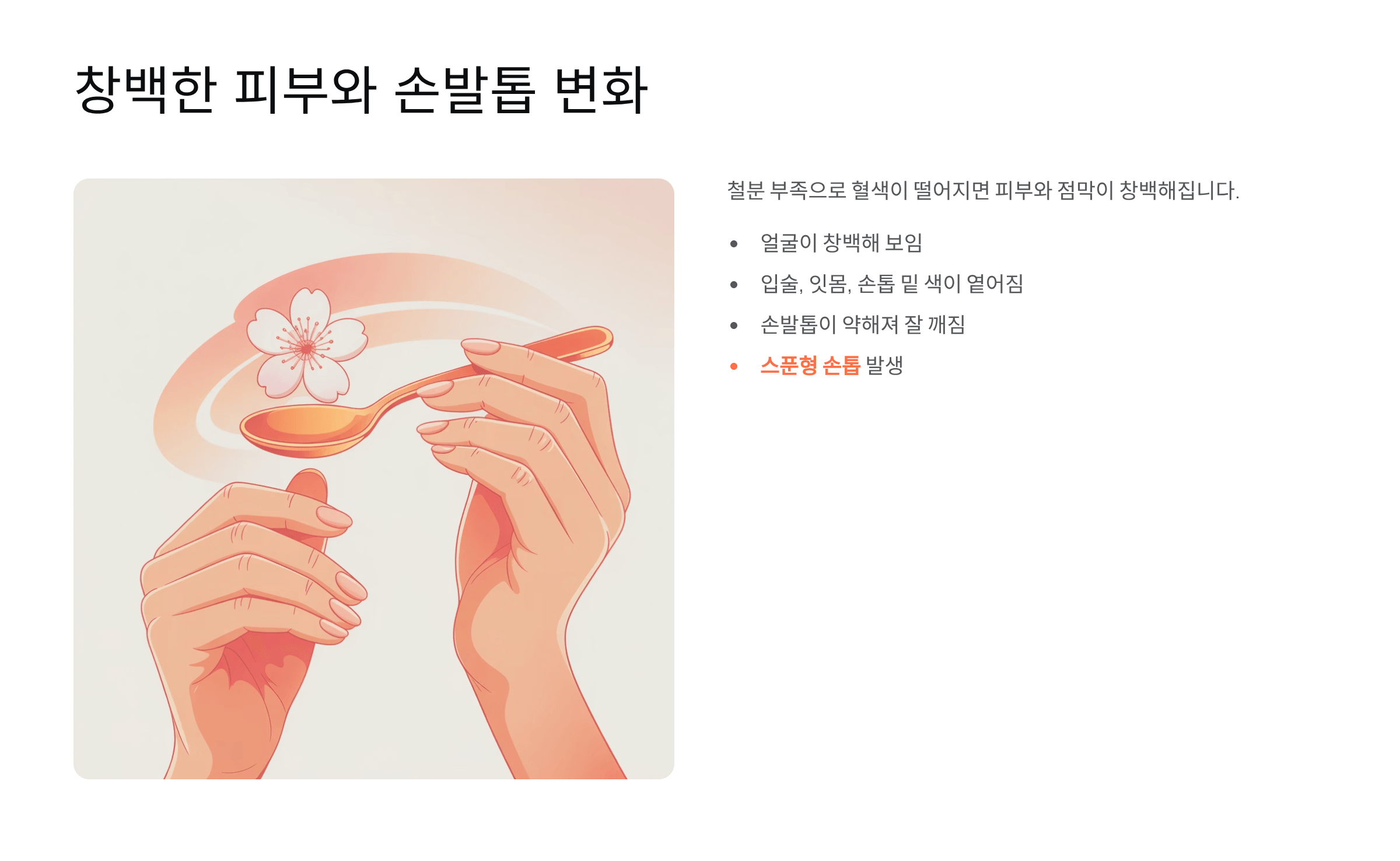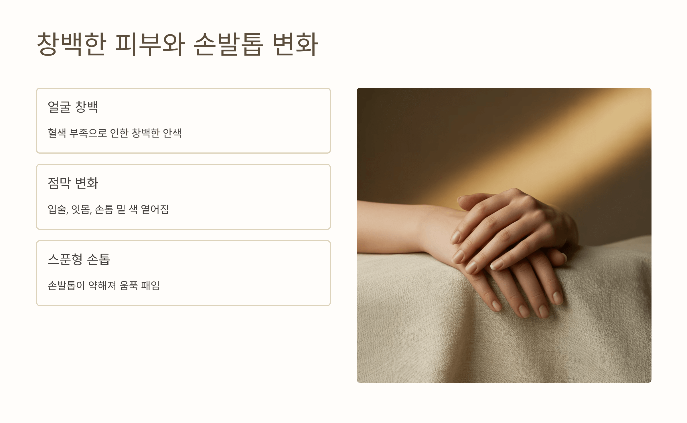 철분 부족으로 혈색이 떨어지면 피부와 점막이 창백해집니다.