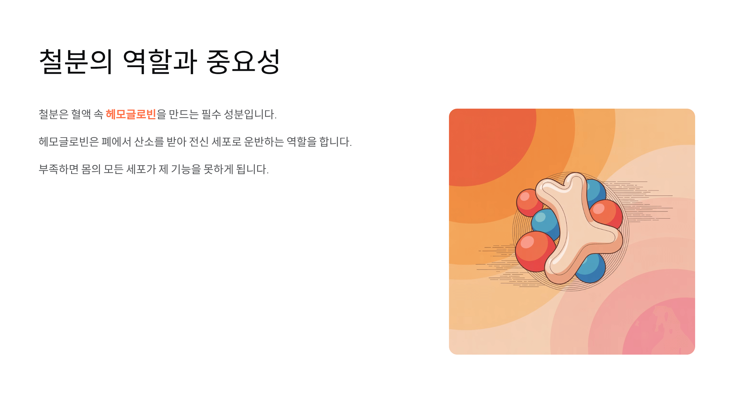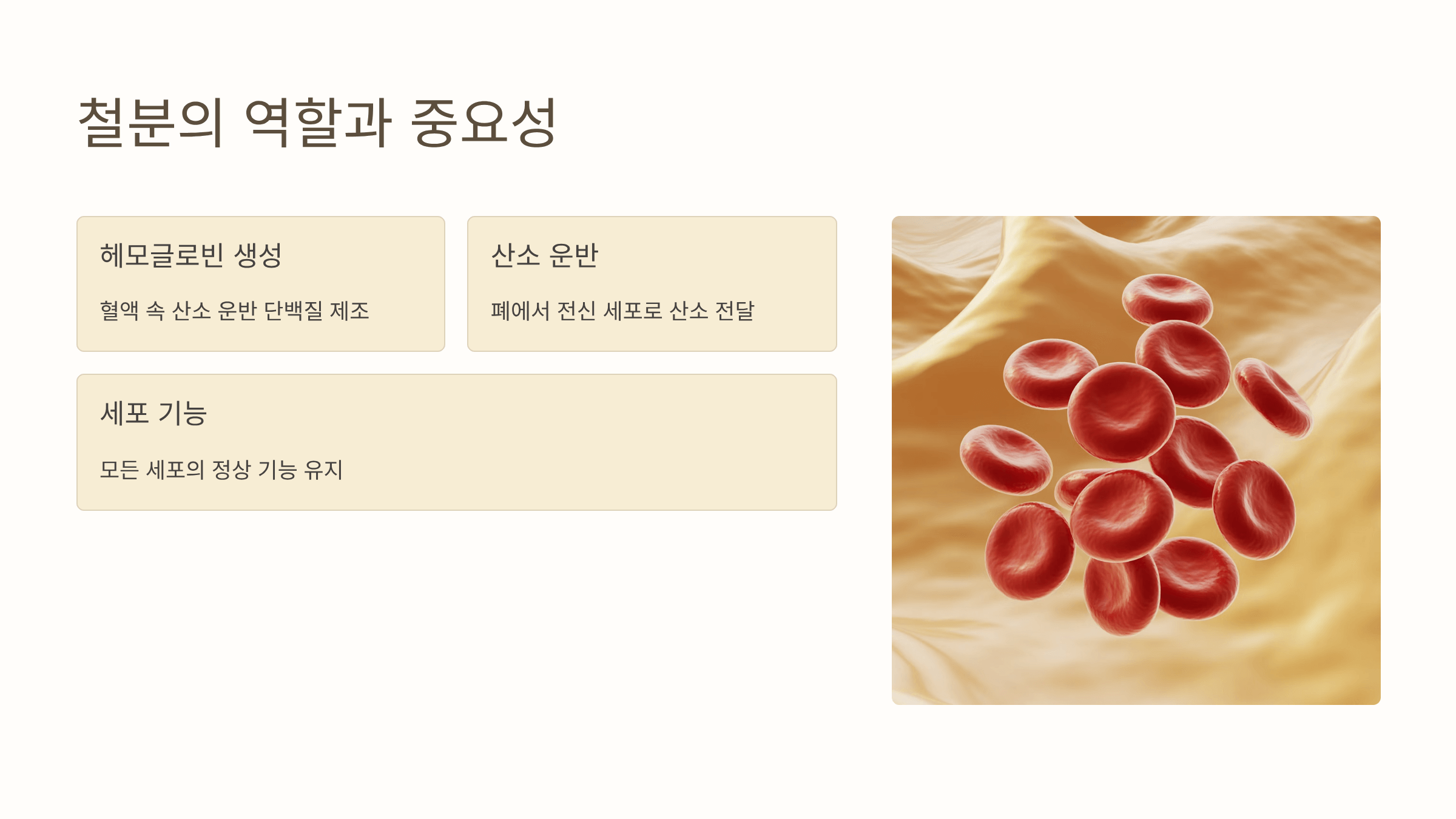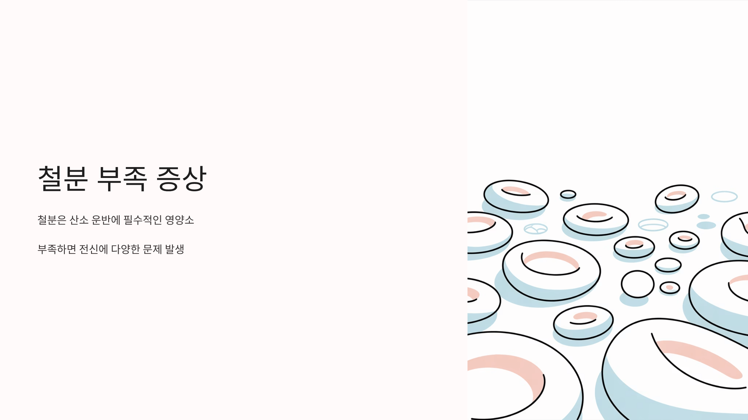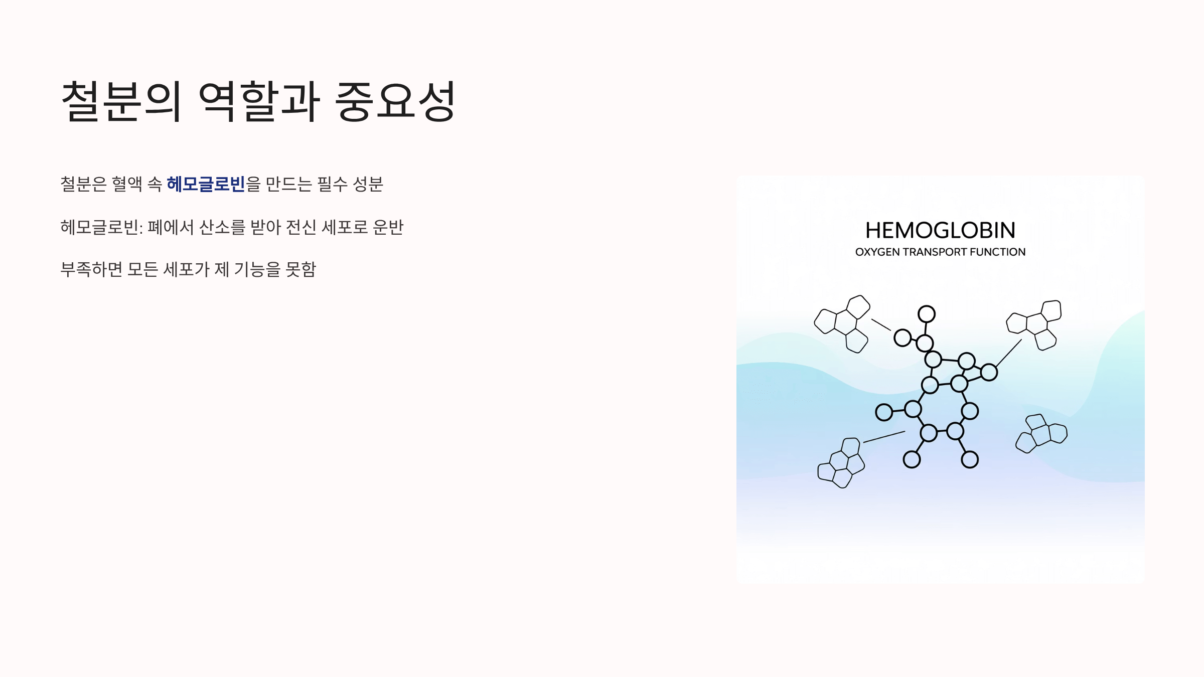 철분은 혈액 속 헤모글로빈을 만드는 데 꼭 필요한 성분입니다. 헤모글로빈은 폐에서 산소를 받아 전신 세포로 운반하는 역할을 하죠. 부족하면 몸의 모든 세포가 제 기능을 못하기 때문에 다양한 증상이 나타납니다.