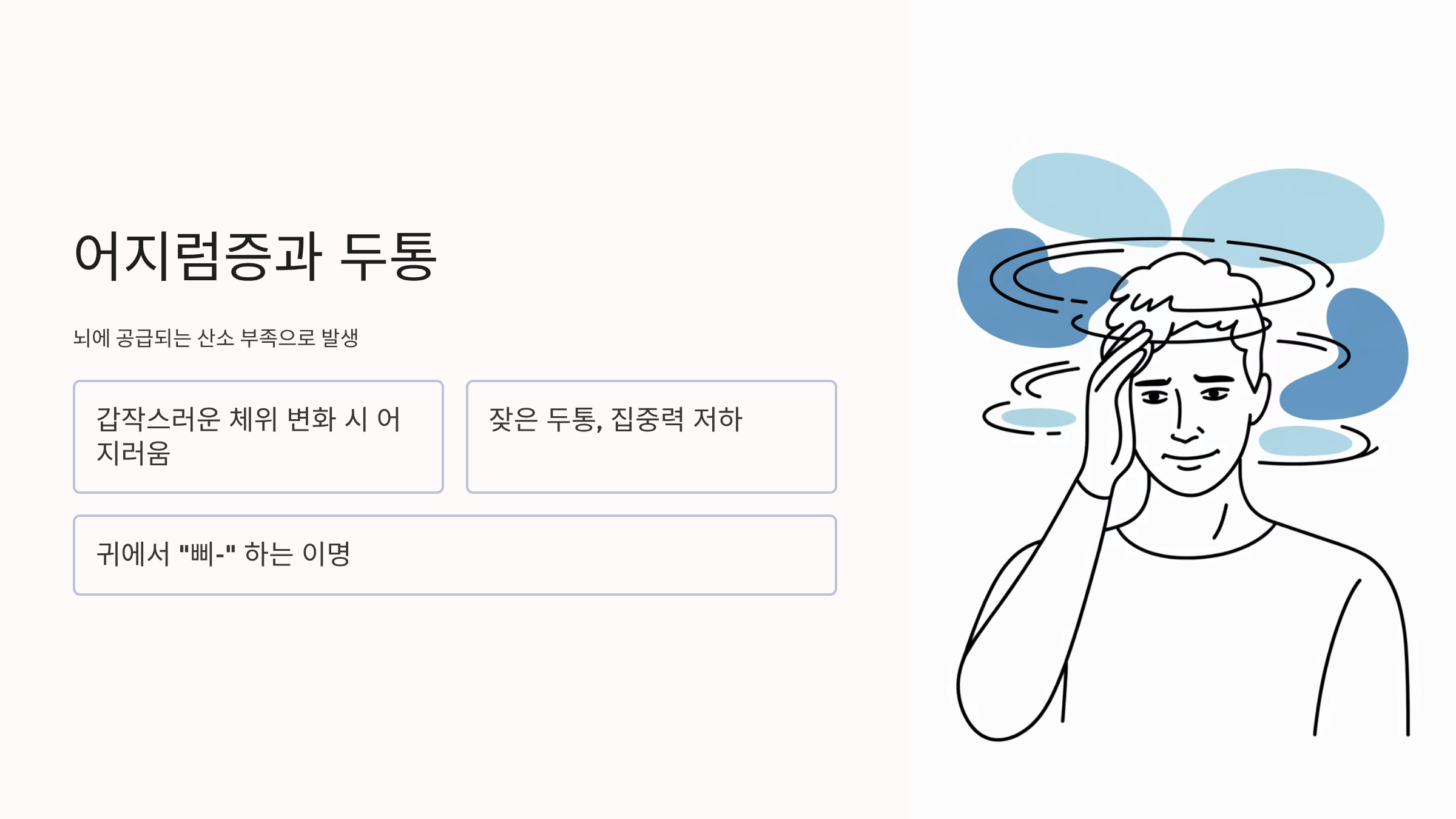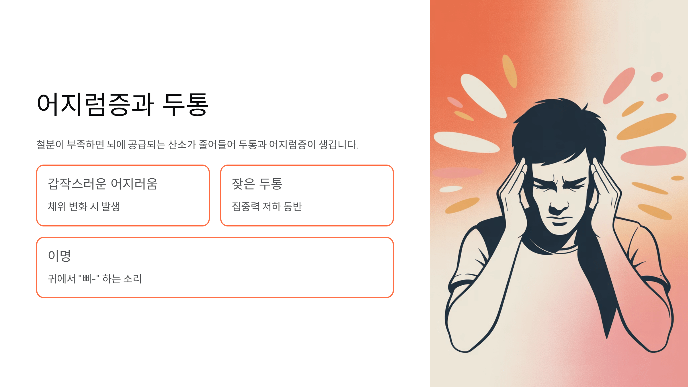 철분이 부족하면 뇌에 공급되는 산소가 줄어들어 두통과 어지럼증이 생깁니다.