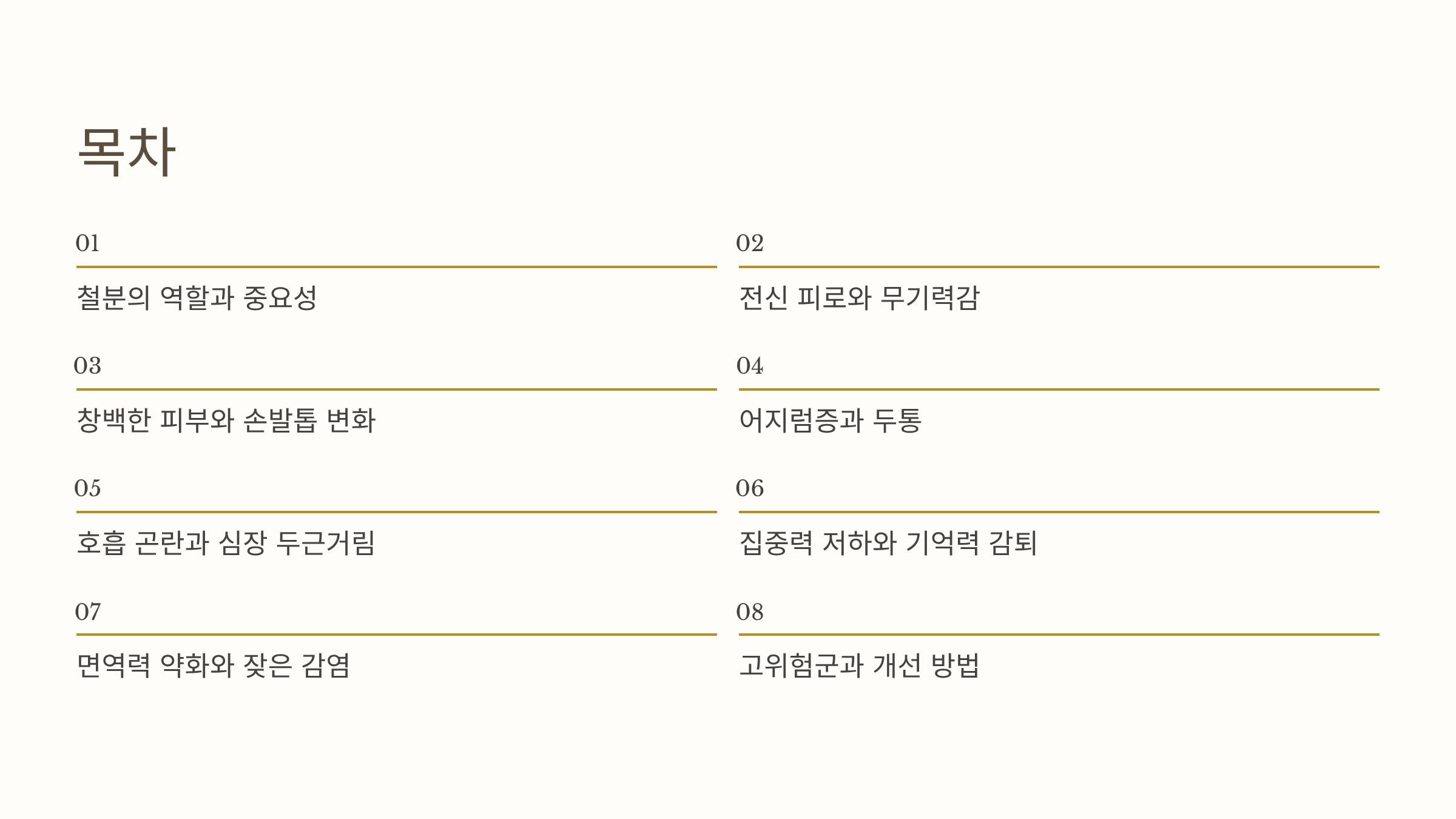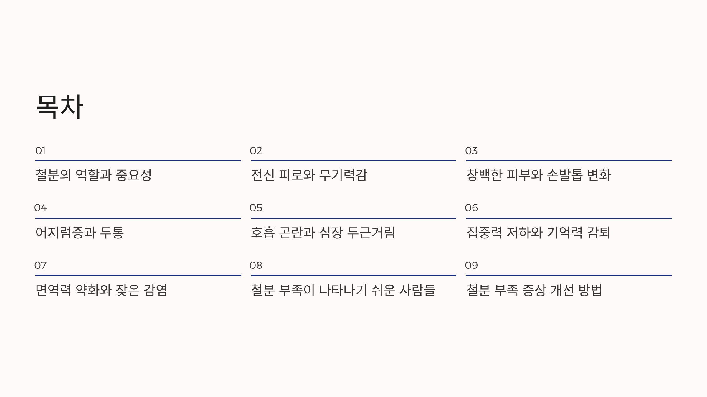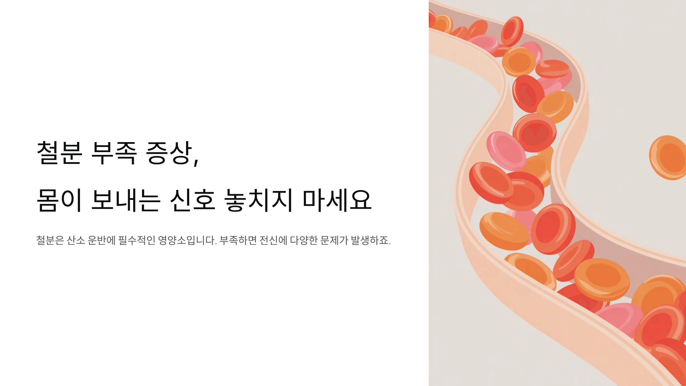 철분은 우리 몸에서 산소를 운반하는 데 꼭 필요한 영양소입니다. 하지만 부족할 경우 피곤함은 물론이고 전신에 다양한 문제가 생기죠. 저도 예전에 이유 없이 피곤하고 어지러웠는데, 건강검진에서 철분 부족(빈혈)이라는 결과를 받아본 적이 있어요. 그때 제대로 관리하지 않았다면 더 큰 질환으로 이어졌을 거라는 생각이 들더라고요. 오늘은 철분 부족 증상을 하나하나 짚어드리겠습니다.