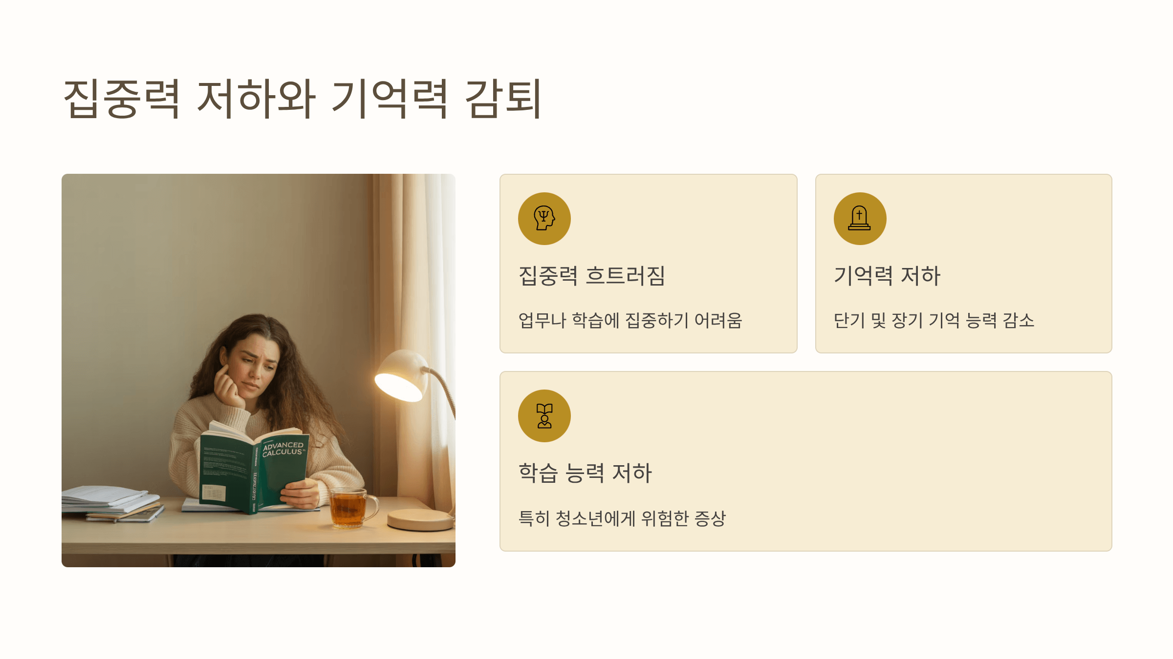- 학습 능력 저하 (특히 청소년에게 위험)