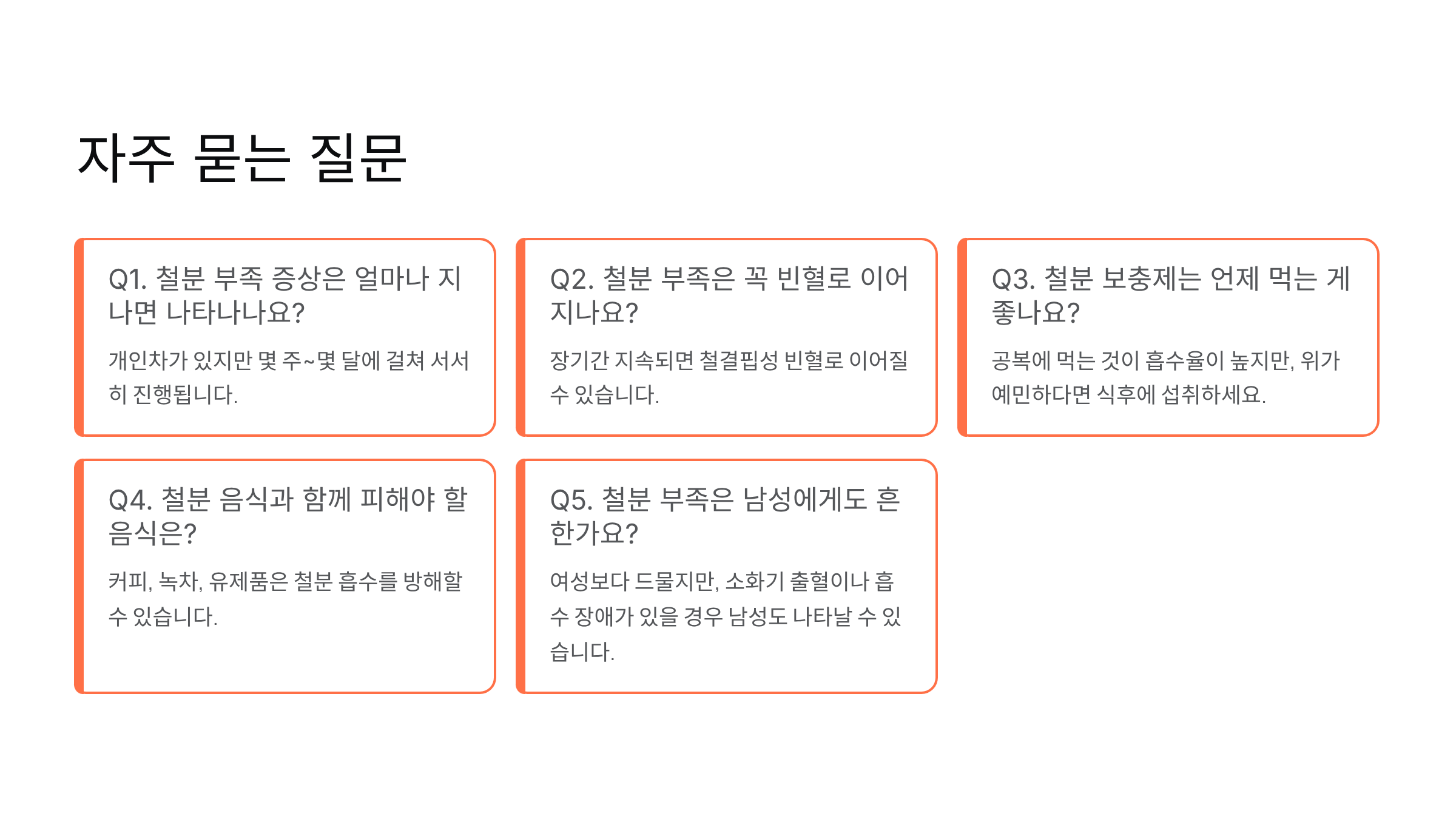 🌟 정리하자면, 철분 부족 증상은 피로·창백·어지럼증·호흡 곤란 등 몸이 보내는 경고 신호입니다. 이를 무시하지 말고 식단 관리와 보충제를 통해 적극적으로 관리해야 해요. 저도 그 경험 덕분에 건강을 다시 챙길 수 있었답니다.