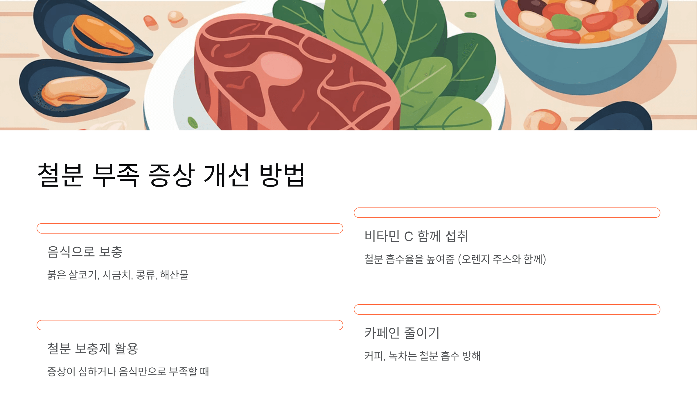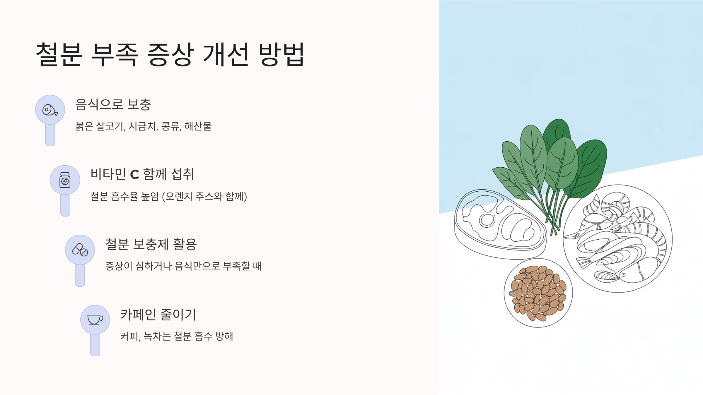 - 철분 보충제 활용: 증상이 심하거나 음식만으로 부족할 때 필요