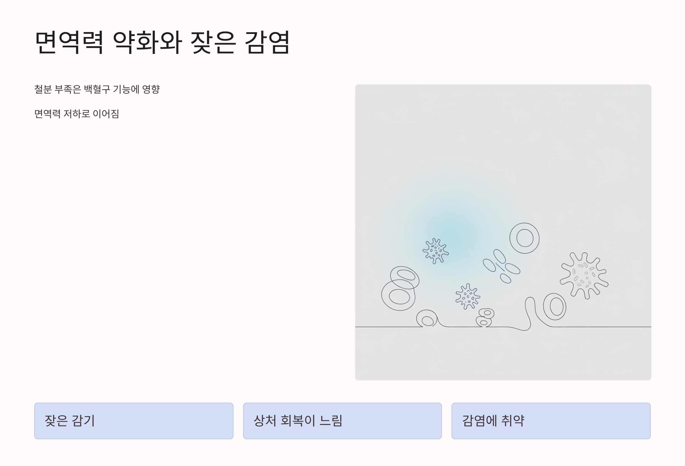 철분 부족은 백혈구 기능에도 영향을 미쳐 면역력이 떨어집니다.