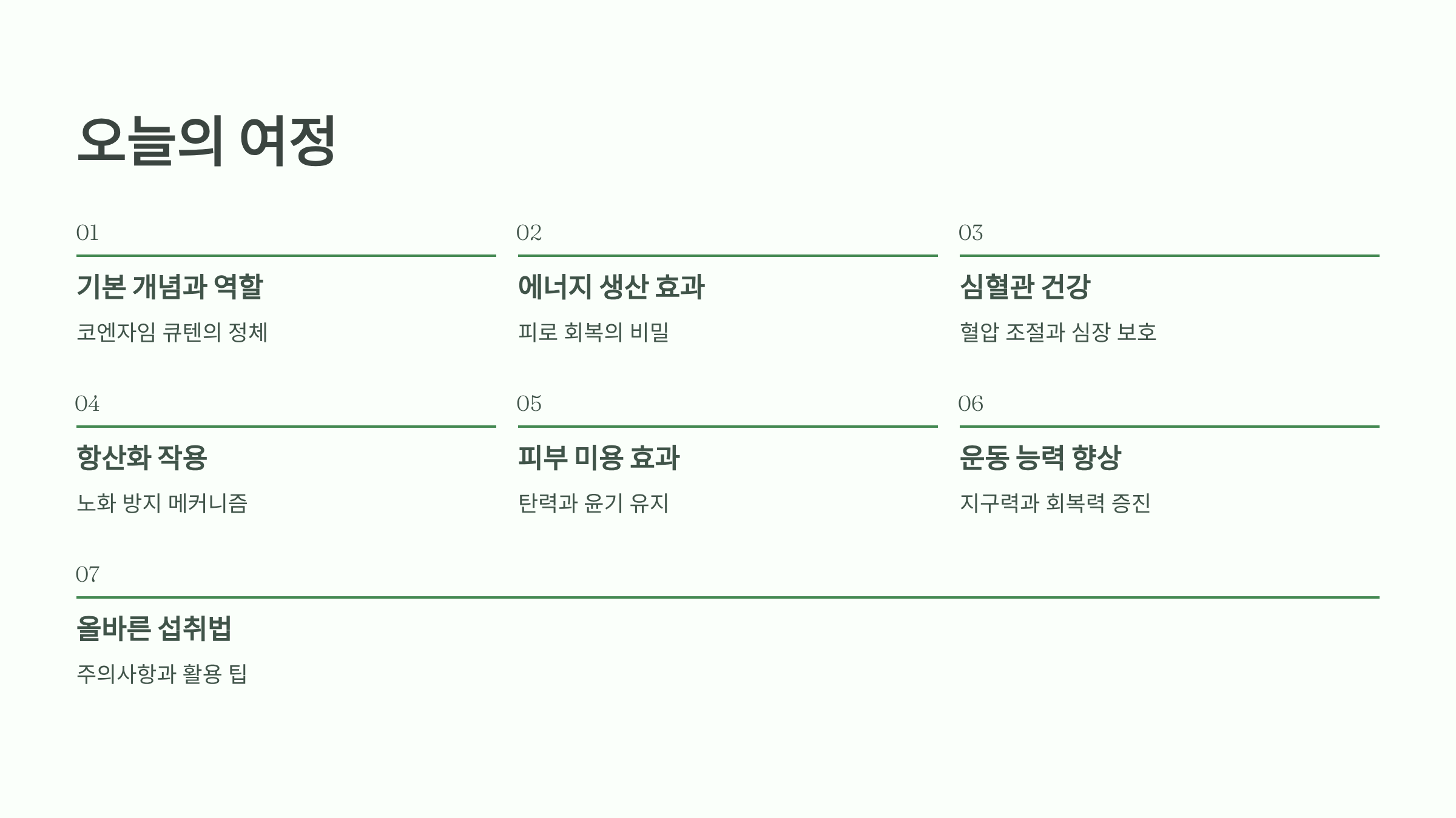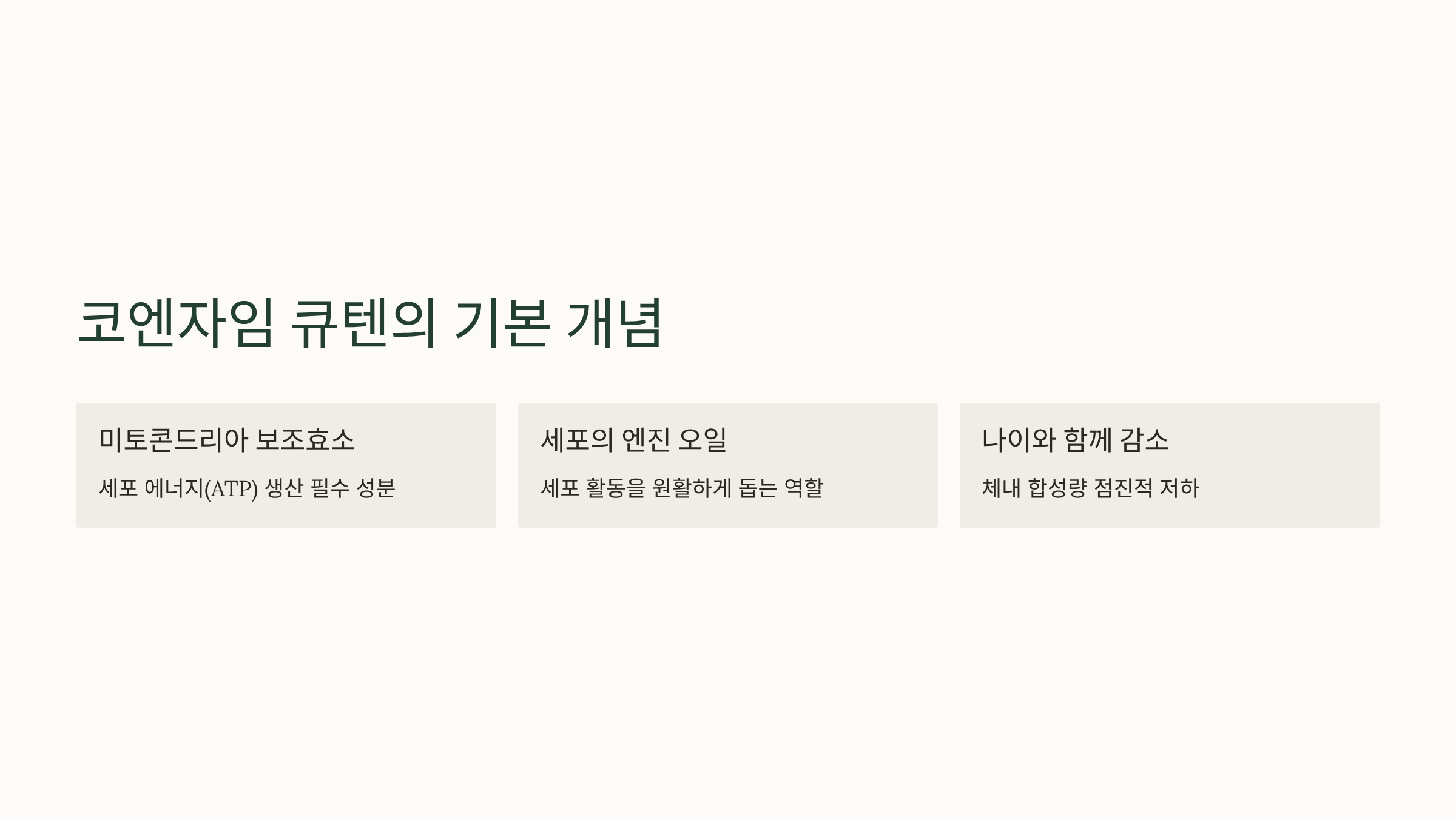 나이가 들수록 쉽게 피곤해지고 피부 탄력도 떨어지죠. 저도 예전엔 하루만 늦게 자도 다음날 기운이 하나도 없었는데, 코엔자임 큐텐을 챙기면서 확실히 활력이 달라진 걸 경험했어요. 오늘은 많은 분들이 궁금해하는 코엔자임 큐텐 효능을 자세히 알려드릴게요!
