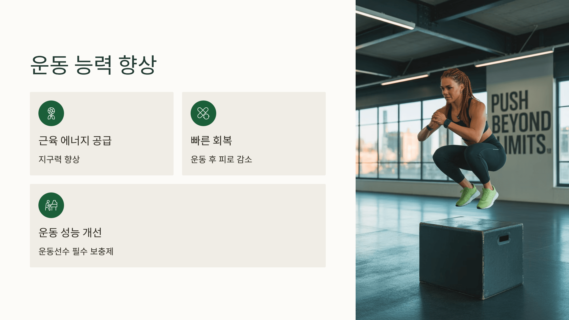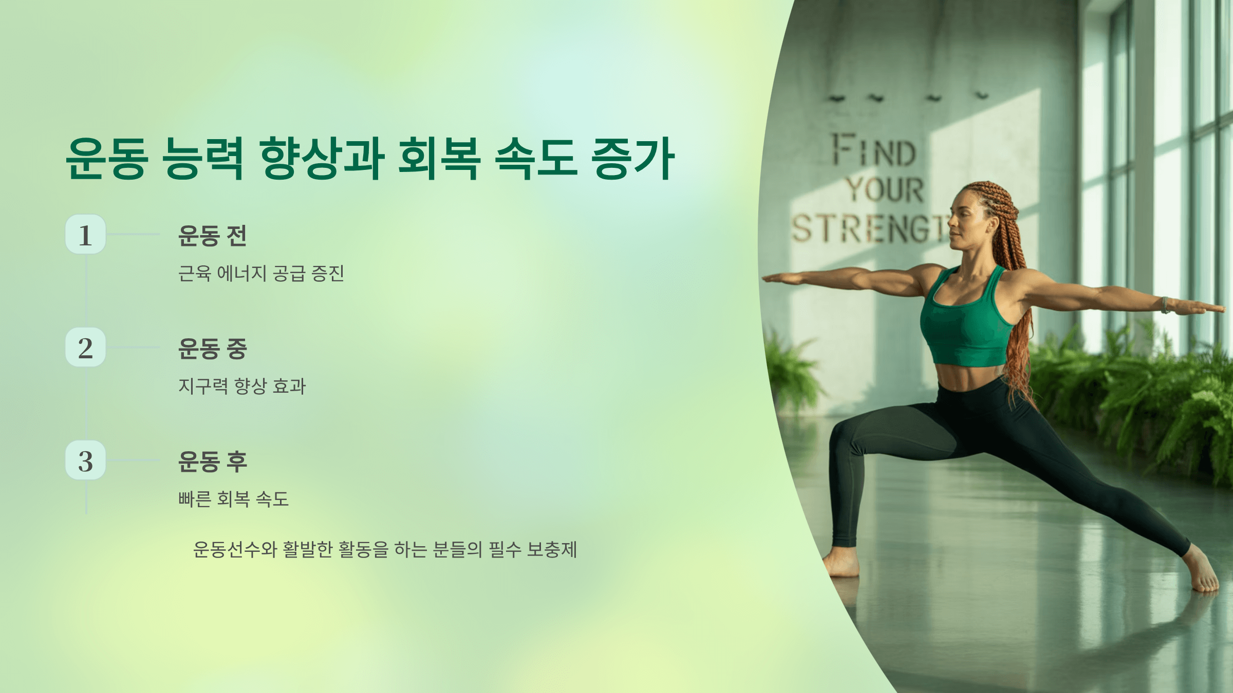 운동할 때도 코엔자임 큐텐이 큰 역할을 합니다. 근육이 필요한 에너지를 빠르게 공급해 지구력을 높이고, 운동 후 회복을 빠르게 해줍니다. 그래서 운동선수나 활발한 활동을 하는 분들이 보충제로 많이 섭취하죠.