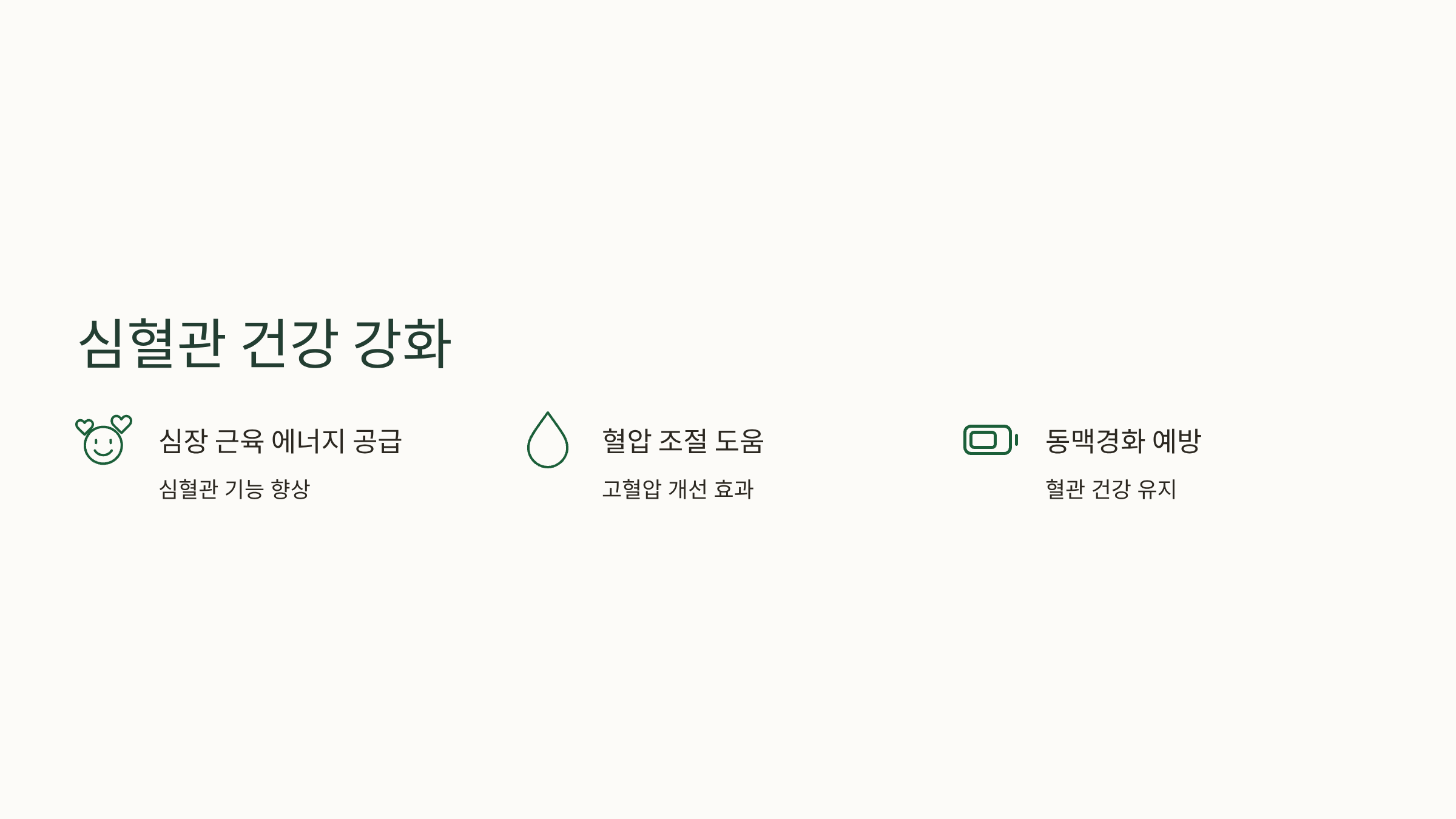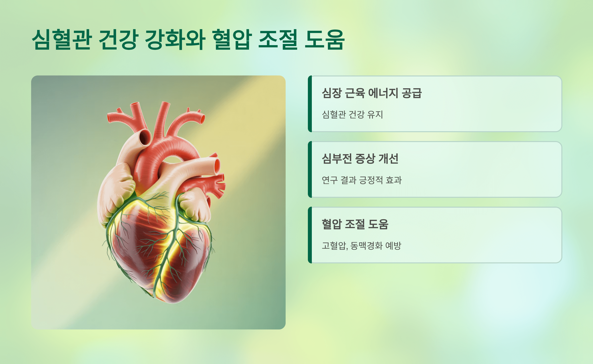 코엔자임 큐텐은 심장 근육에 에너지를 공급해 심혈관 건강을 지켜줍니다. 일부 연구에서는 심부전 환자의 증상 개선에도 긍정적인 효과가 보고되었고, 혈압을 낮추는 데도 도움을 줄 수 있다고 알려져 있습니다. 그래서 고혈압, 동맥경화 예방 차원에서도 주목받고 있어요.